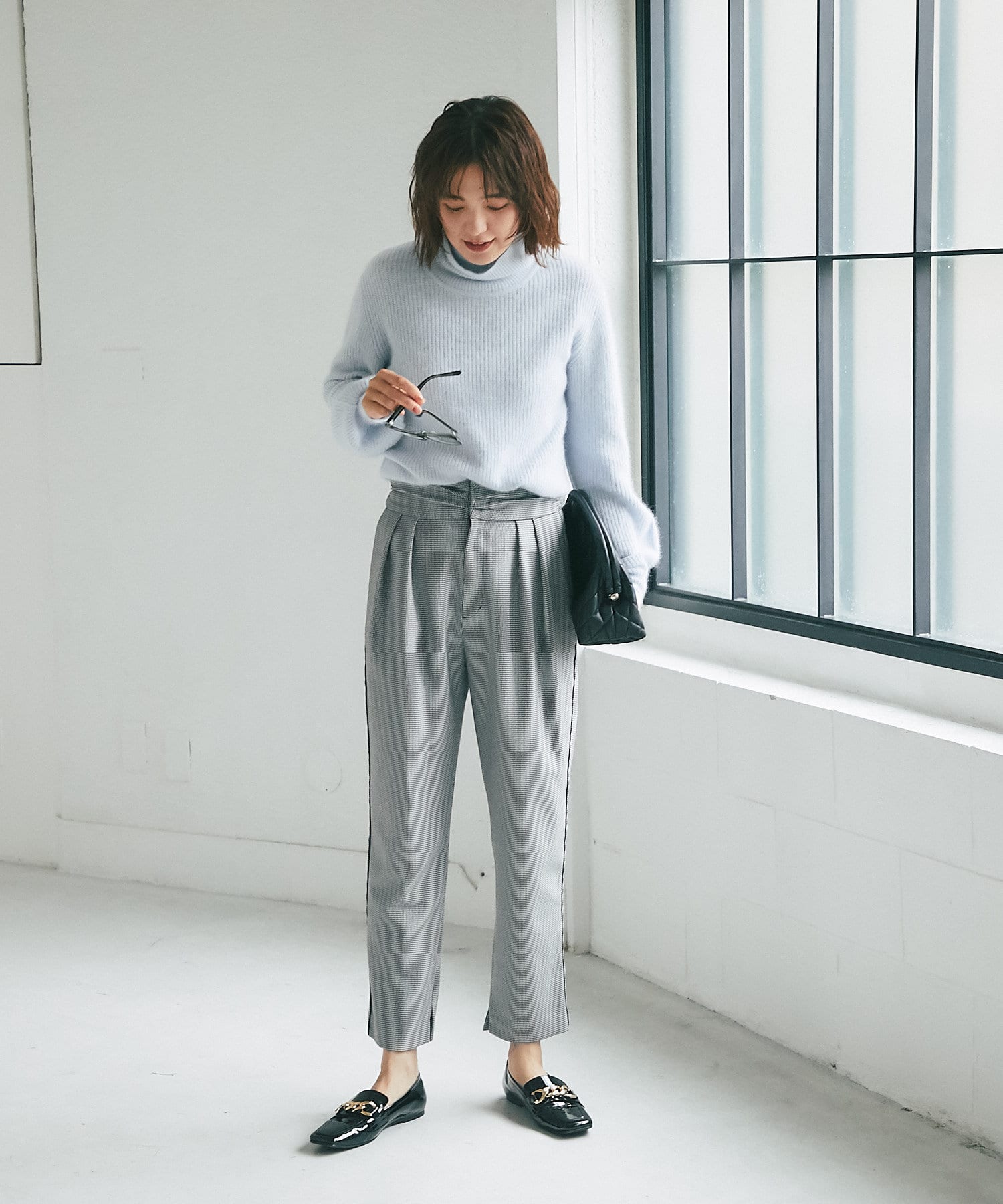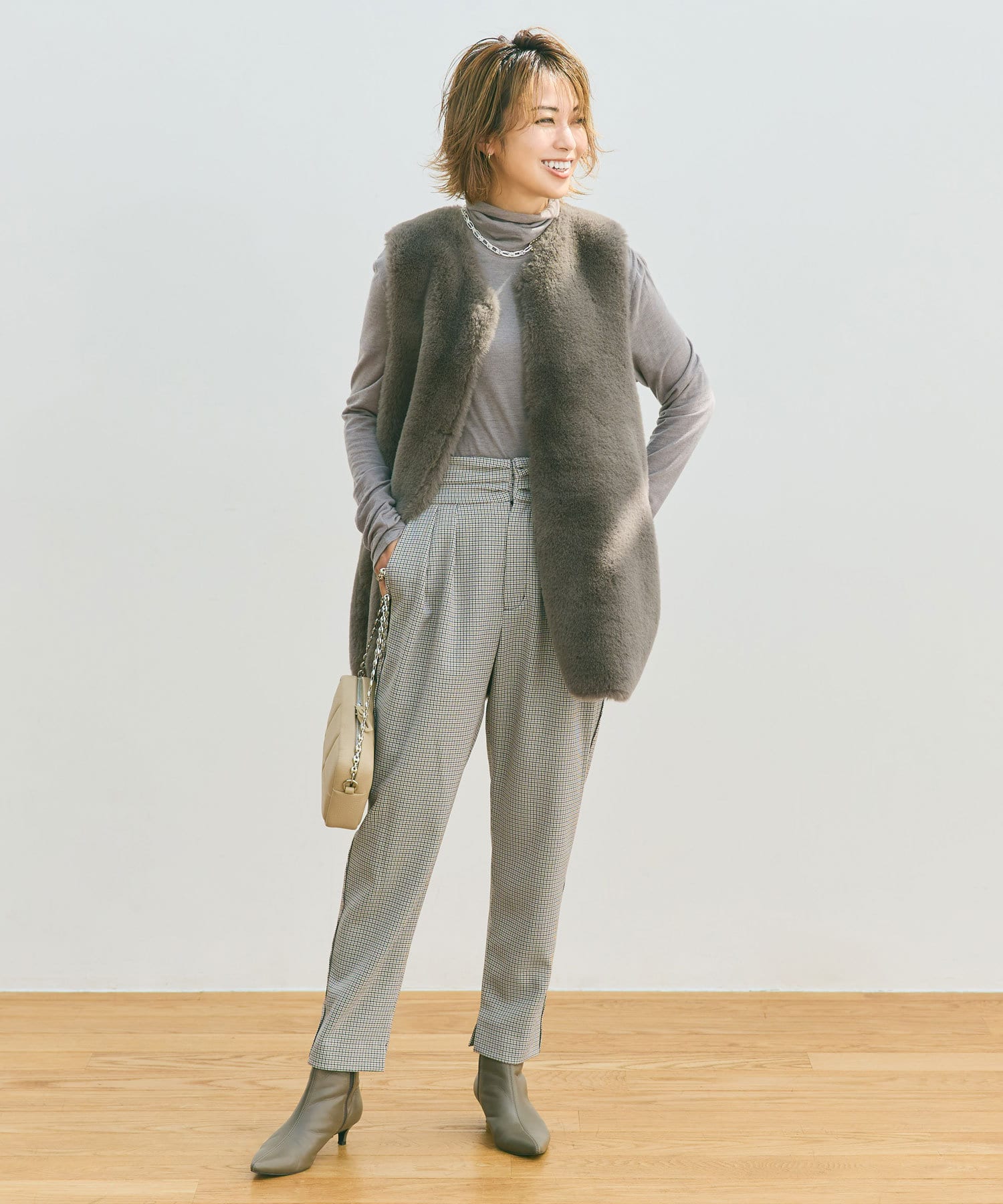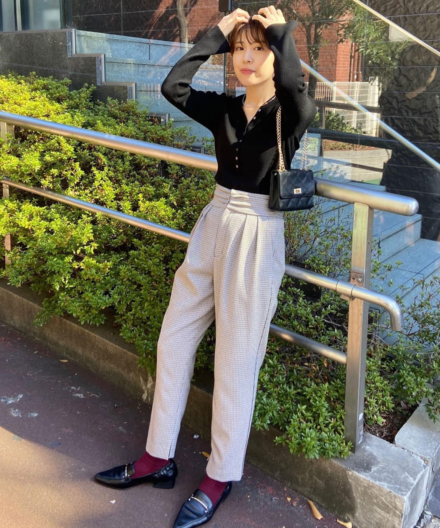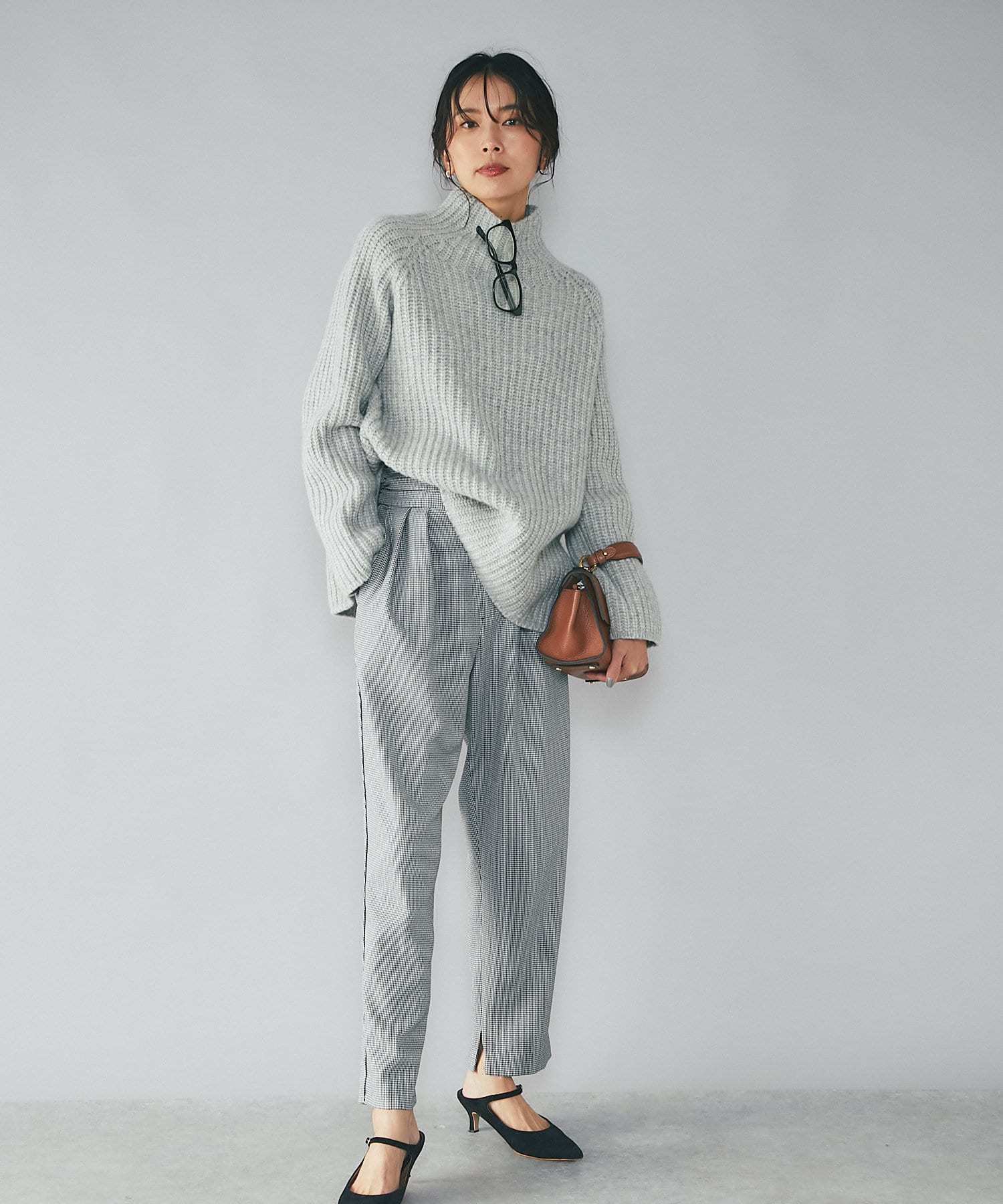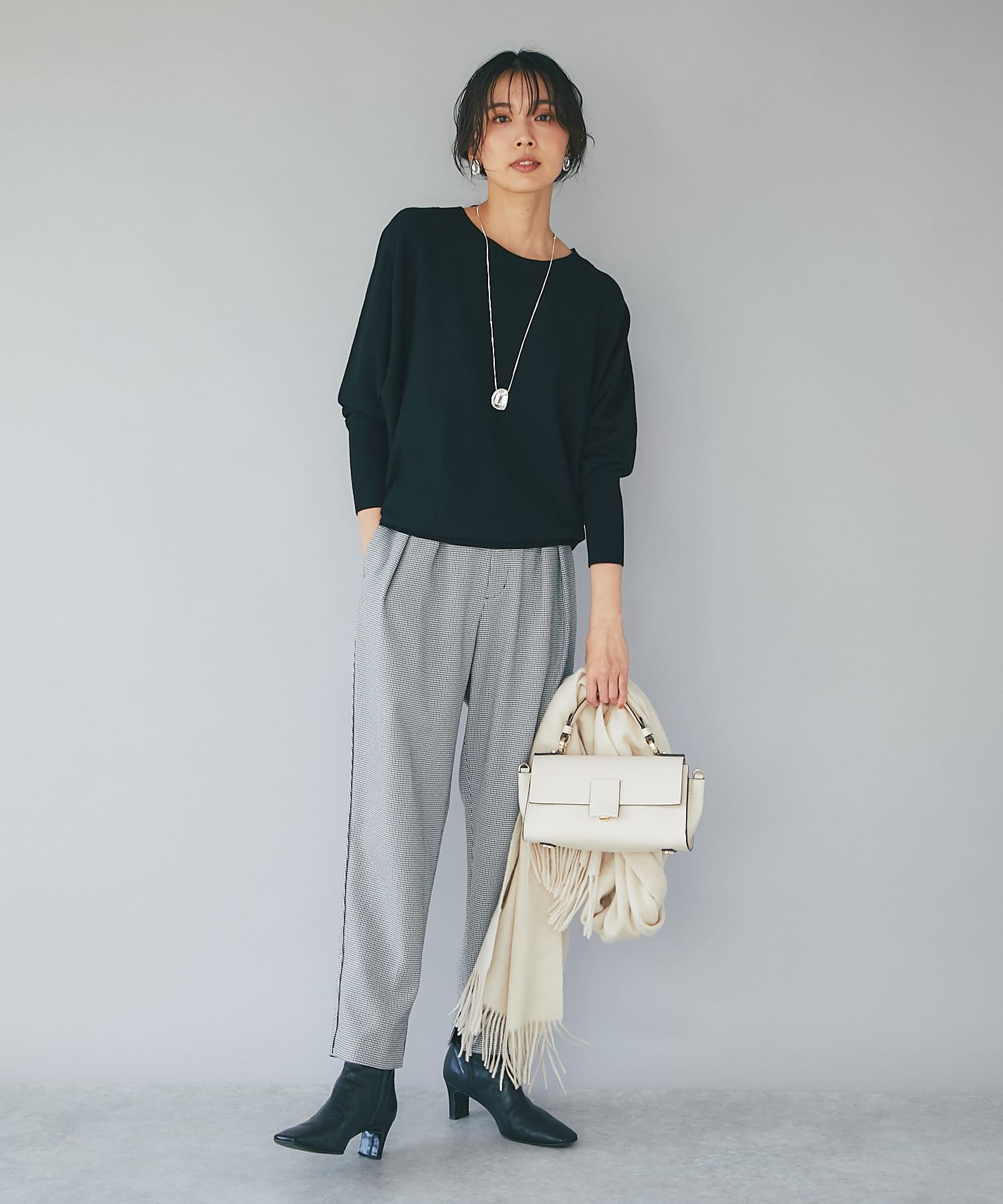 ⇒細やかなチドリチェックは柄が細かい分、全体的に見るとグレーやダークブラウンのパンツを着ているような感覚でコーディネートしていただけます。柄アイテムを着慣れていない方もトライしやすいおすすめアイテムです。