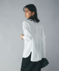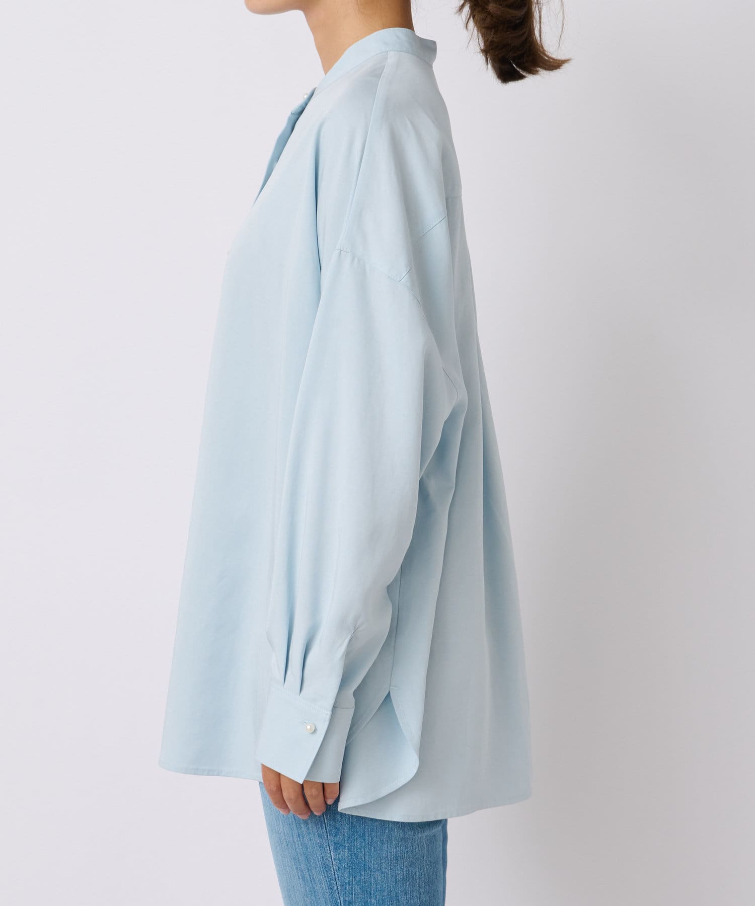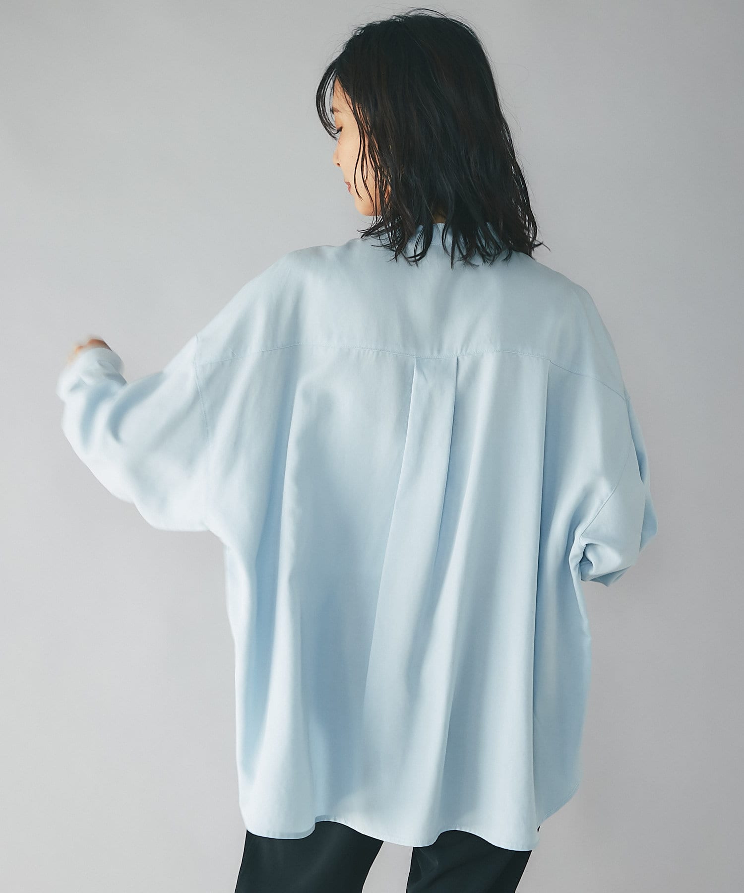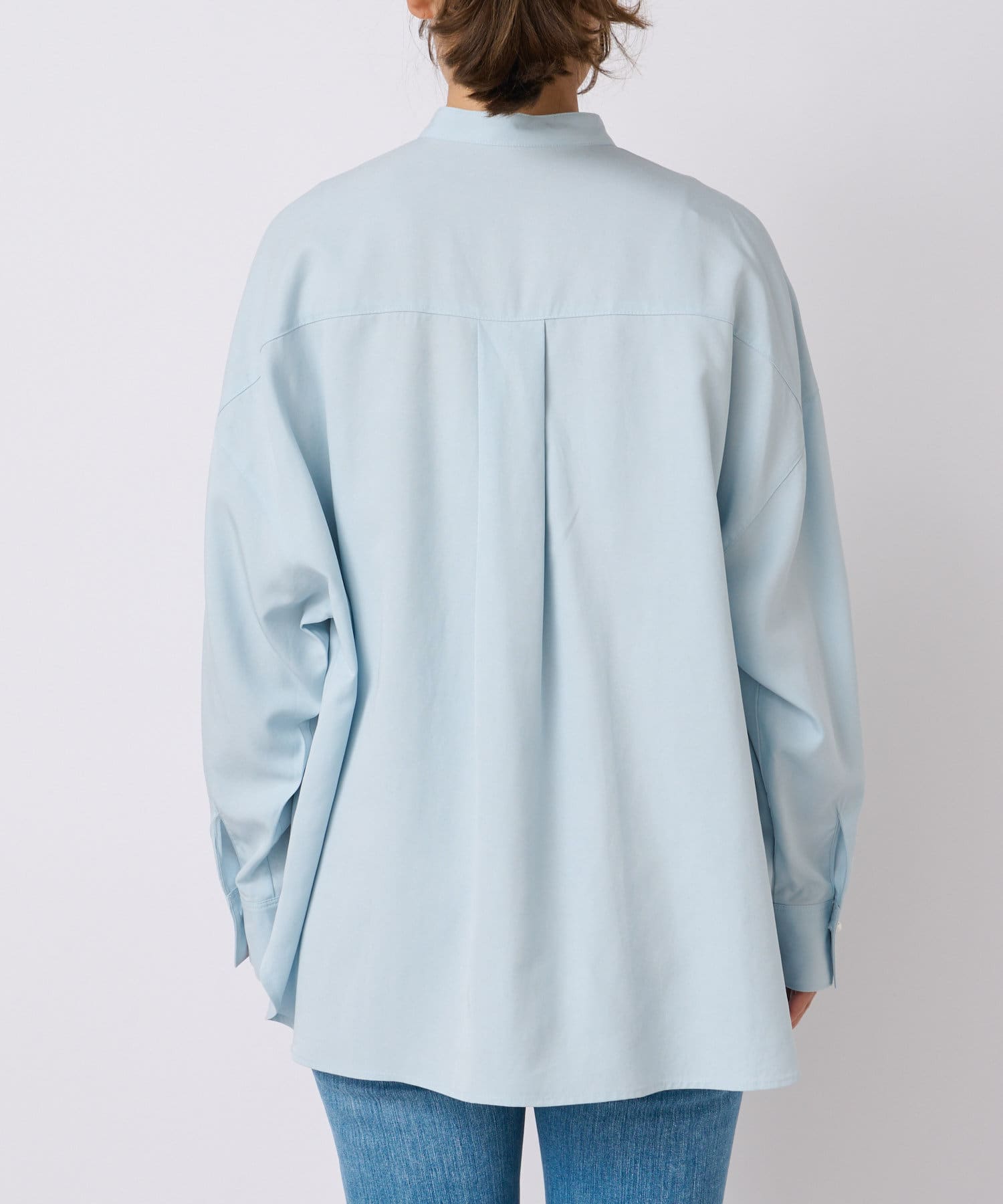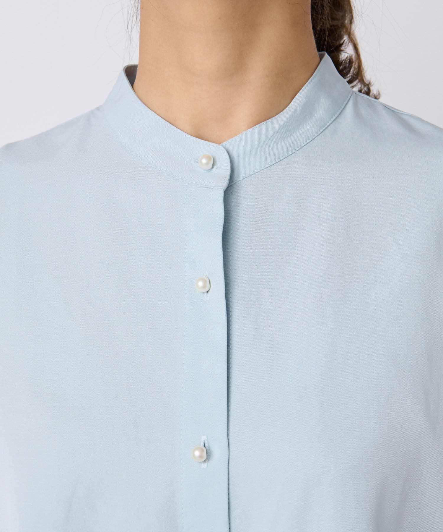 パールボタンが目を引くバンドカラーシャツ。 落ち感があり今季トレンドのタートルネックとのレイヤードもゴワつかず、サラリとした着心地が魅力的です。 こなれた表情のリネン混セルロース素材を使用したシンプルなデザインなので、パンツにもスカートにも合わせやすく、1枚で着用するほか羽織としても便利なアイテムです。 サックスとオフホワイトの2色展開で春も大活躍間違いなし! ご自宅で手洗い可能となっております。