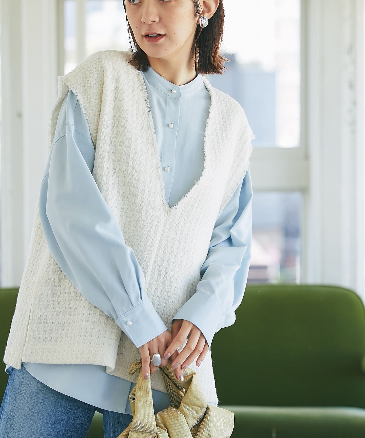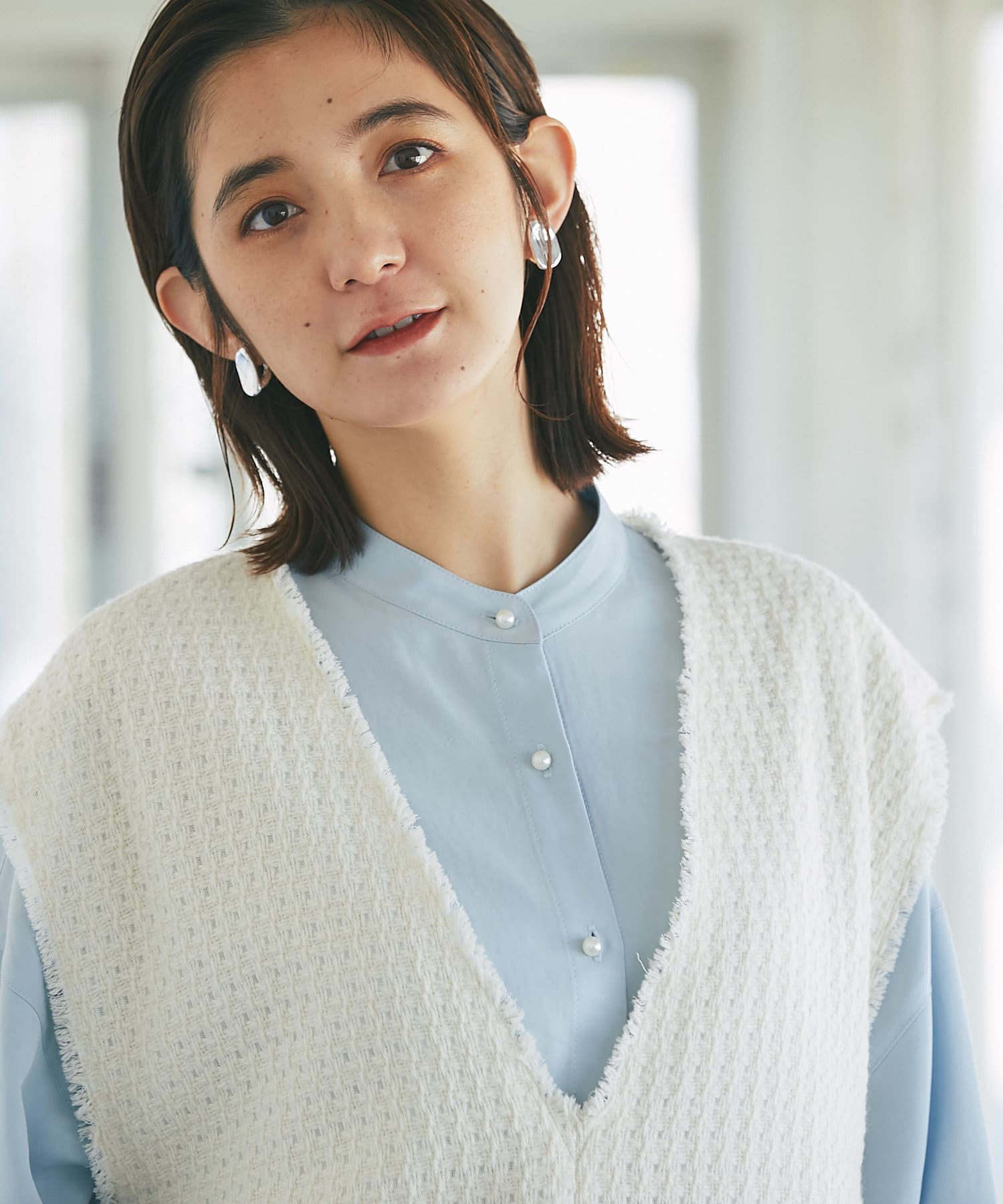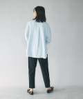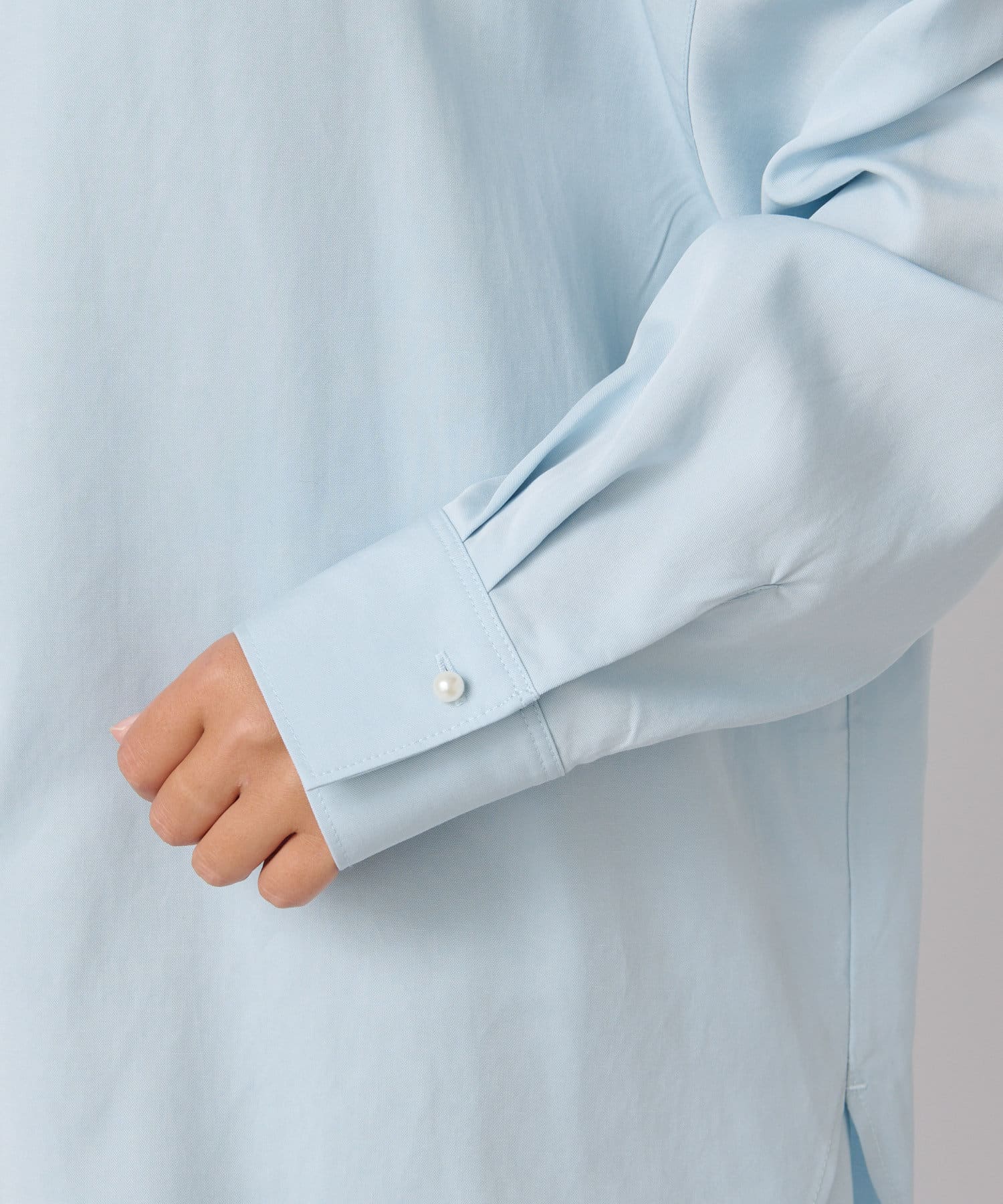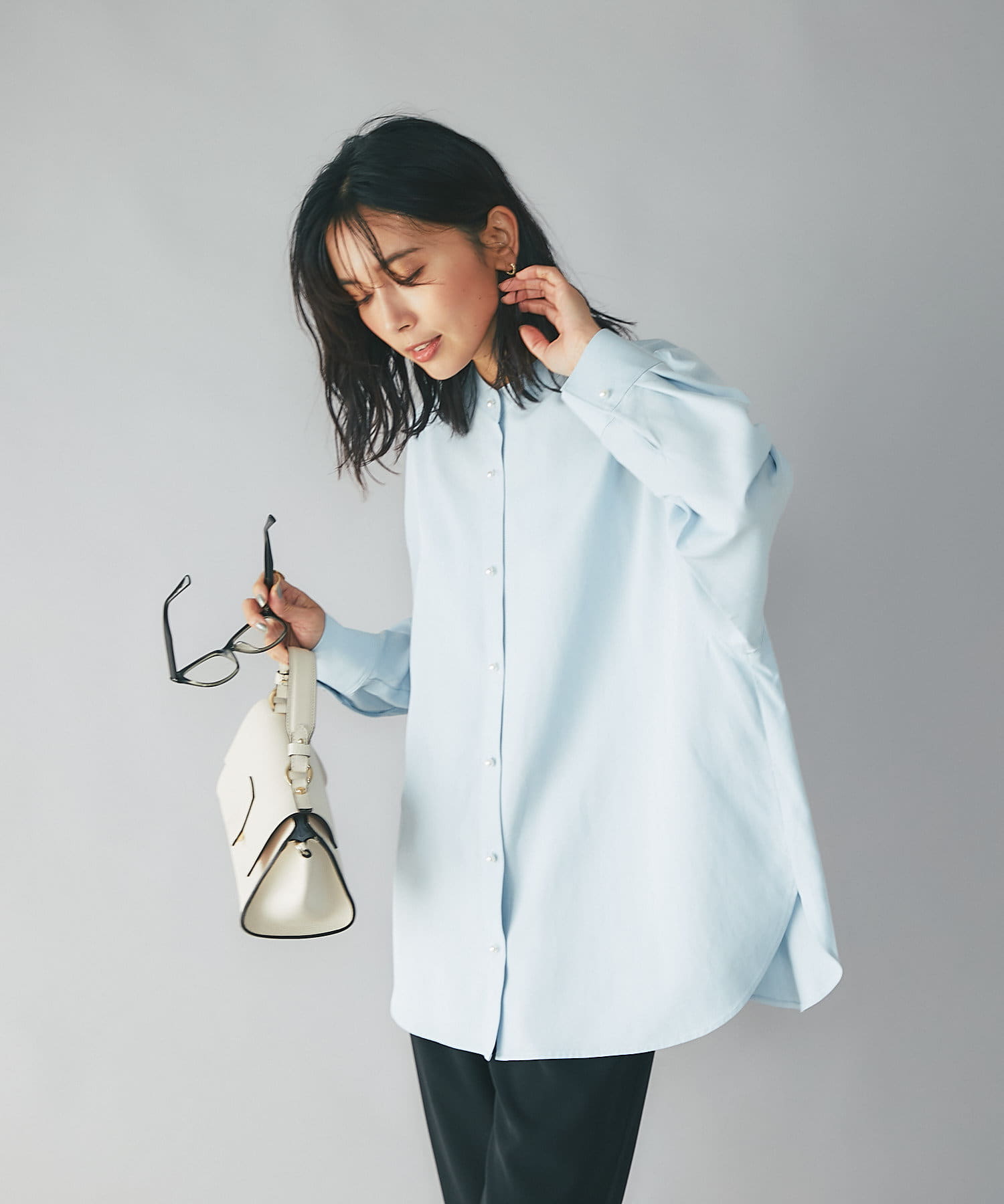 パールボタンが目を引くバンドカラーシャツ。 落ち感があり今季トレンドのタートルネックとのレイヤードもゴワつかず、サラリとした着心地が魅力的です。 こなれた表情のリネン混セルロース素材を使用したシンプルなデザインなので、パンツにもスカートにも合わせやすく、1枚で着用するほか羽織としても便利なアイテムです。 サックスとオフホワイトの2色展開で春も大活躍間違いなし! ご自宅で手洗い可能となっております。