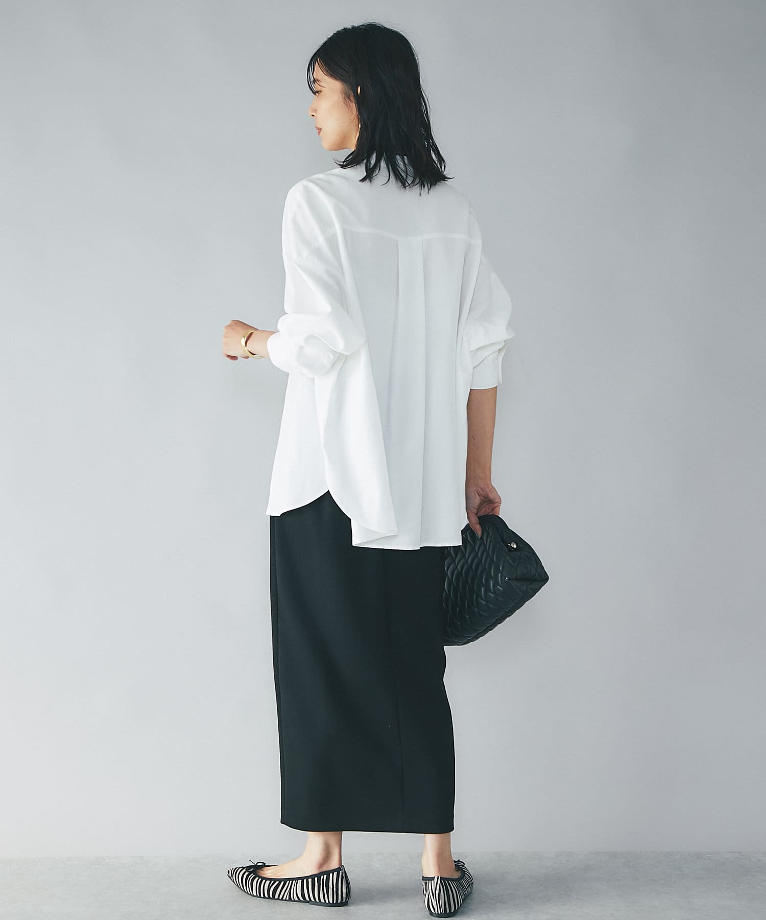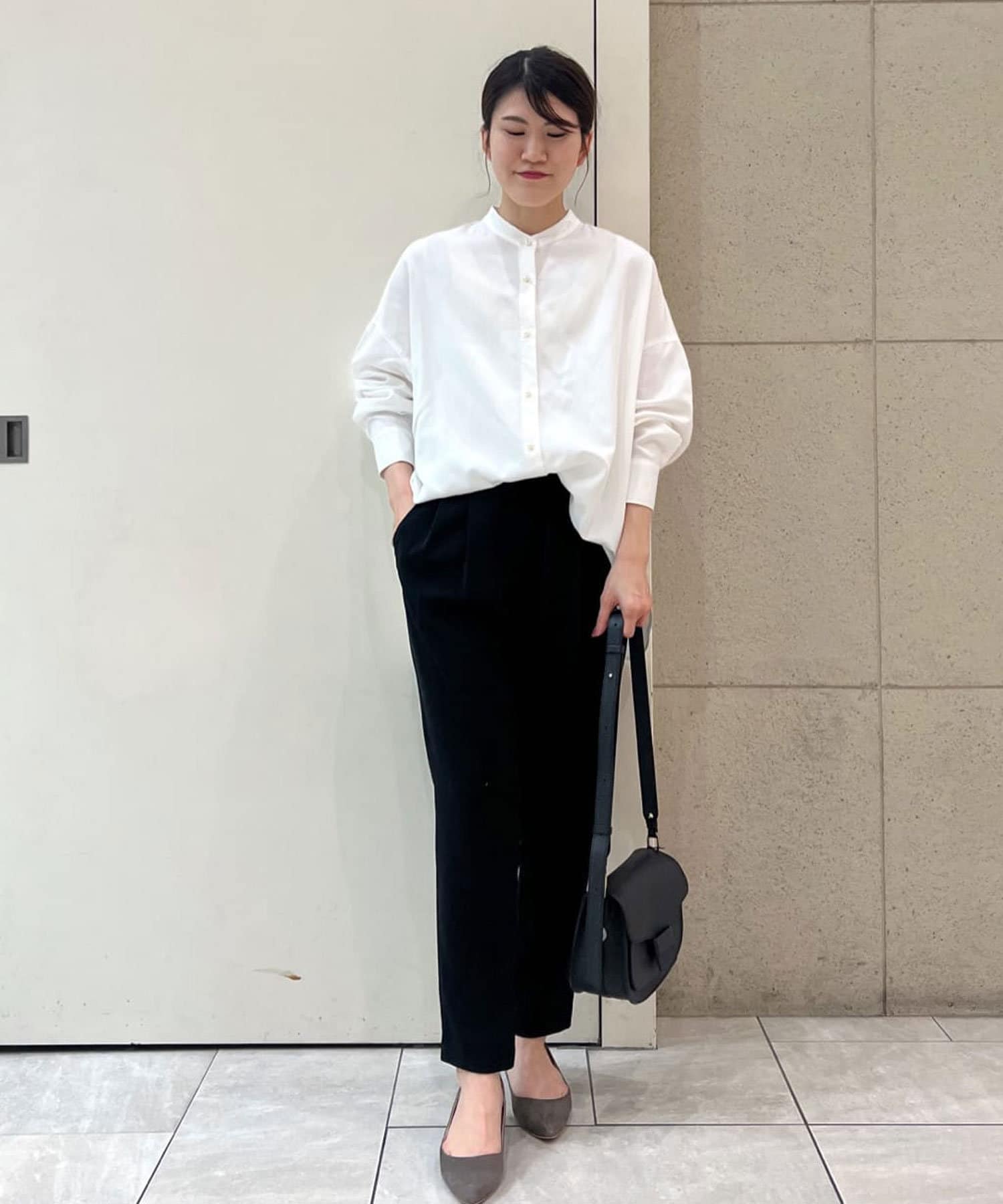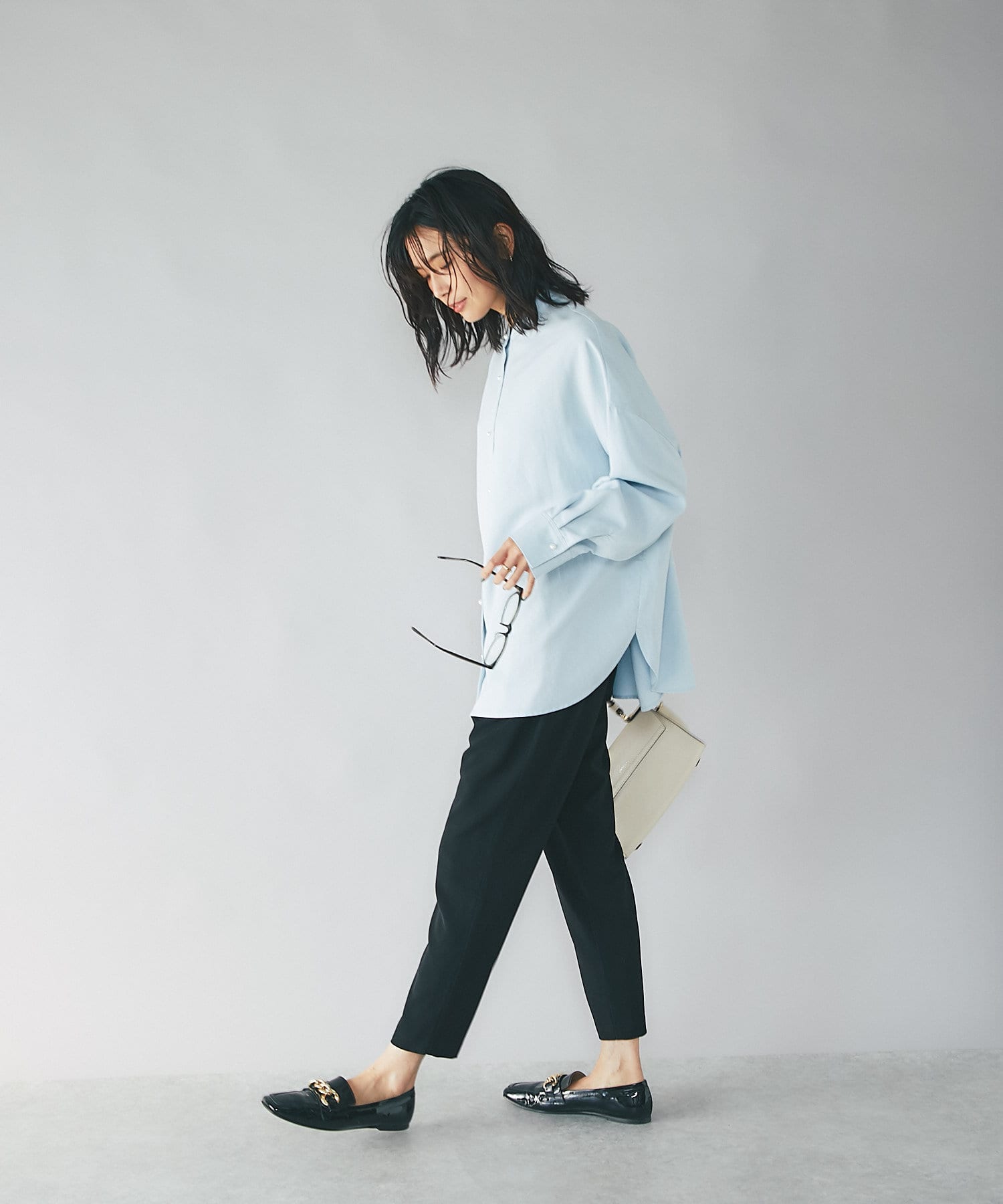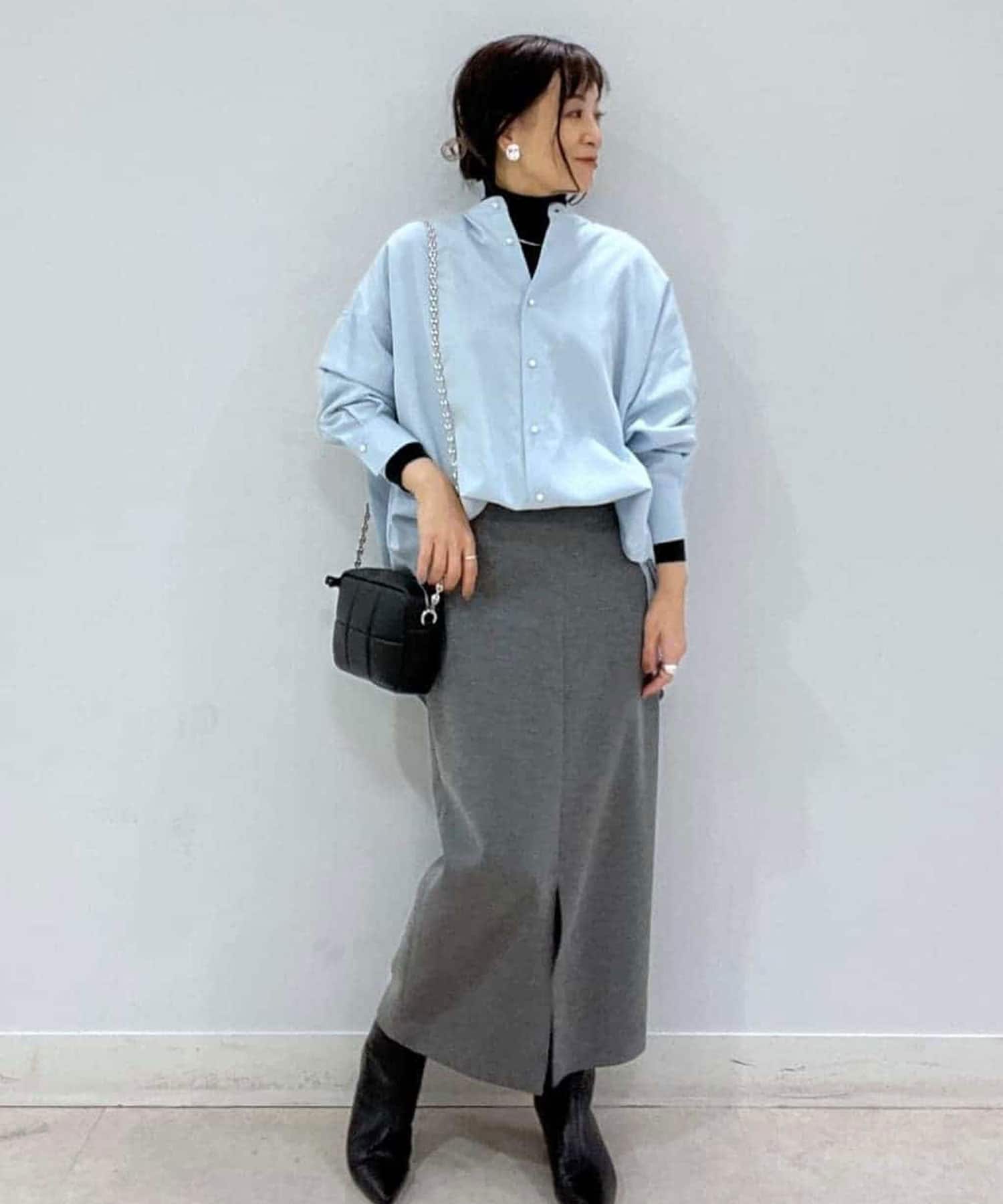 ⇒通常のシャツに比べるとフェミニンな雰囲気ですが、デニムパンツと合わせたりニットの中に着てレイヤードアイテムとして着ていただくと大人カジュアルなコーディネートにも使えます。胸元を少し開けて中にタートルネックニットを重ねるスタイルも抜け感が出るのでおすすめです。
