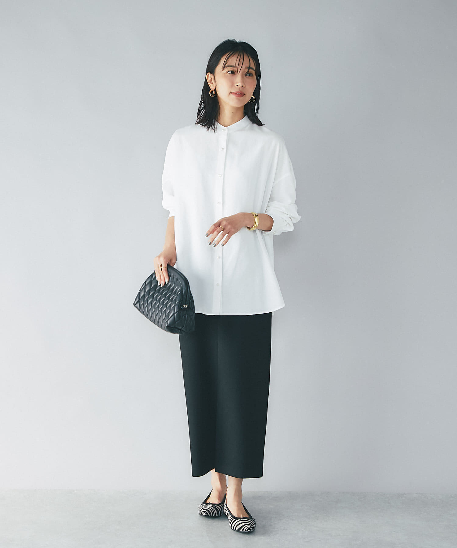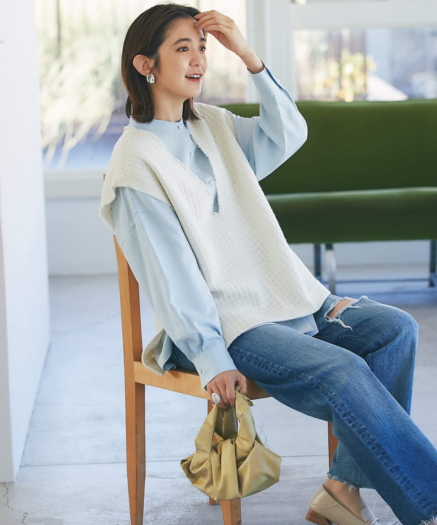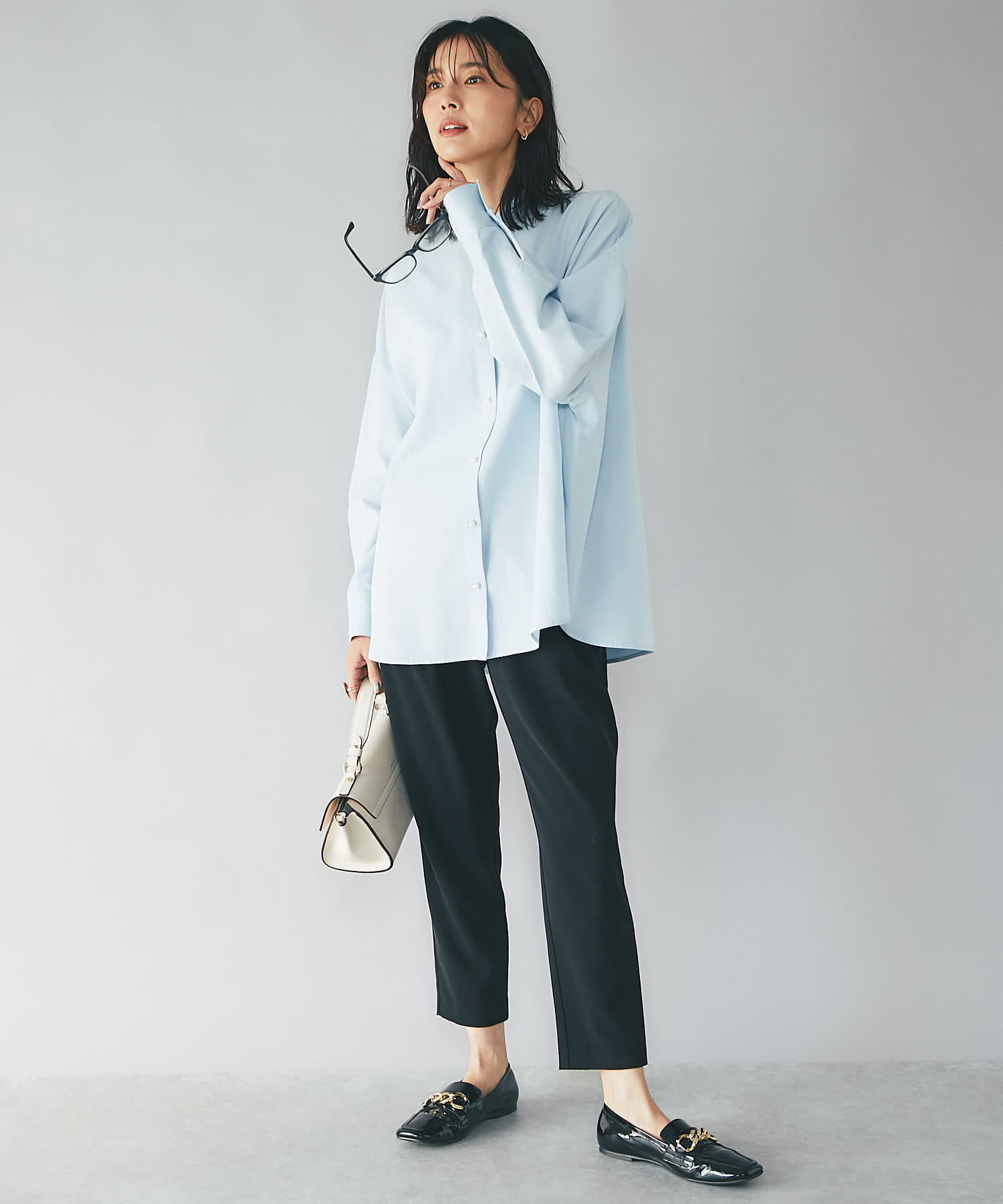 ⇒通常のシャツに比べるとフェミニンな雰囲気ですが、デニムパンツと合わせたりニットの中に着てレイヤードアイテムとして着ていただくと大人カジュアルなコーディネートにも使えます。胸元を少し開けて中にタートルネックニットを重ねるスタイルも抜け感が出るのでおすすめです。