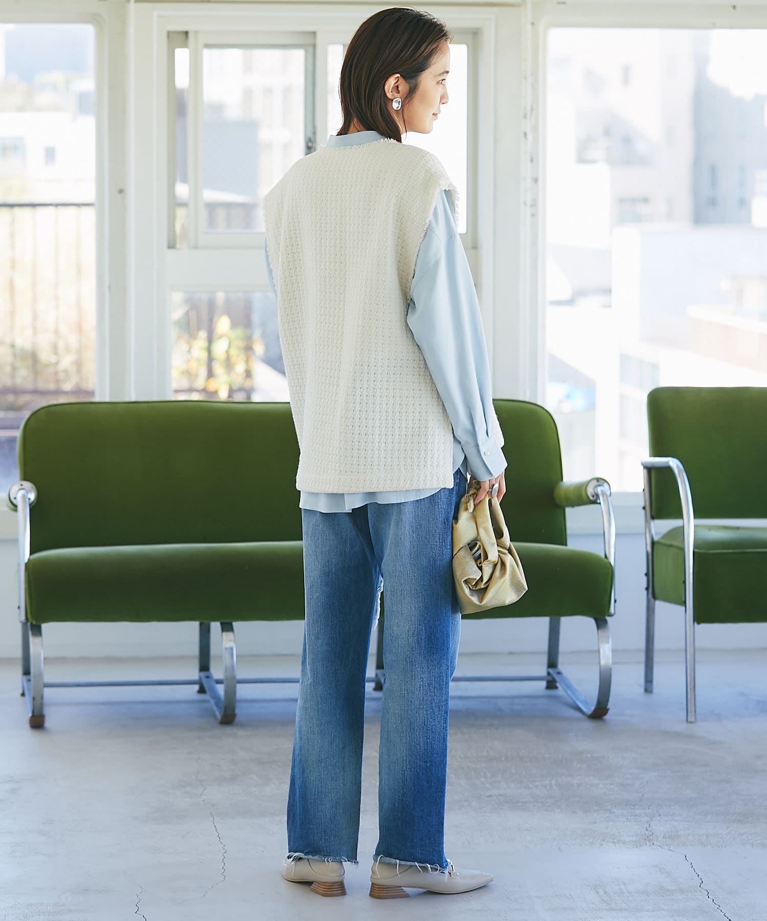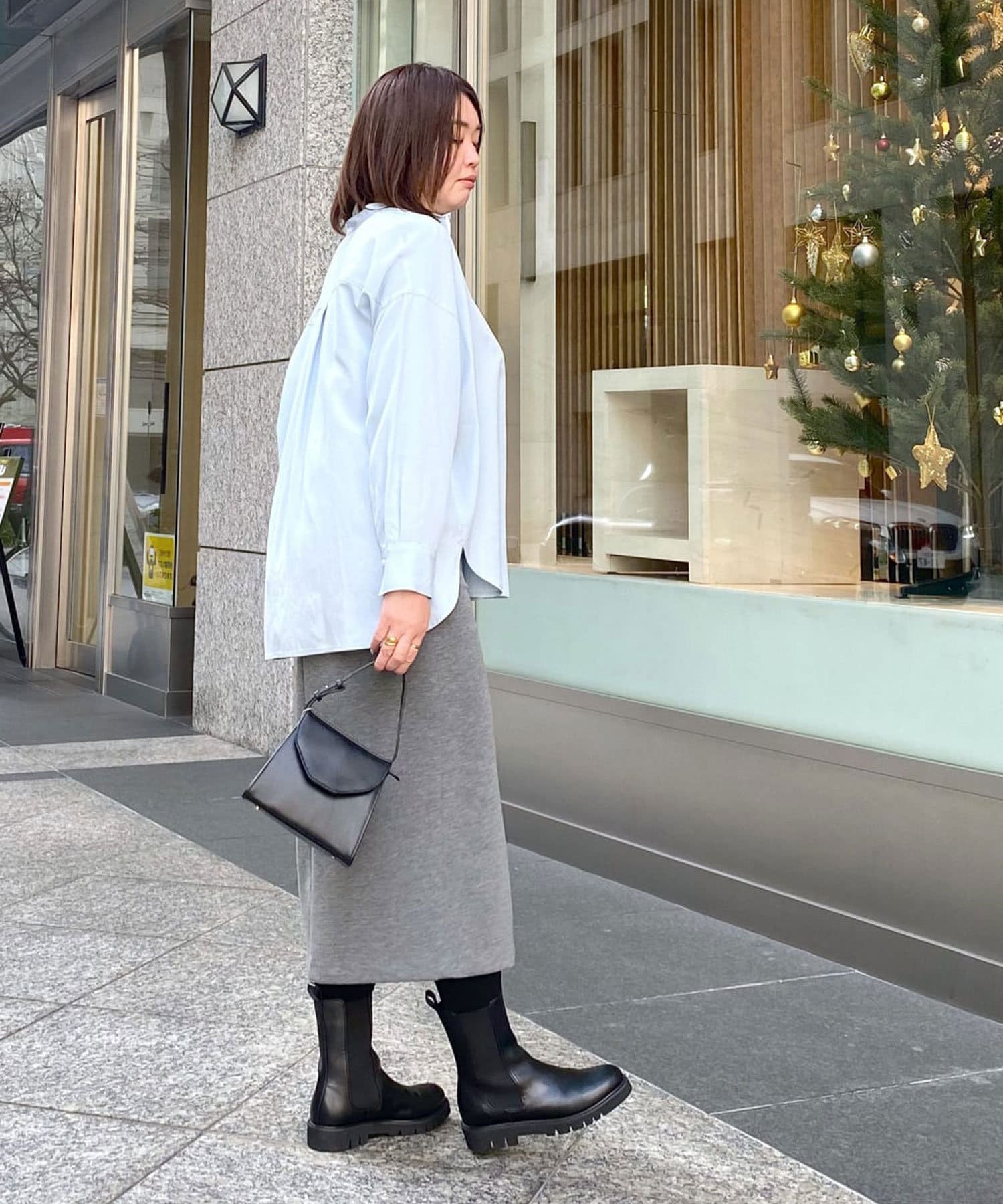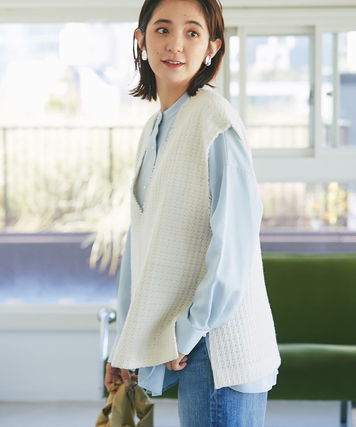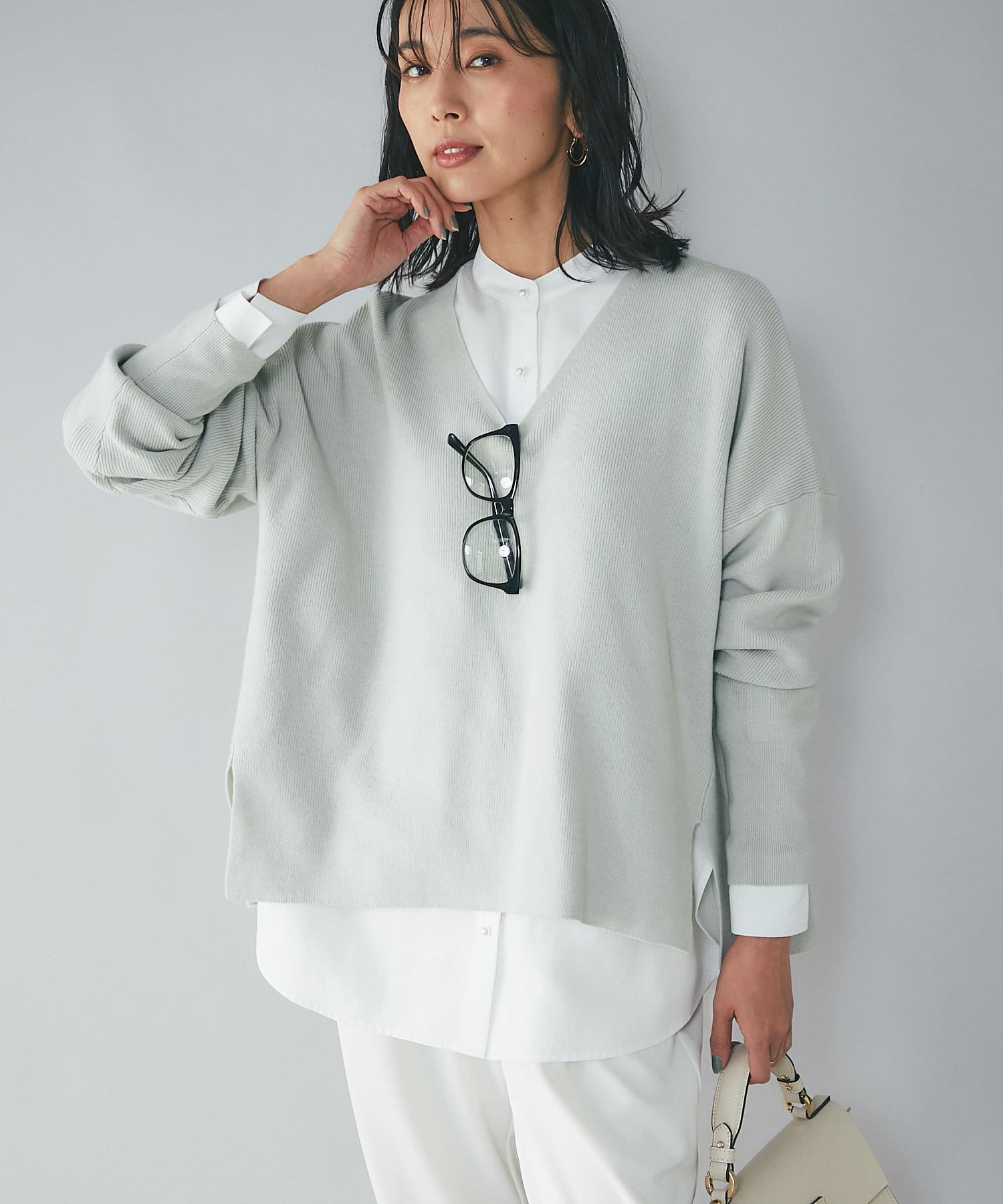 ⇒通常のシャツに比べるとフェミニンな雰囲気ですが、デニムパンツと合わせたりニットの中に着てレイヤードアイテムとして着ていただくと大人カジュアルなコーディネートにも使えます。胸元を少し開けて中にタートルネックニットを重ねるスタイルも抜け感が出るのでおすすめです。