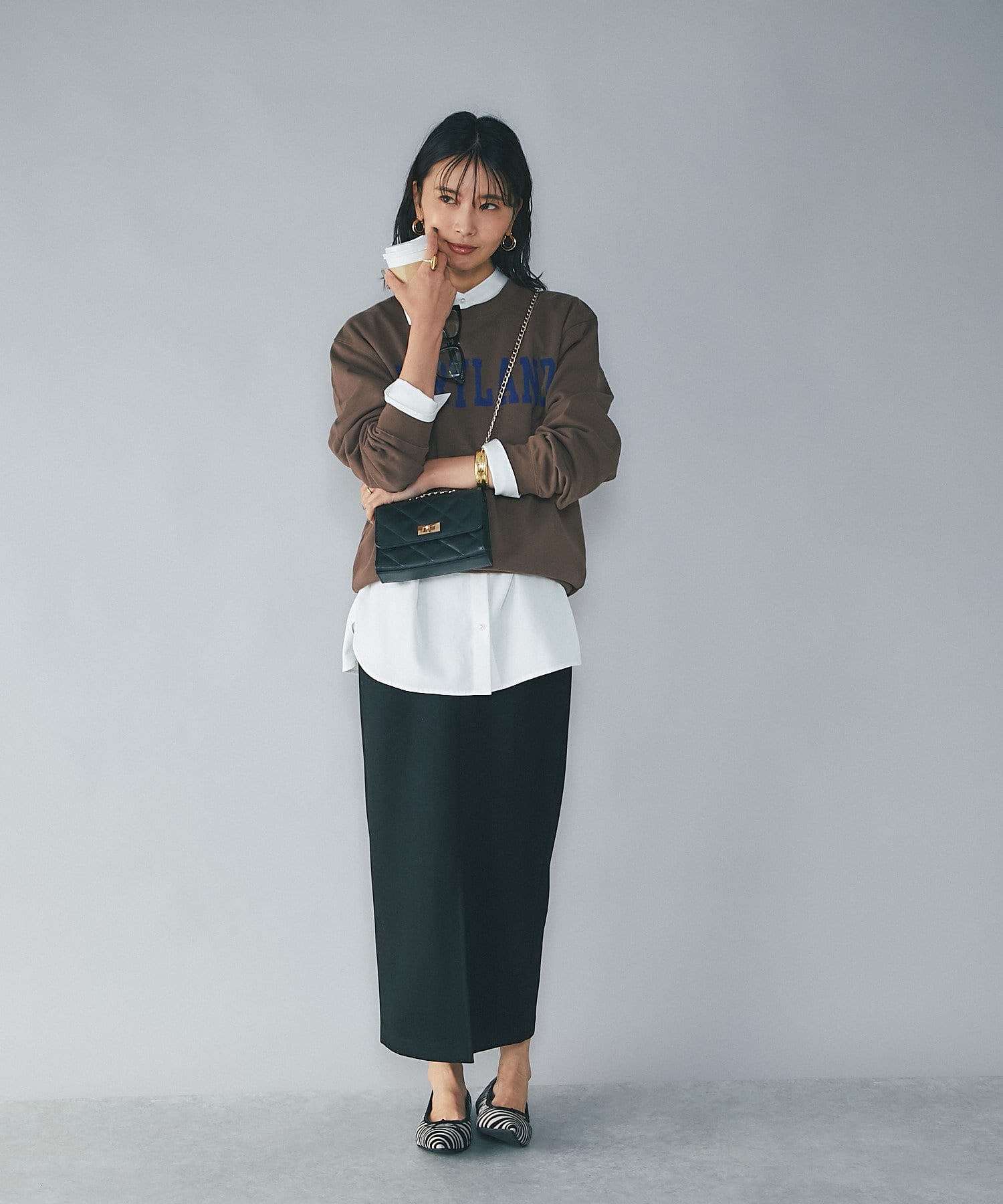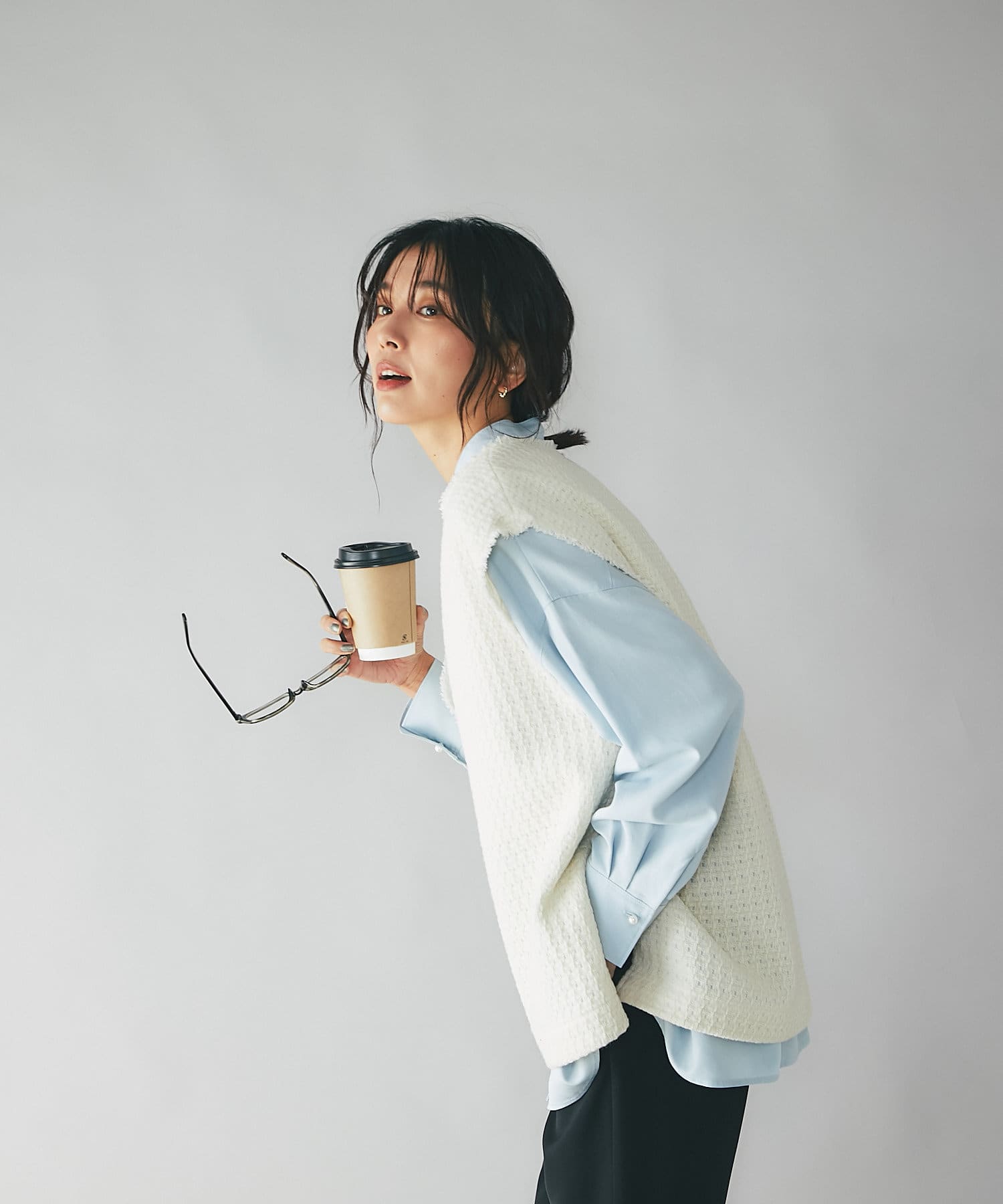 ⇒パールボタンが程よく上品な印象になるため、オケージョンスタイルにもおすすめです。トレンドのツイード素材との相性もいいので、