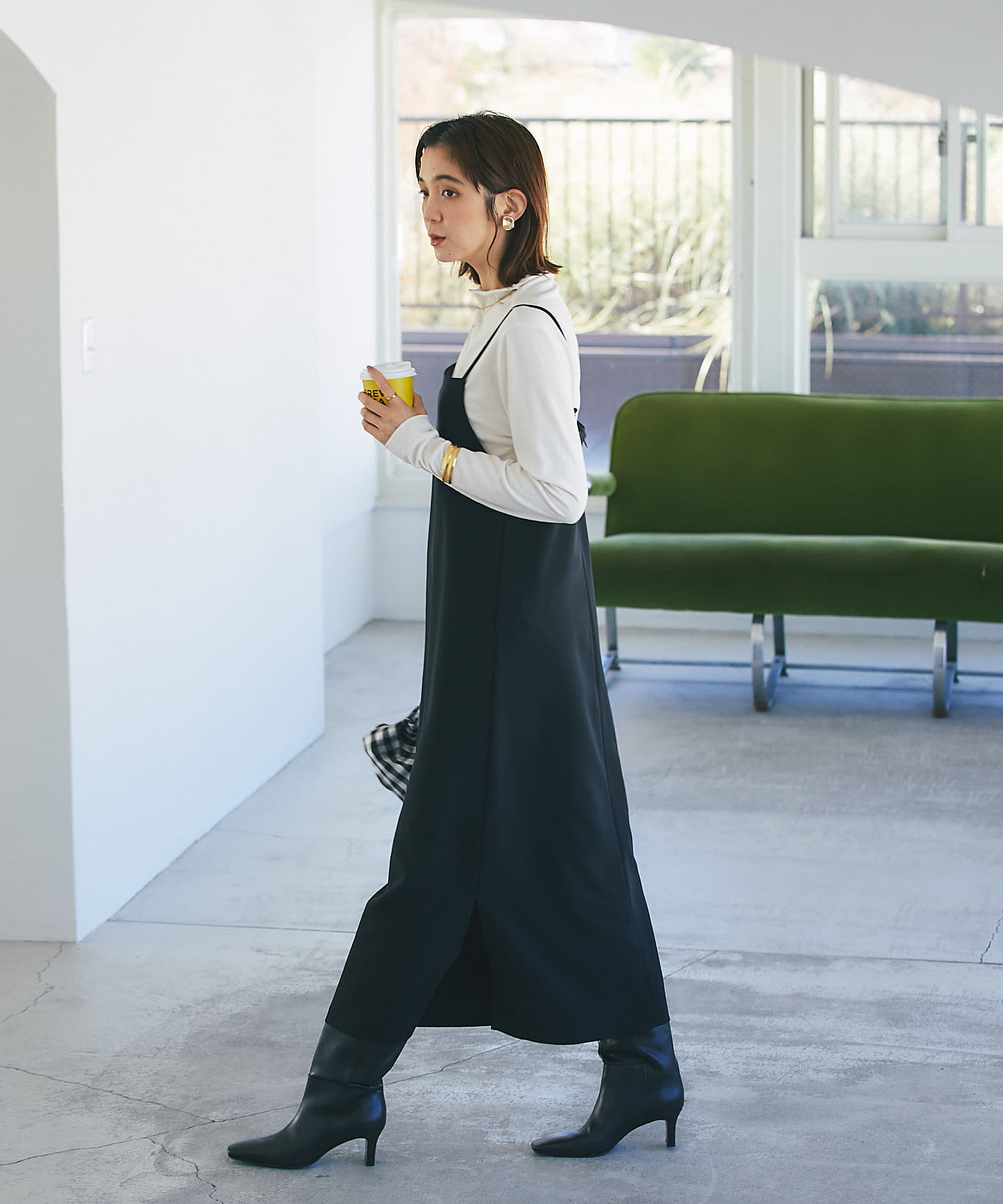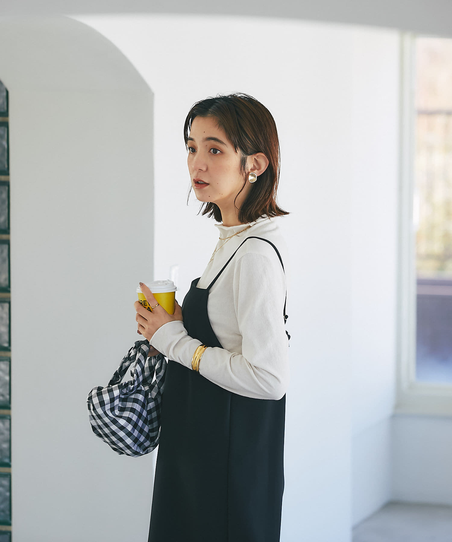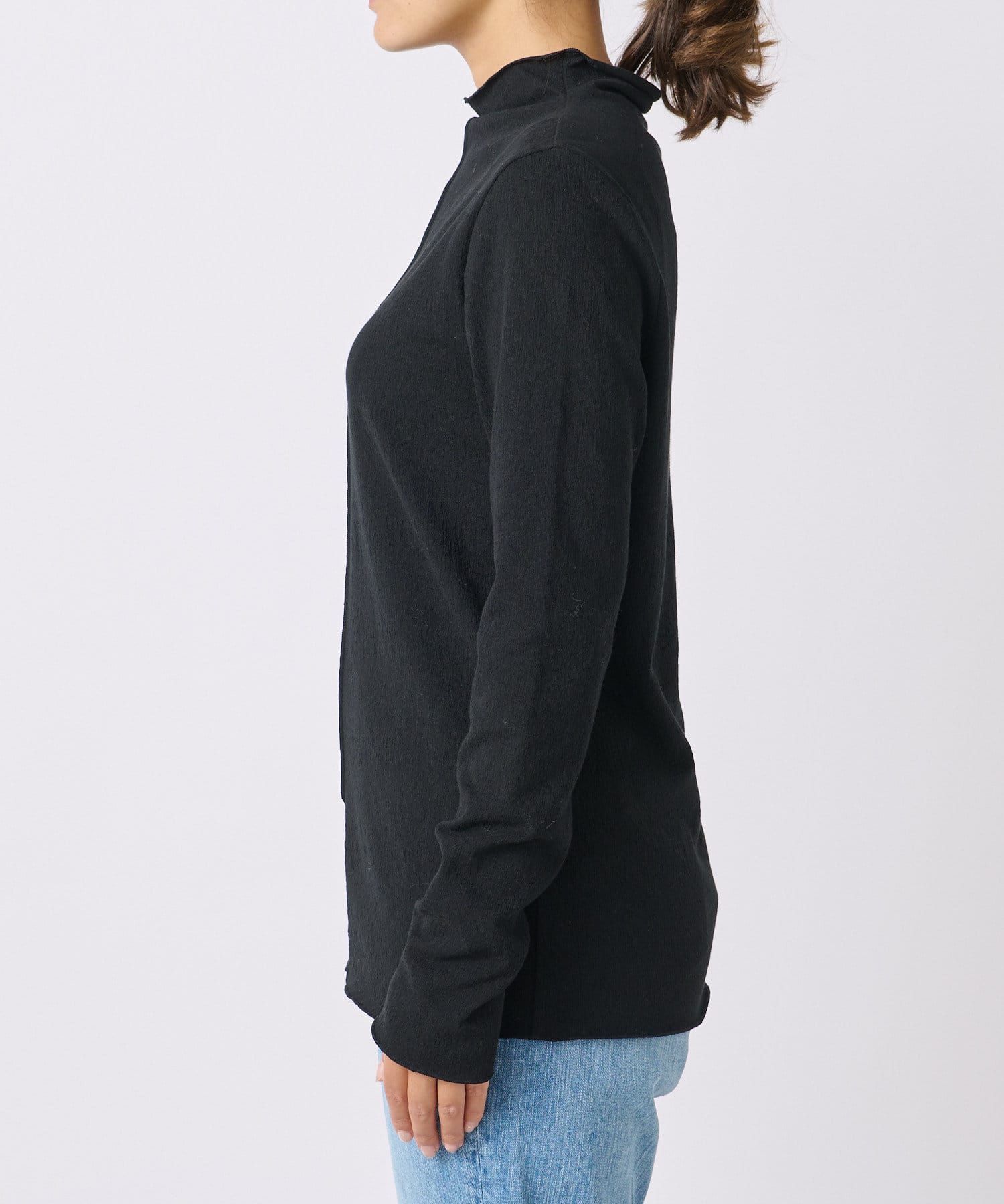肌ばなれが良く、透けにくい素材感と程よく立ち上がったハイネックでレイヤードにピッタリなアイテム。
