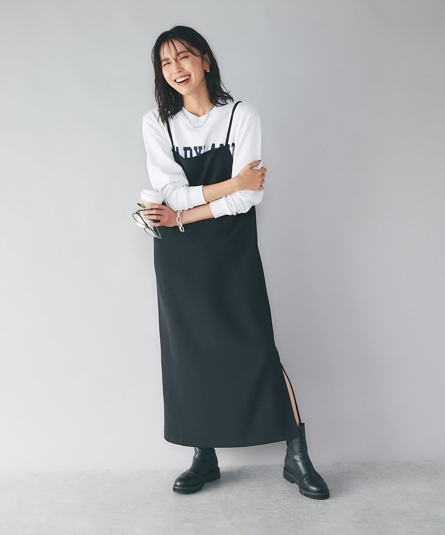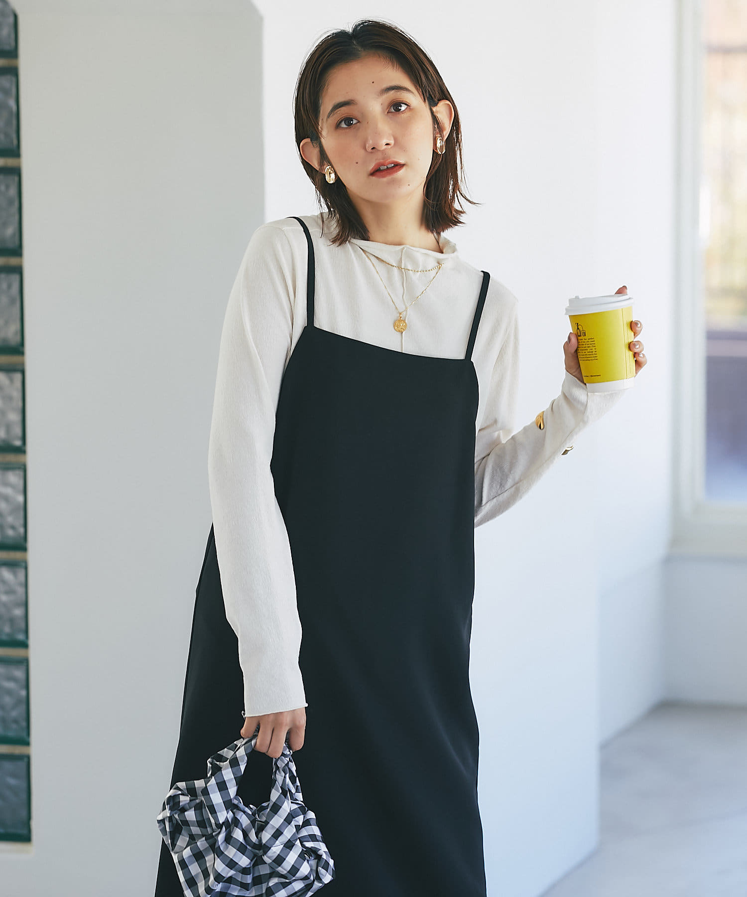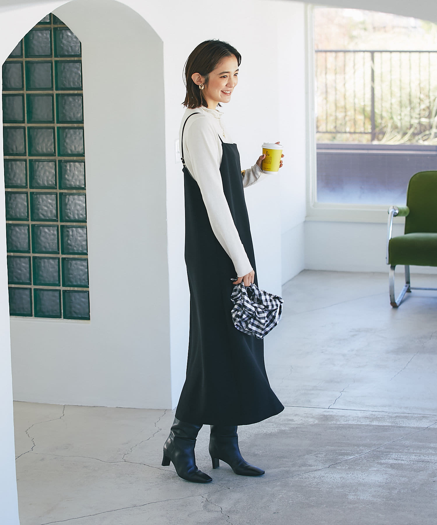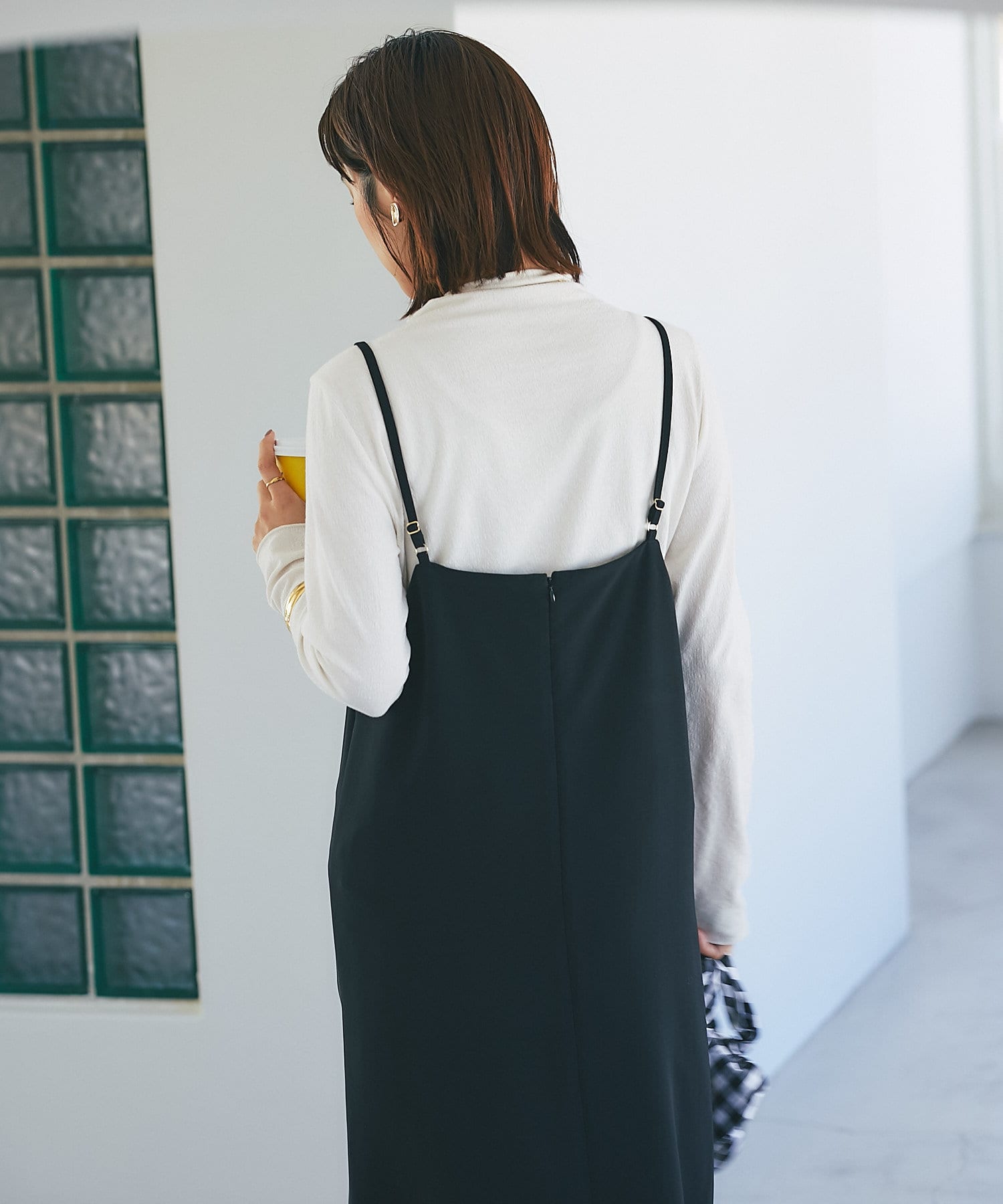 ⇒肩のストラップで長さが調整できるため、様々な身長の方に着ていただけます。コーディネート着用スタッフの身長も153cm~170cmと幅広い!すとんとしたIラインシルエットでスタイルアップ効果も抜群です。