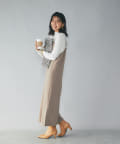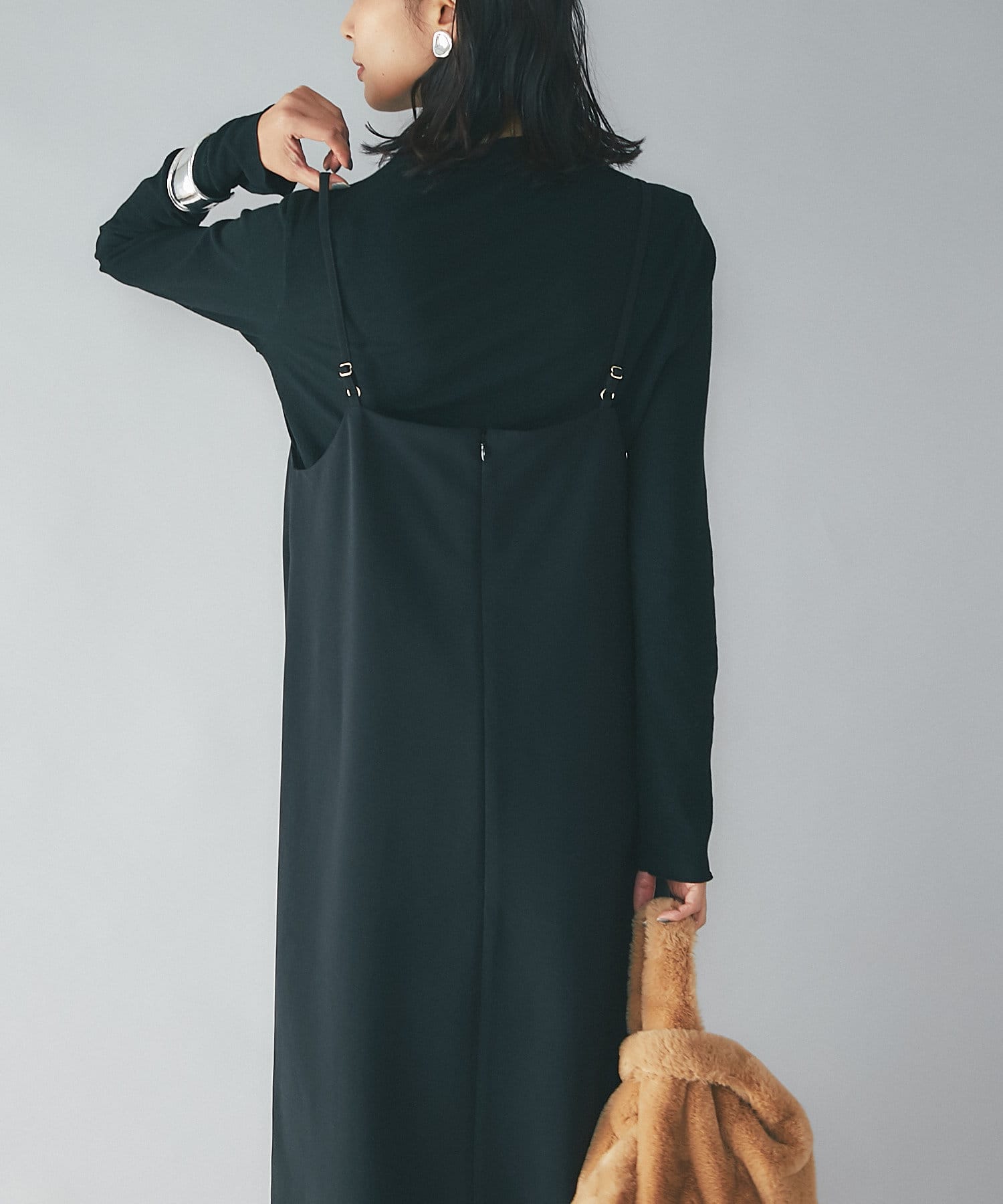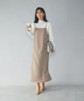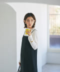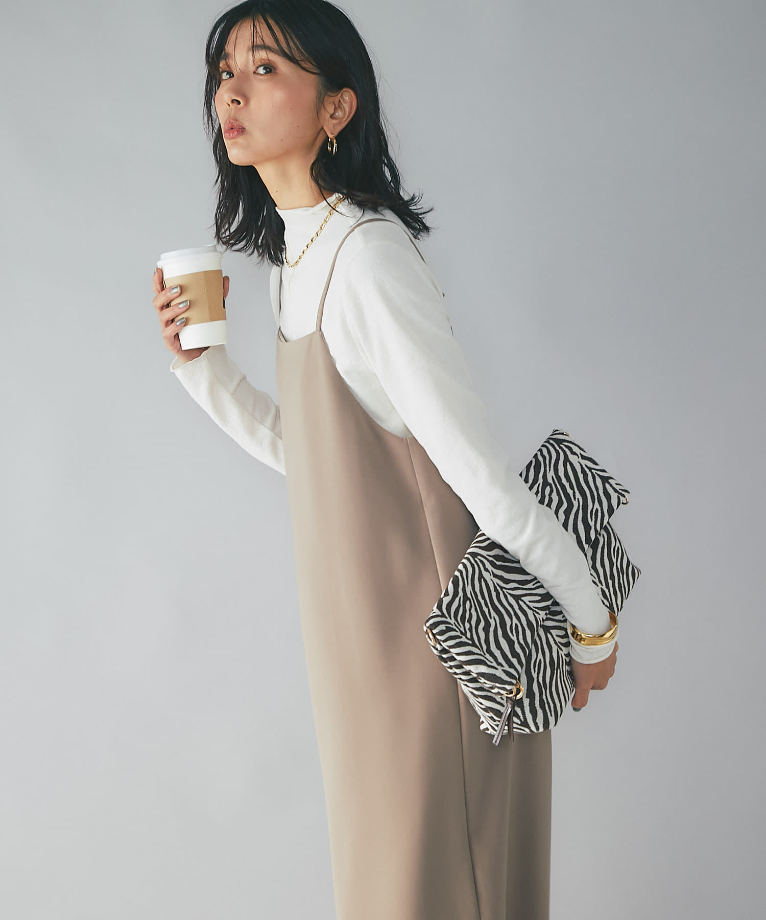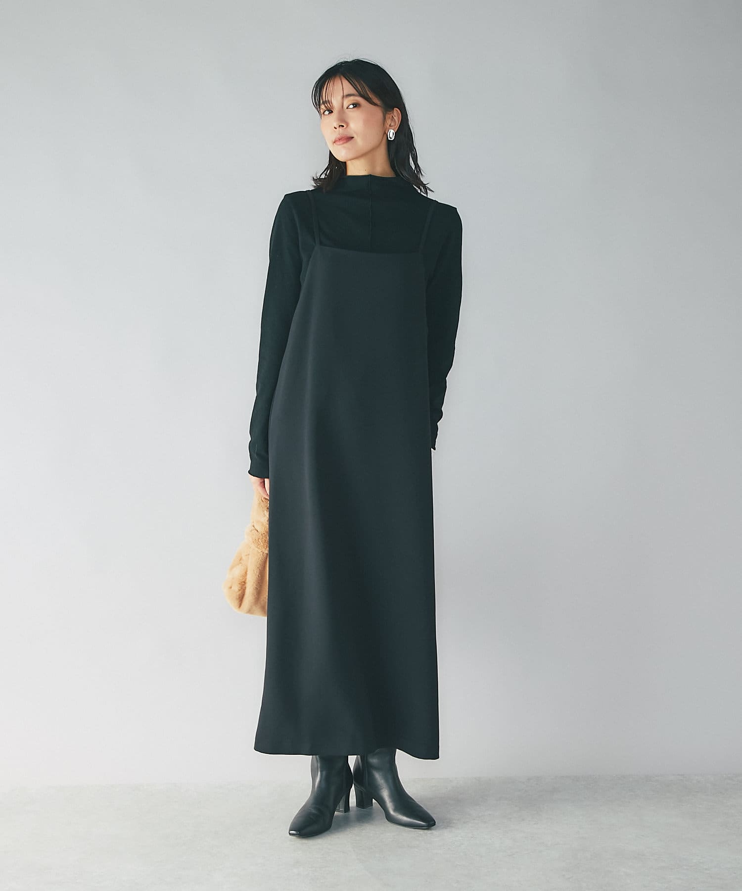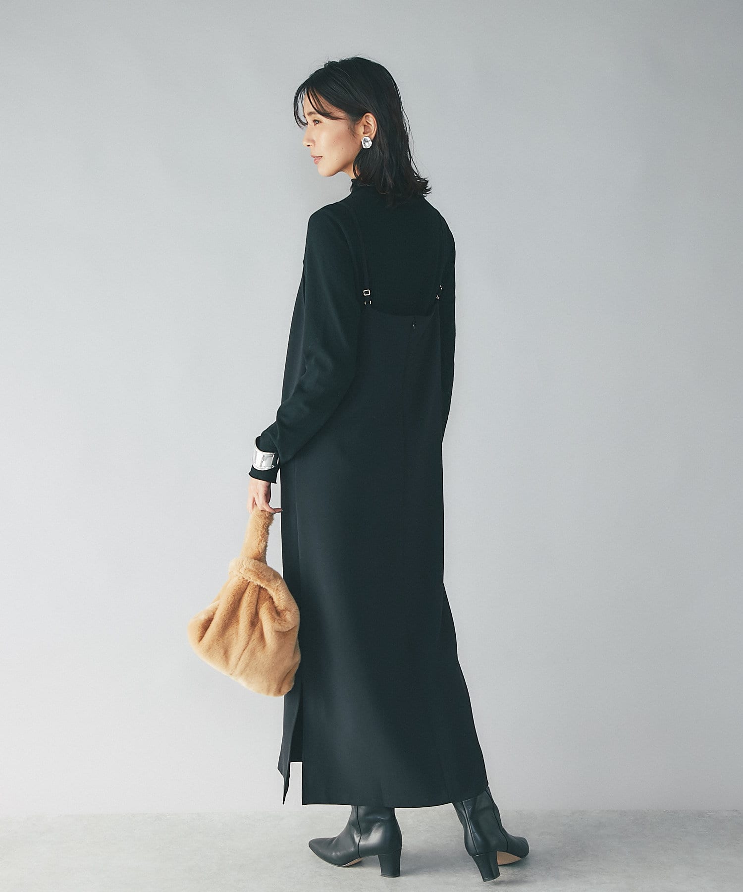 ⇒肩のストラップで長さが調整できるため、様々な身長の方に着ていただけます。コーディネート着用スタッフの身長も153cm~170cmと幅広い!すとんとしたIラインシルエットでスタイルアップ効果も抜群です。
