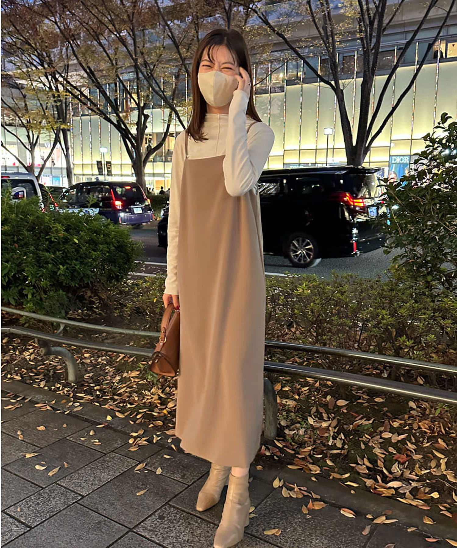 ⇒程よく厚みのあるしっかりした生地感のため、組み合わせるお洋服次第でロングシーズン着まわせるワンピースです。冬はニットやロングブーツ、タイツと合わせて着たり、ニットやスウェットをワンピースの上から着てスカートとしても着て頂けます。1枚あると便利な万能アイテムです。