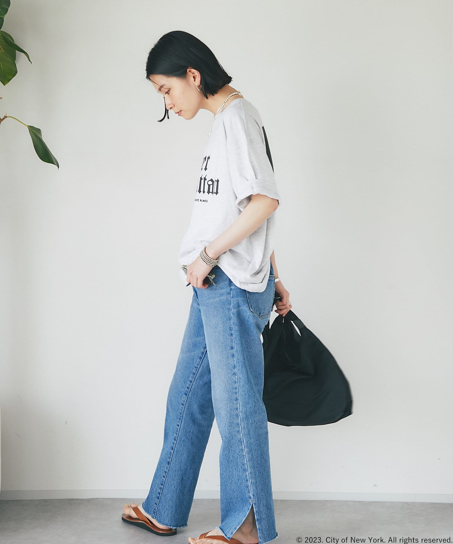 シンプルなデニムスタイルにインパクトのあるプリントが映える一枚。