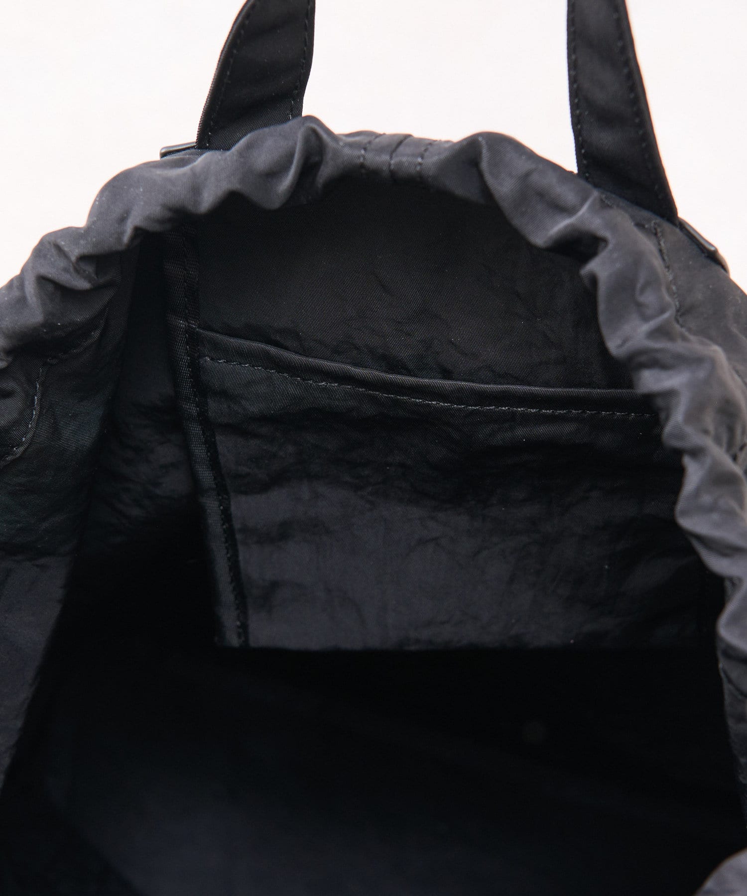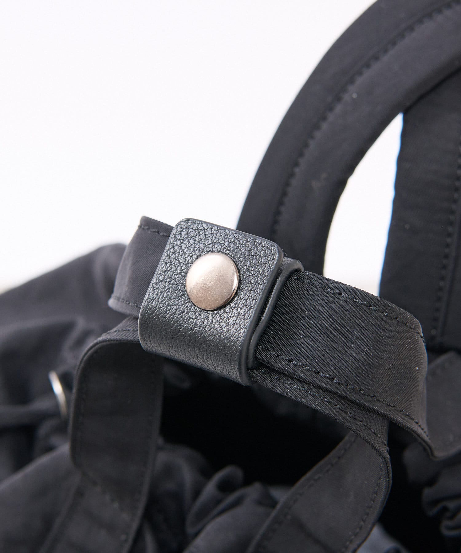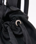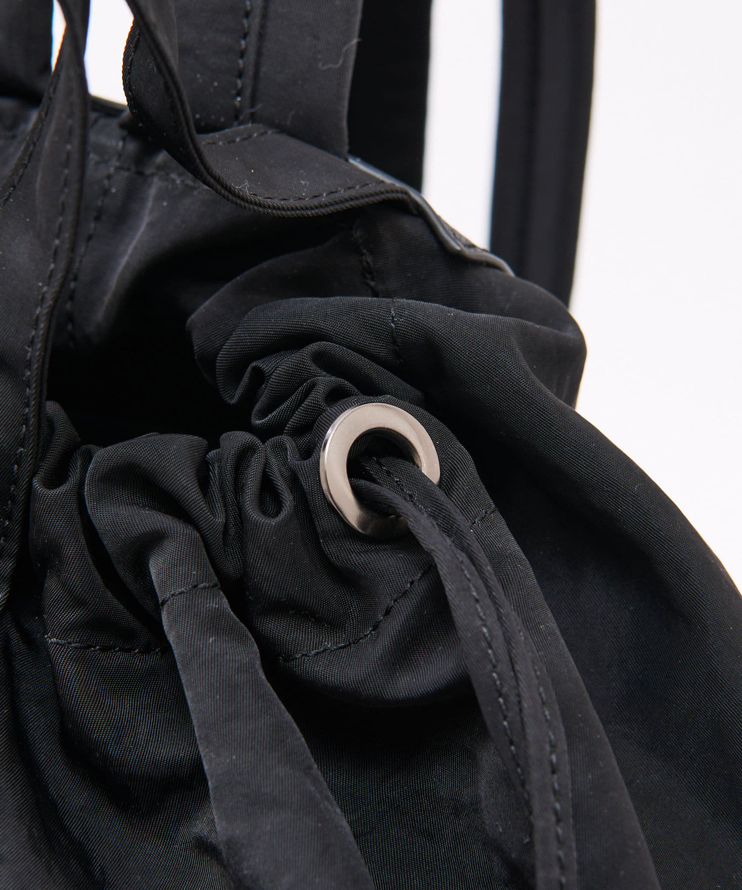 また、上部の持ち手でトート持ちにするのもオススメ!その際は巾着を絞らずに、持って頂くとよりこなれ感が出て◎
