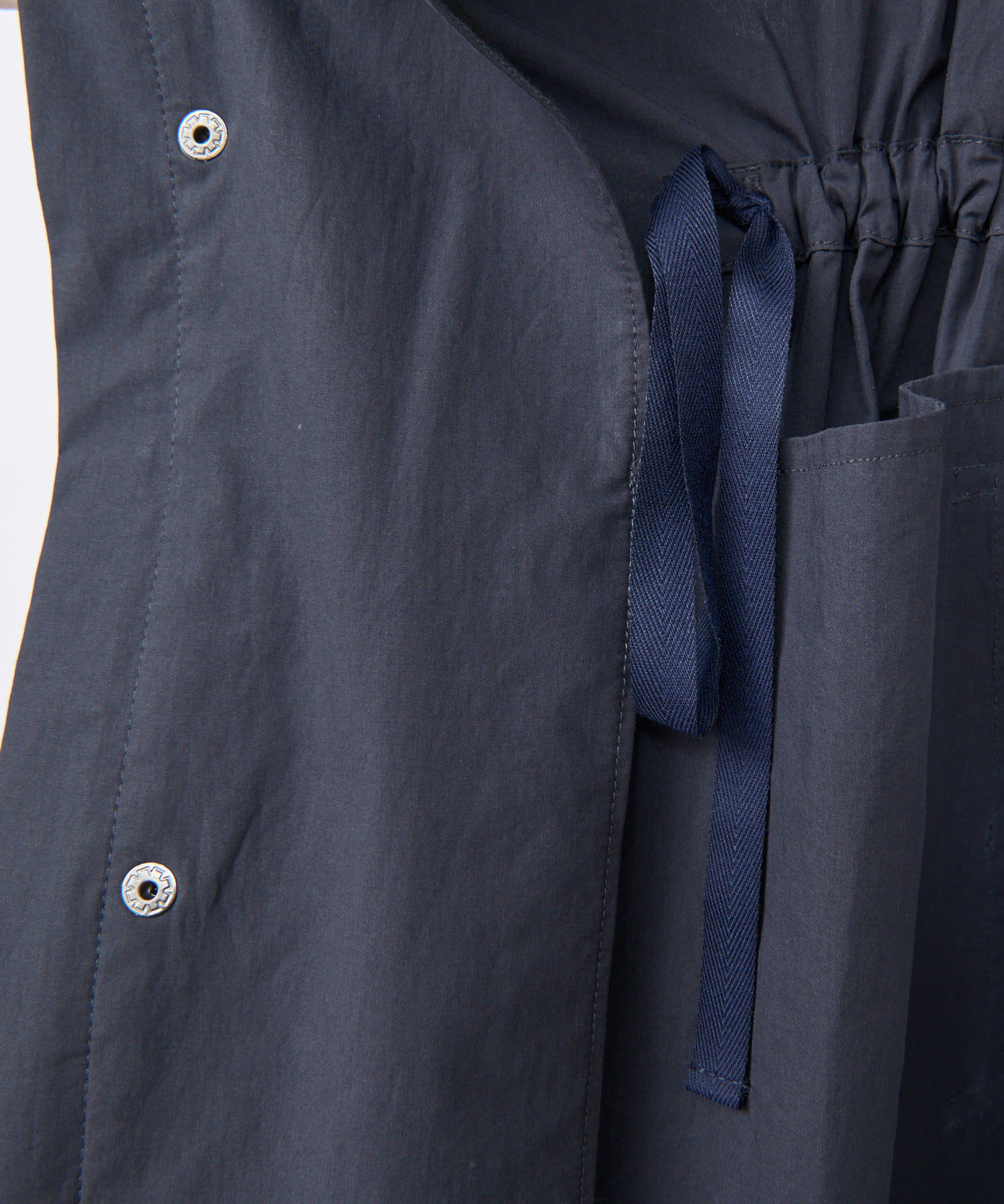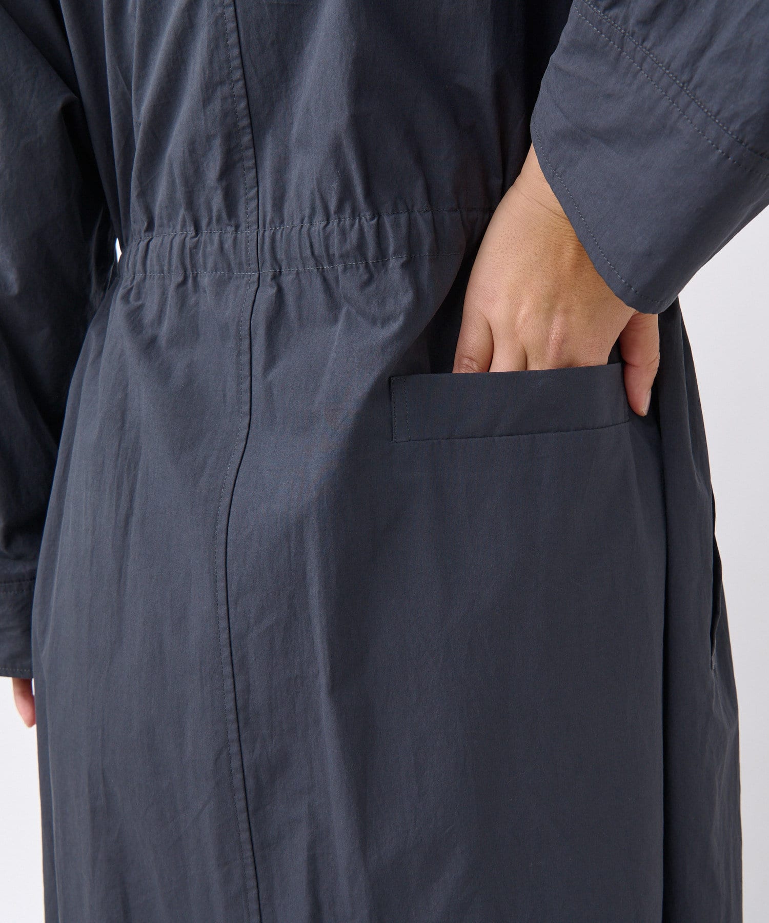ポケットが多いのも特徴的なデザインで、携帯が入る胸ポケット(ファスナー付)や、右ヒップのポケット(ドット釦付き)にはエコバッグやカードケース等も入る機能的な仕様のため、旅先や普段使いにも活躍する便利アイテムです。