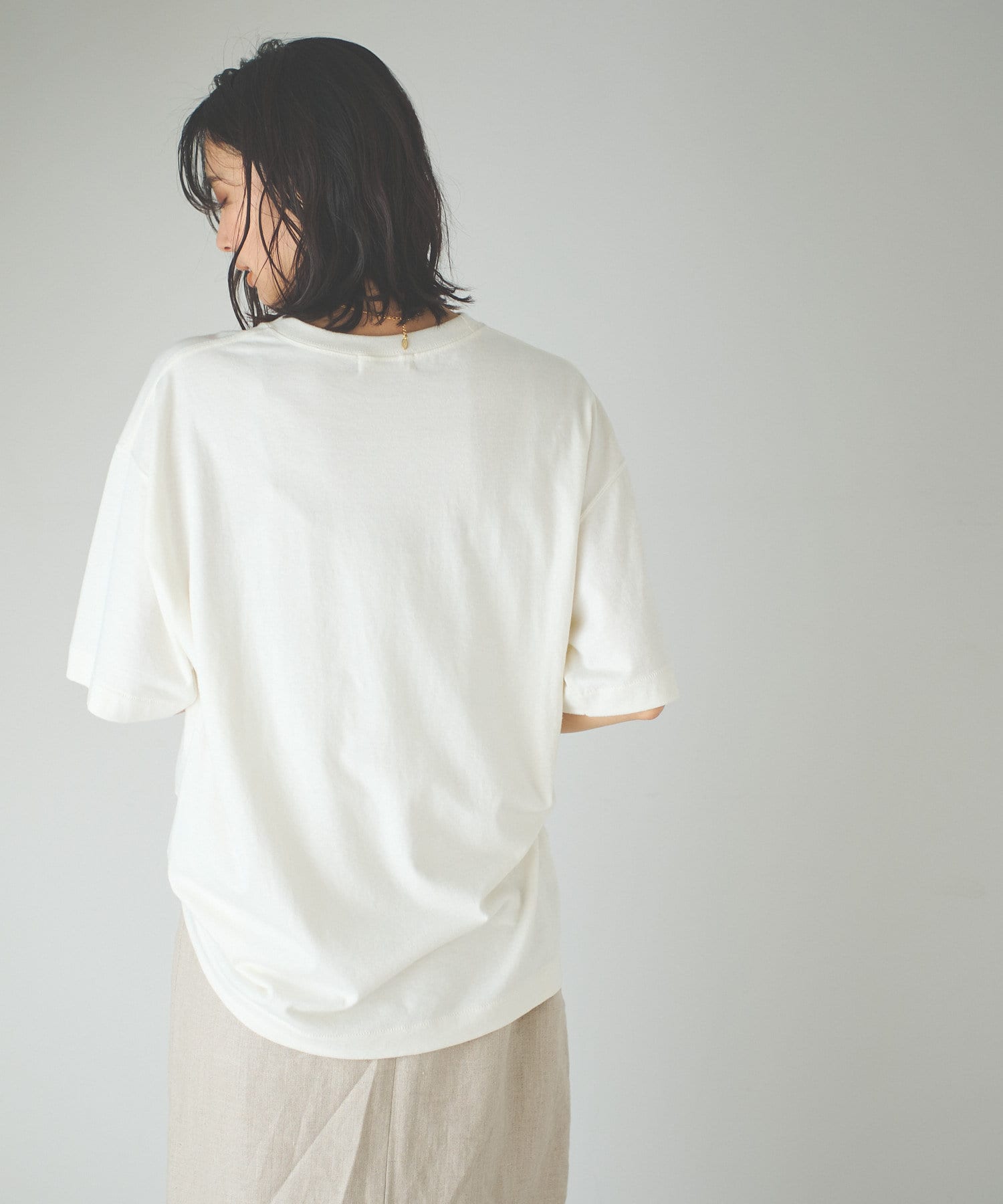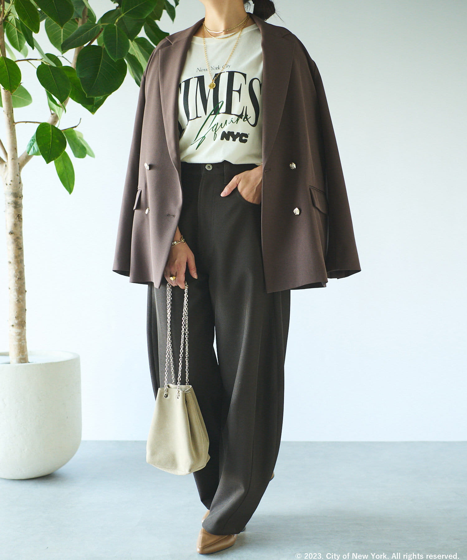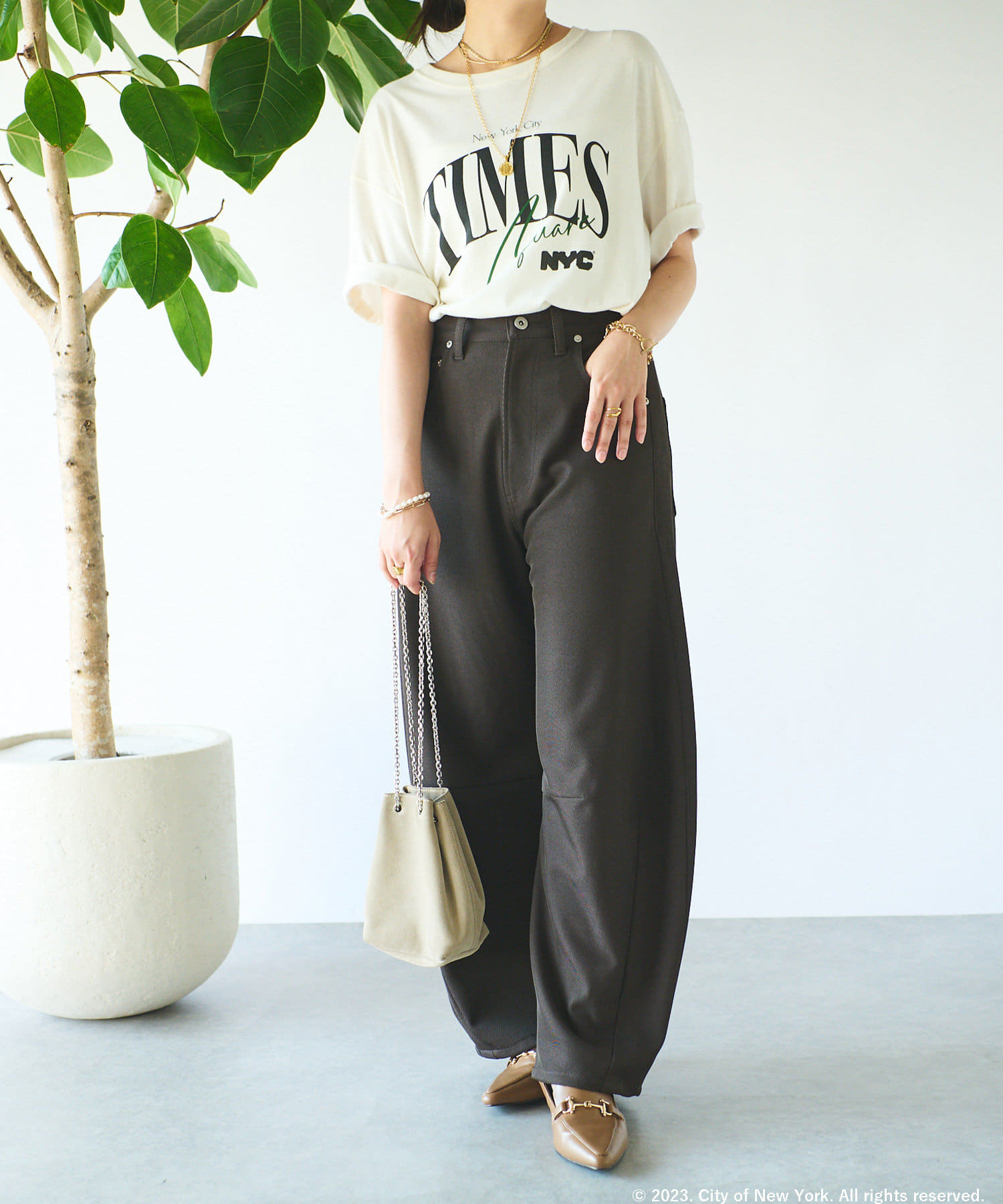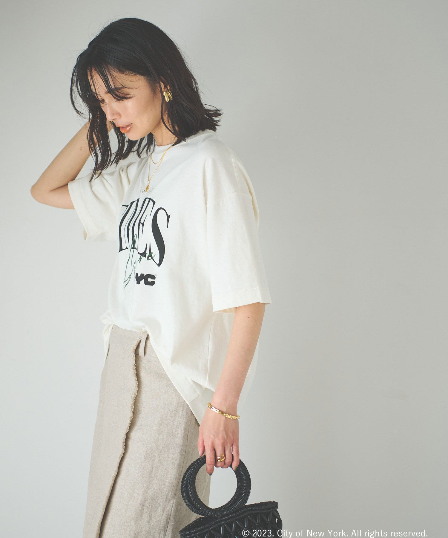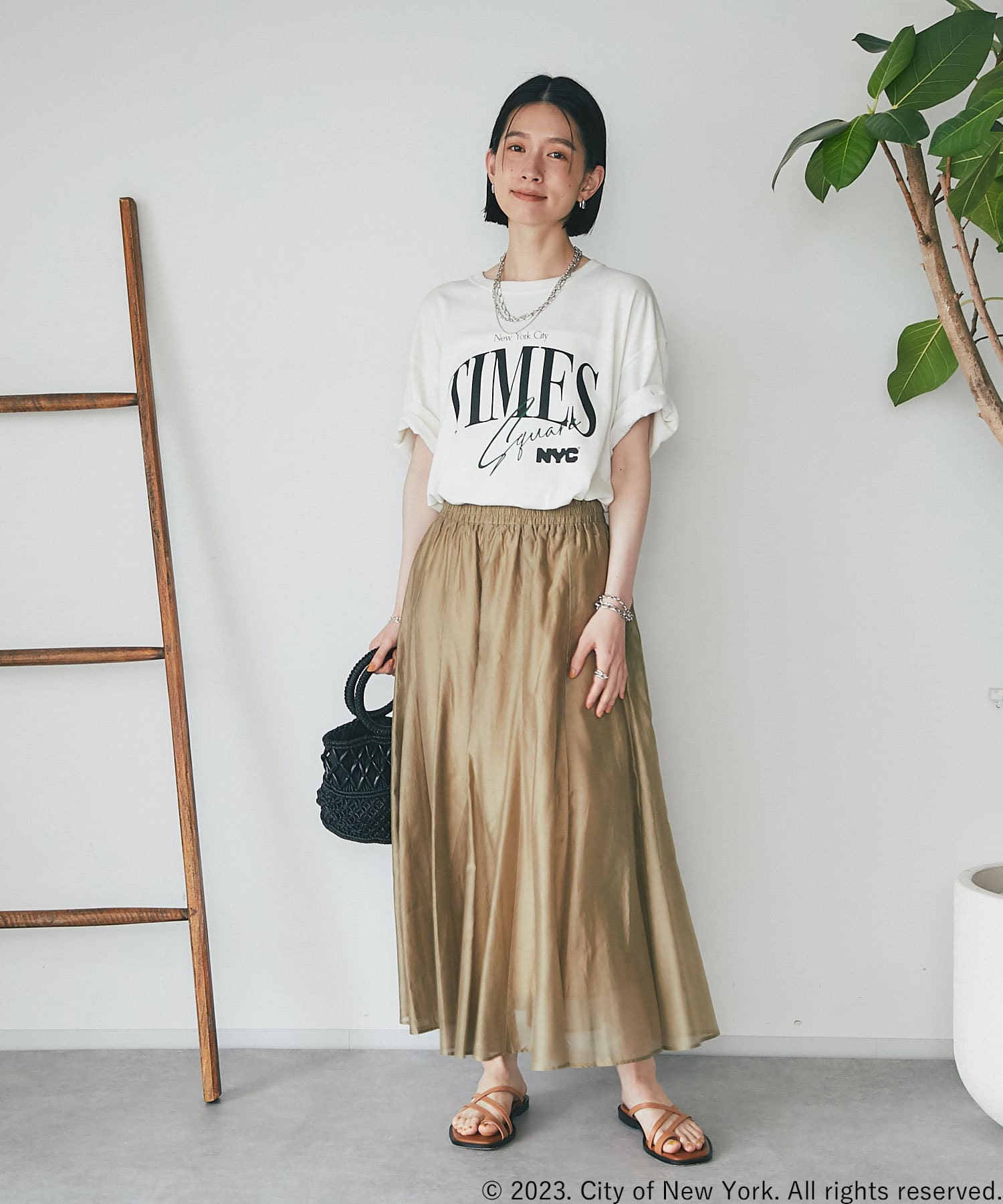 適度な抜け感のあるフェミニンな仕上がりの1枚。TIMES SQUAREのタイポグラフィーロゴも洗練された印象です。