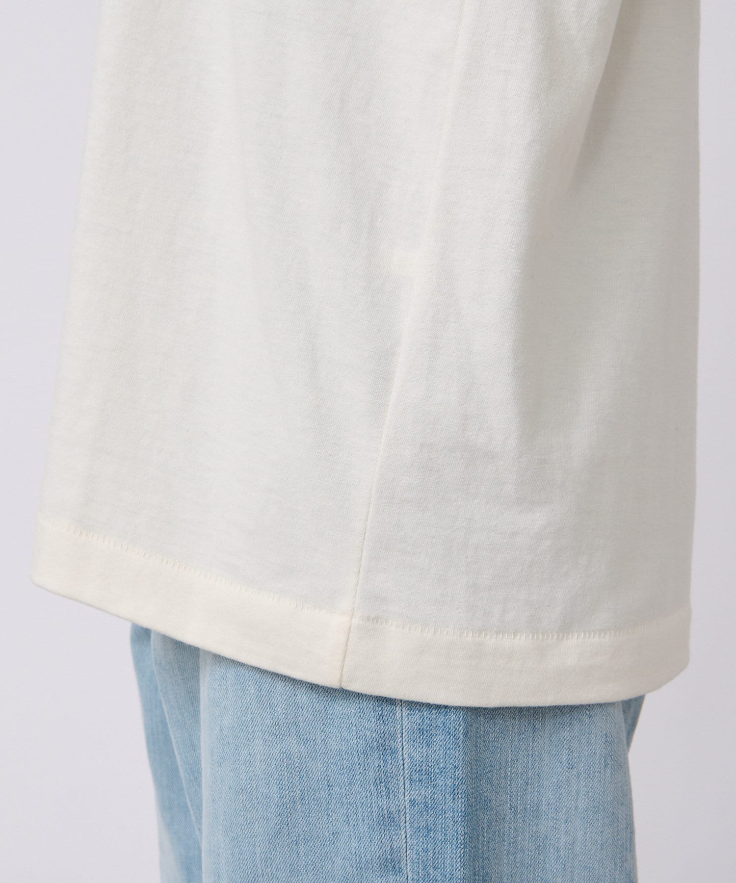 ⇒ゆったりとした着丈ですが生地自体は標準的な厚さですので、程よく身体のラインを拾い、小柄な方もすんなりといつものスタイルに取り入れていただけるかと思います。