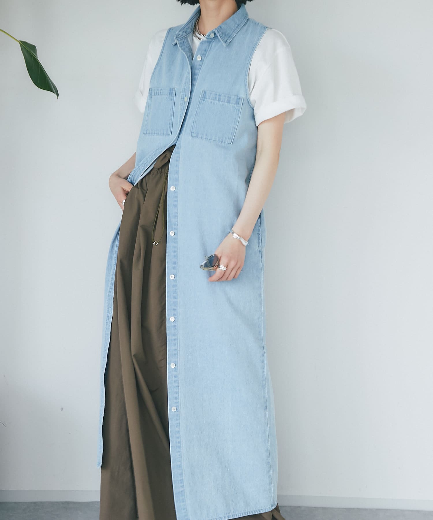 1枚でワンピースとしてはもちろん、前を開けてジレのようにレイヤードして着用いただくのもおすすめです。