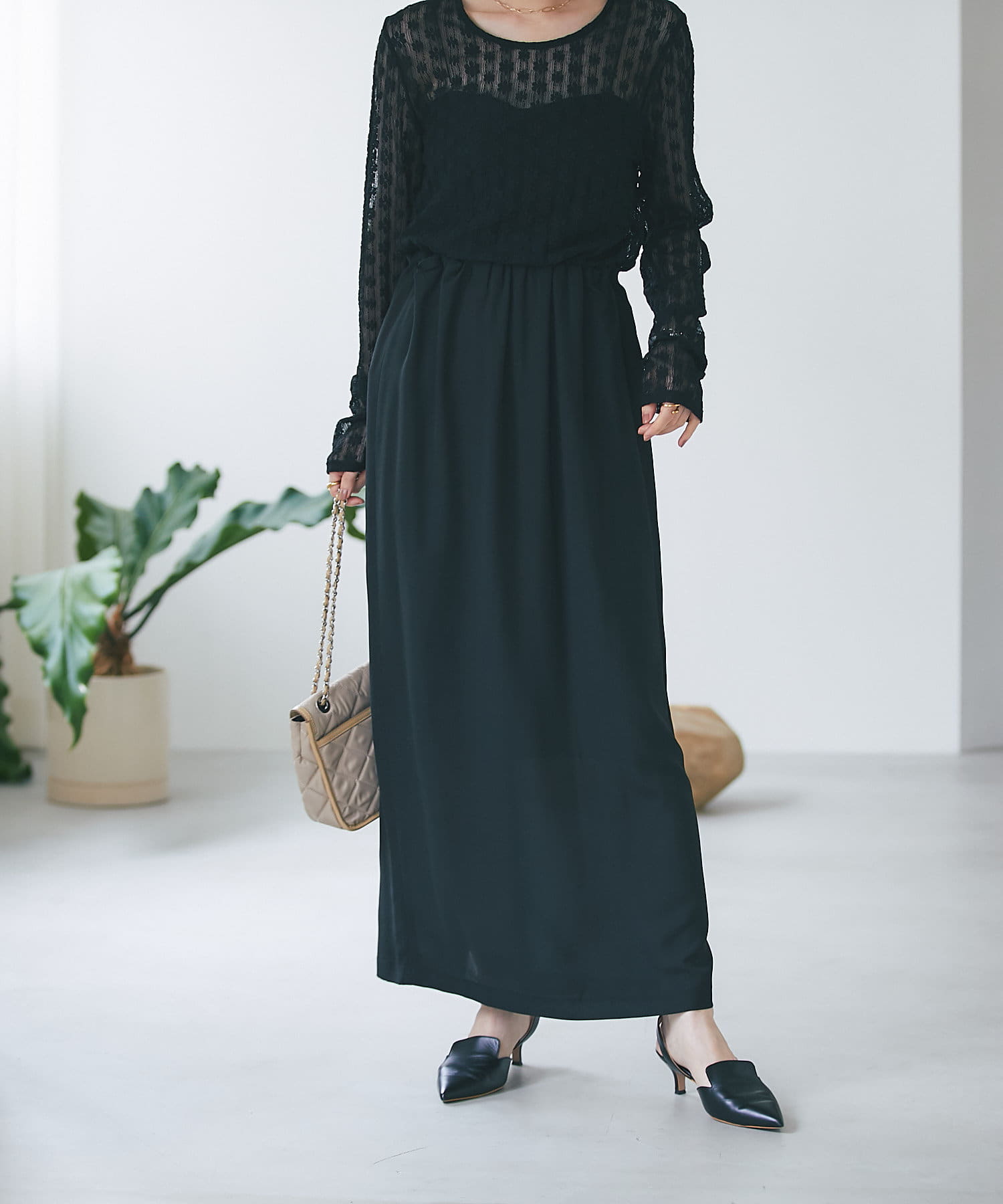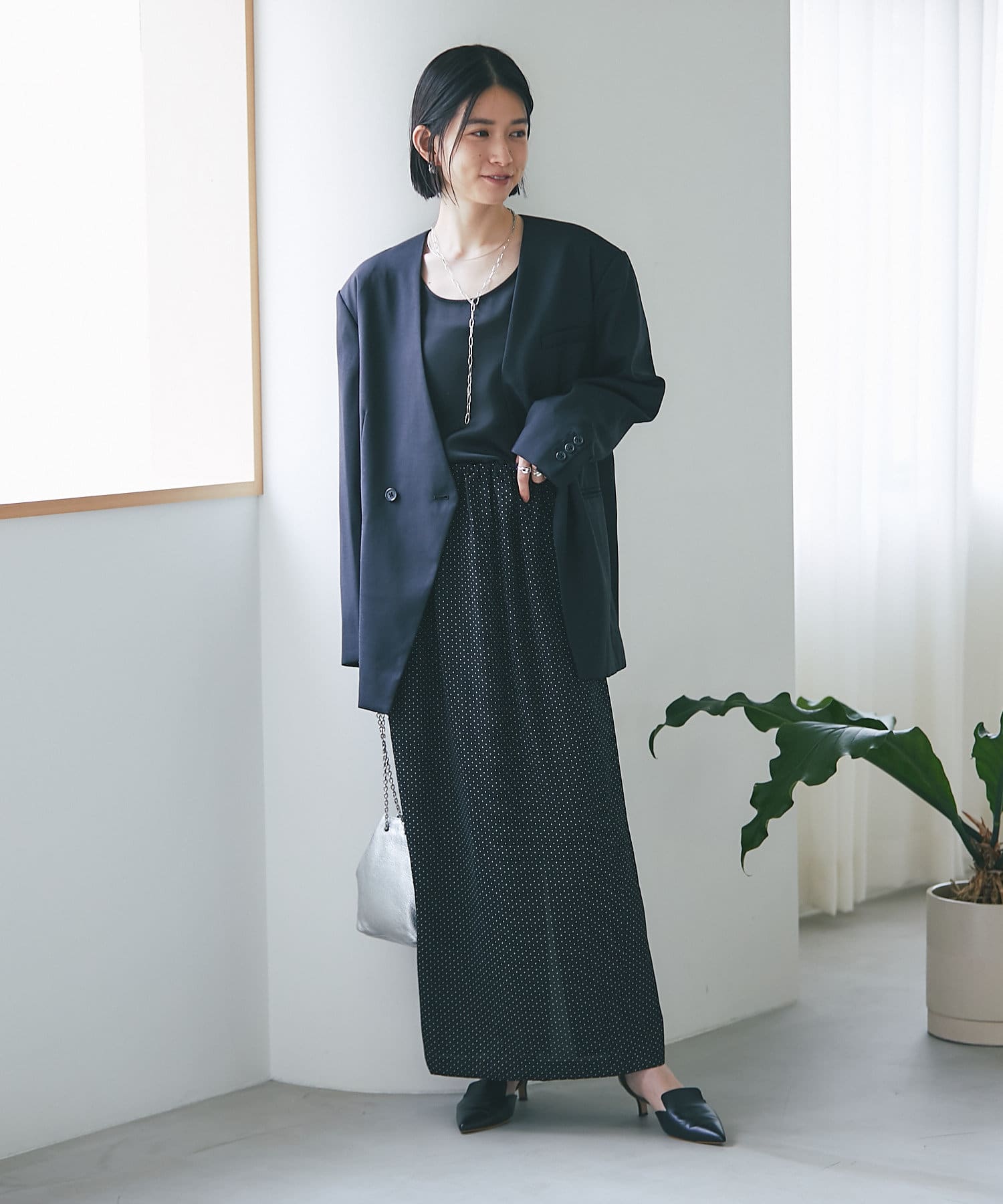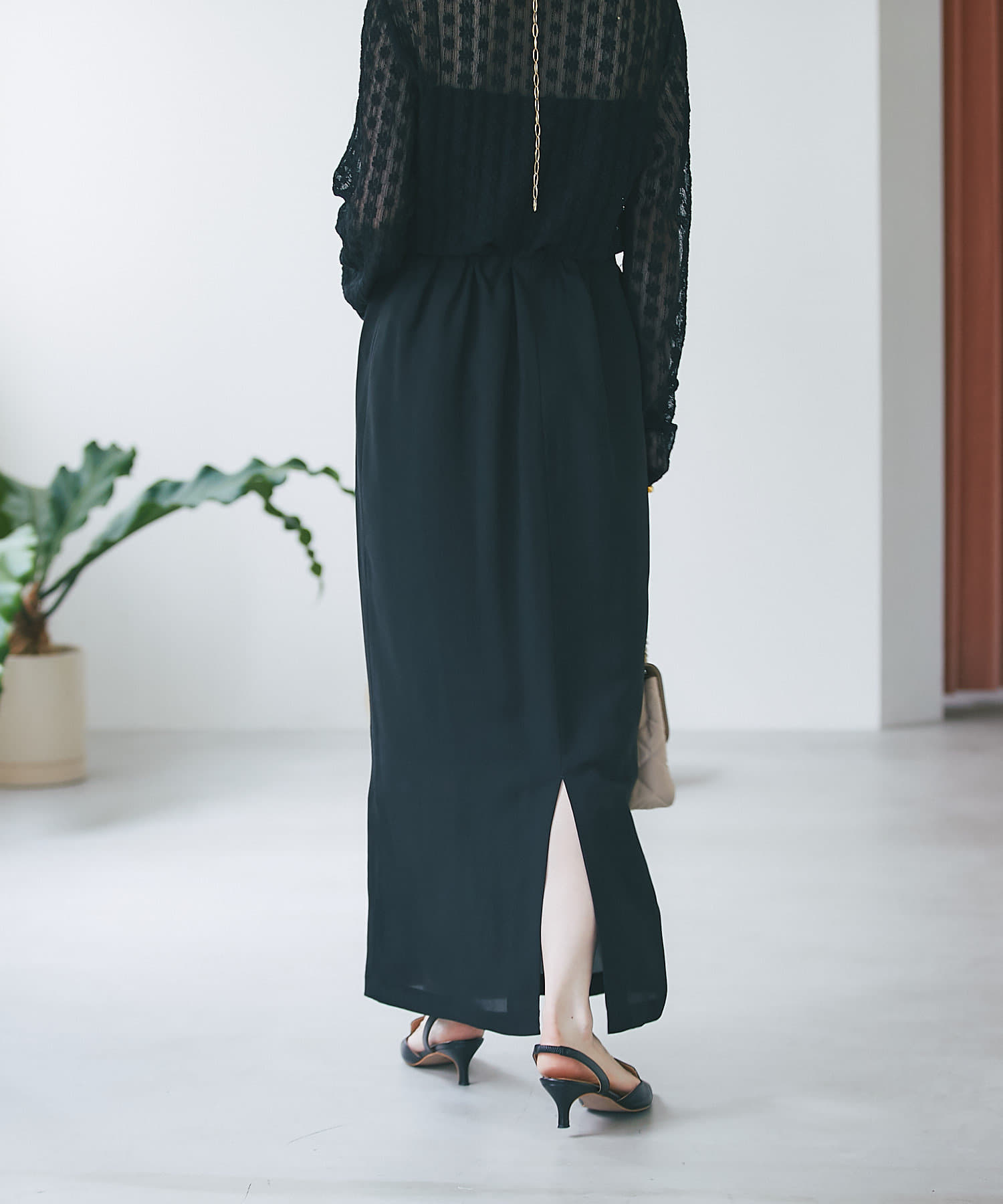 セットアップで着用いただくとワンピースライクに着用いただけるのでオススメです。