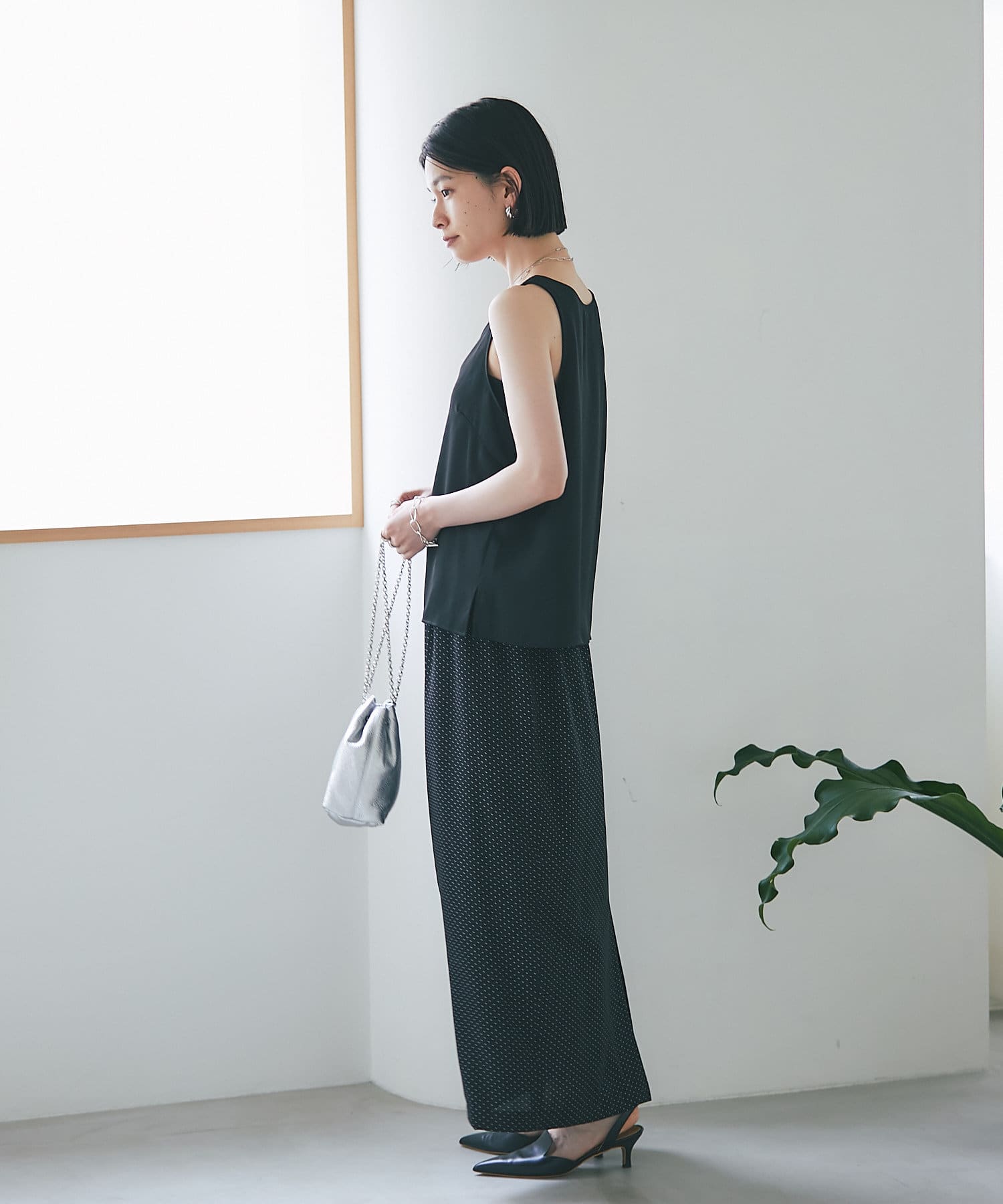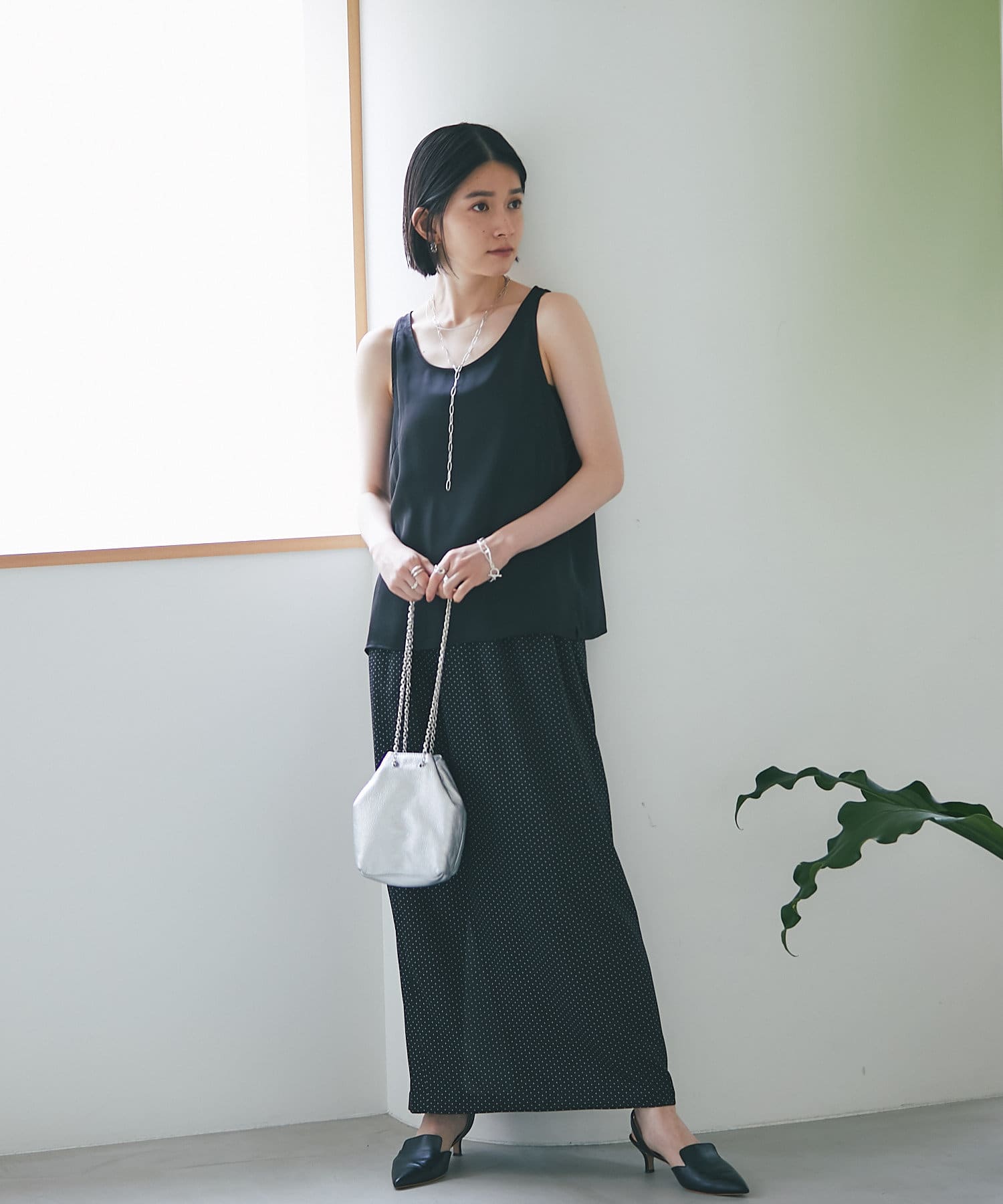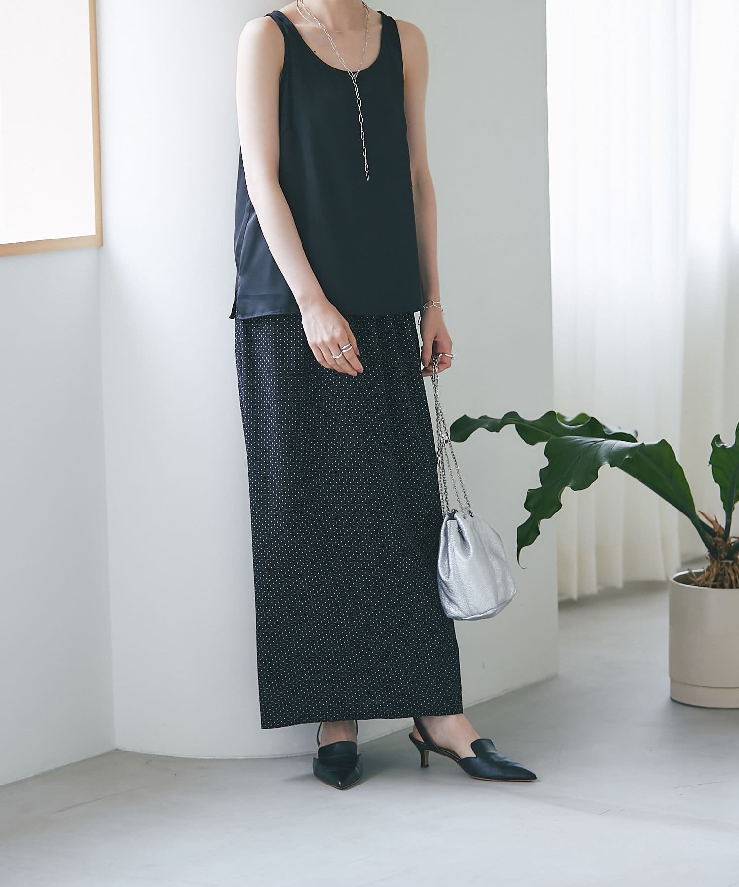 光沢、とろみ、シアー感ある素材を軸に、ドレスアップできるアイテムを展開。