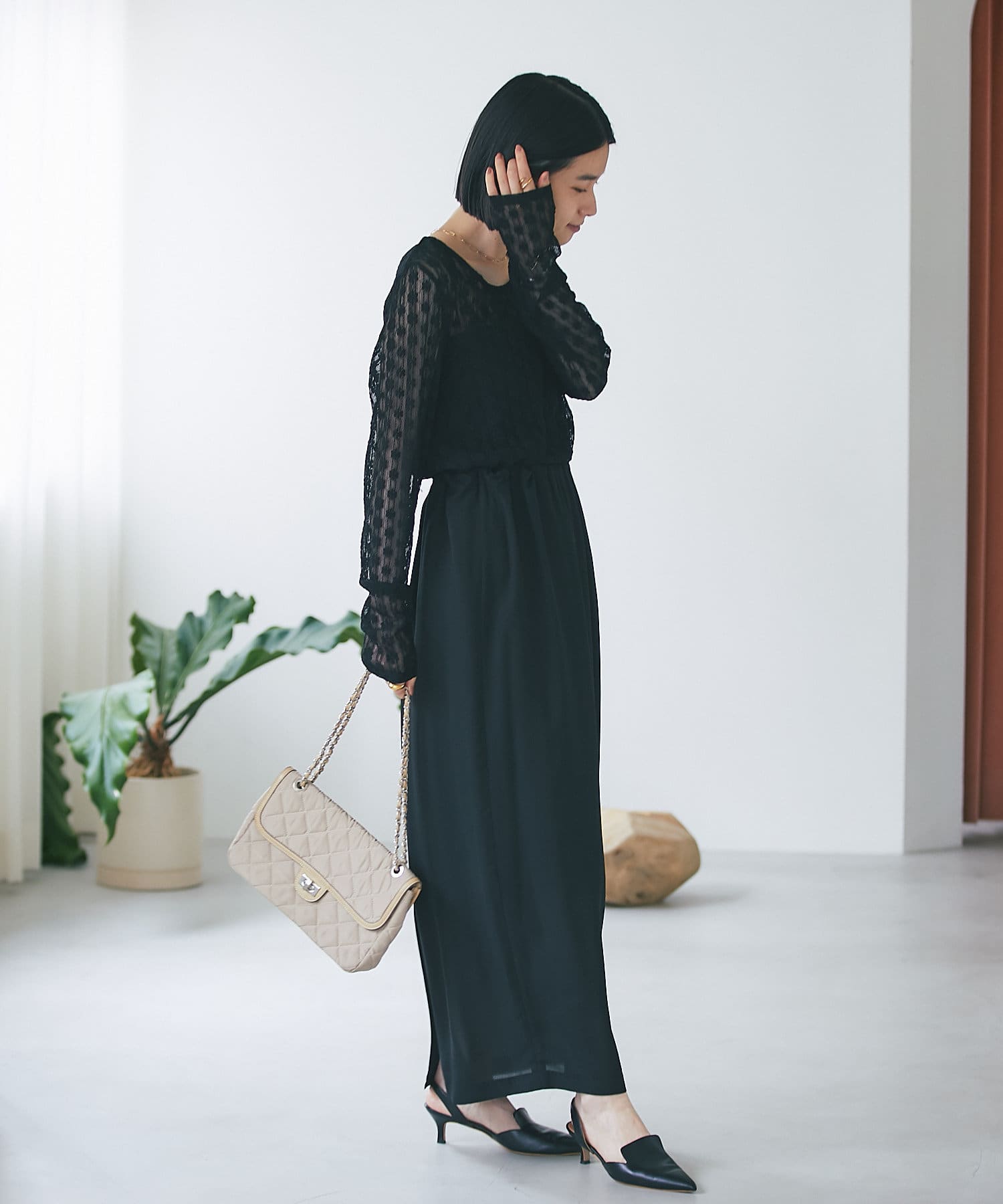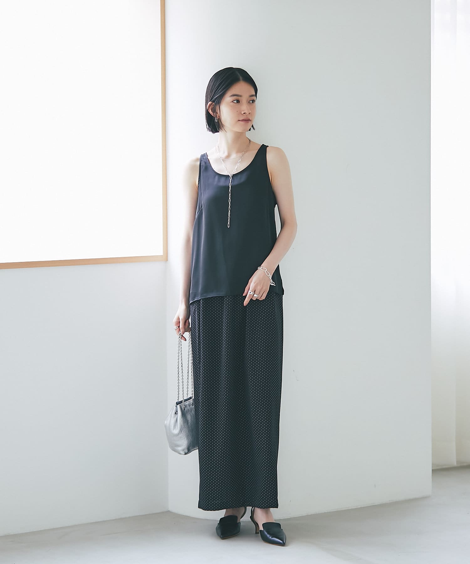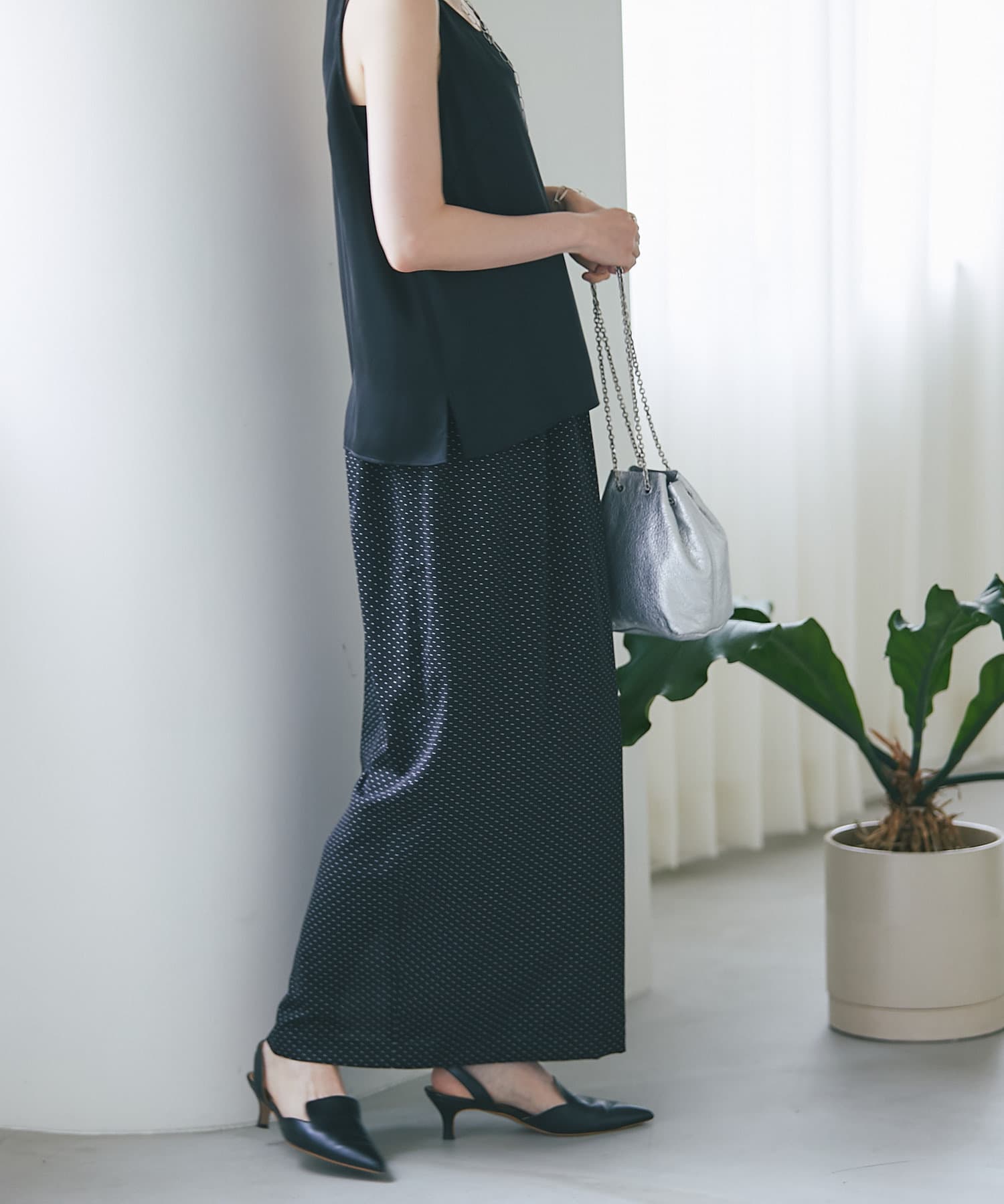 光沢、とろみ、シアー感ある素材を軸に、ドレスアップできるアイテムを展開。