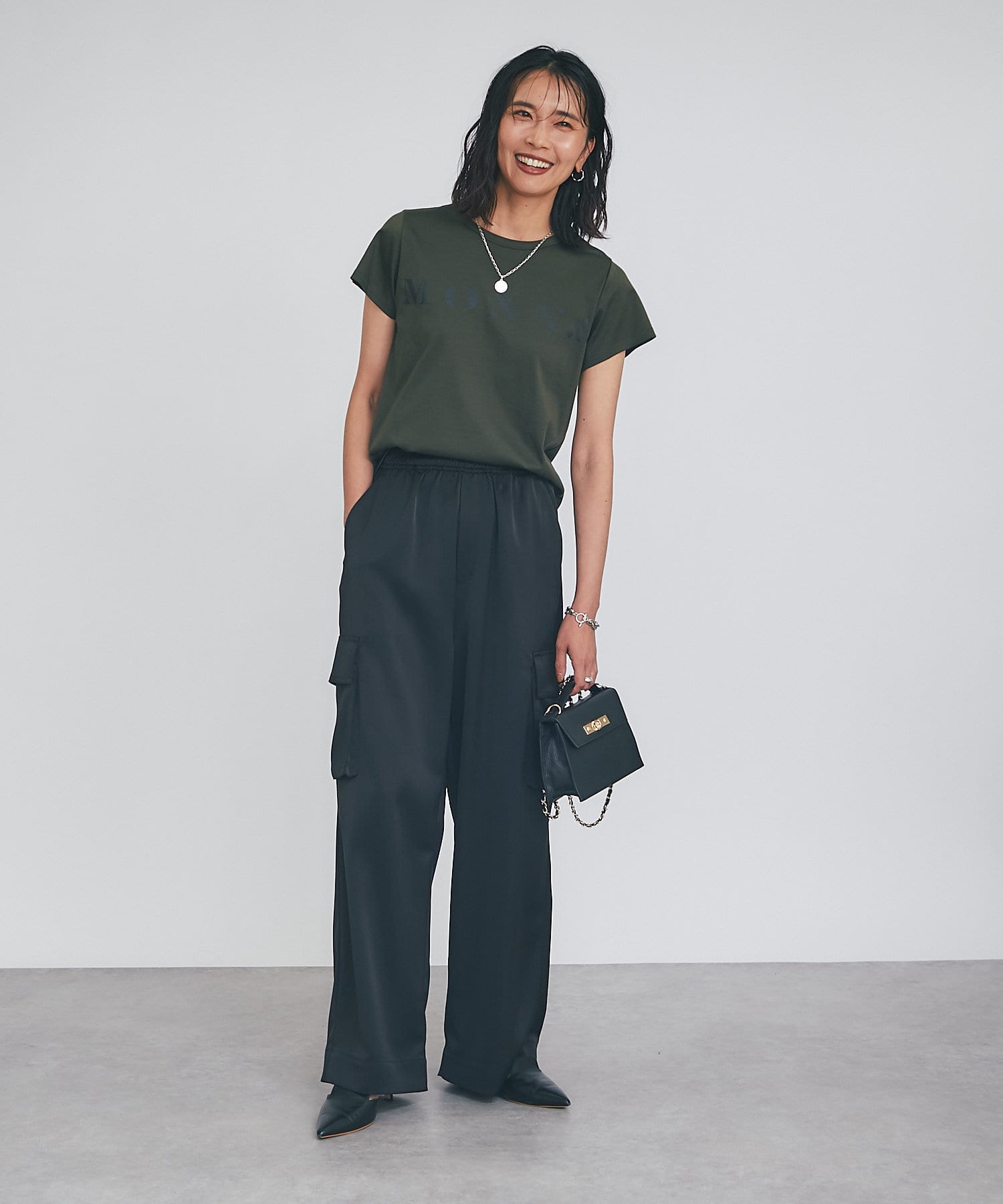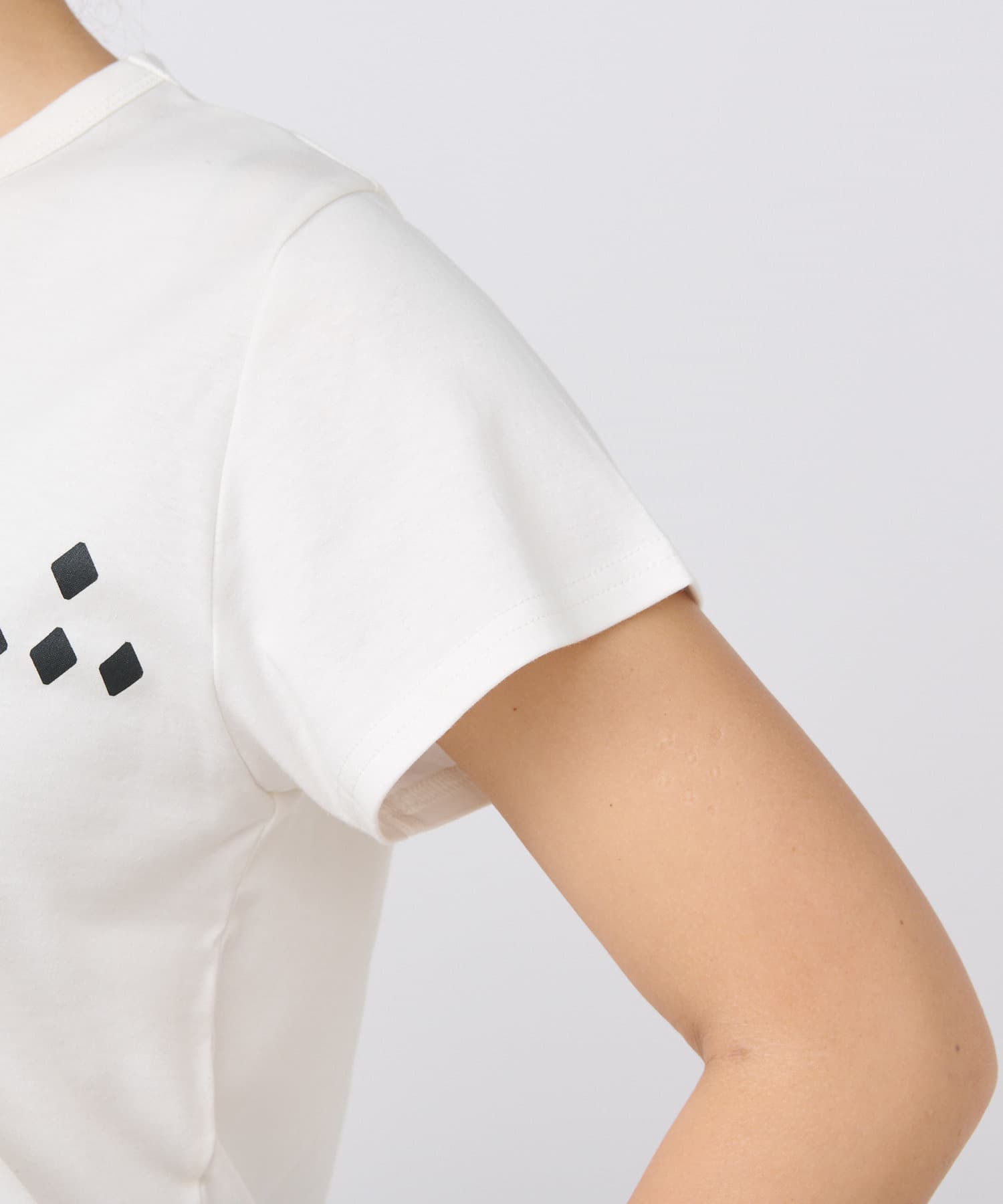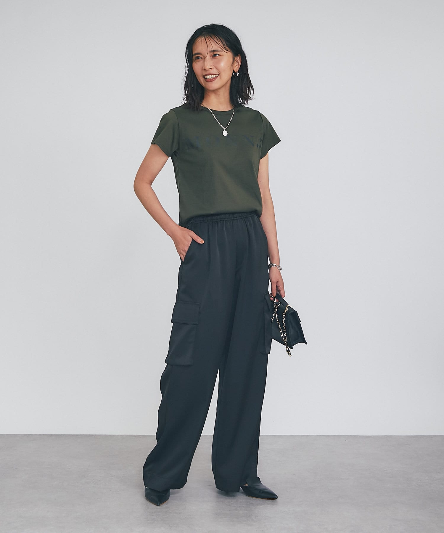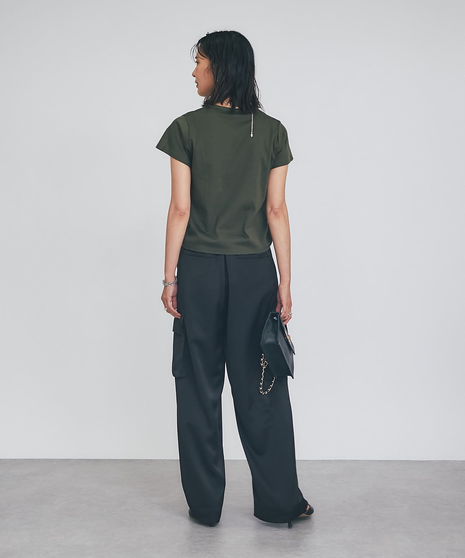シンプルで華奢見えするシルエットなので、ボトムにワイドパンツやフレアスカートなどボリューム感のあるアイテムを合わせてもバランスがとりやすいTシャツ。