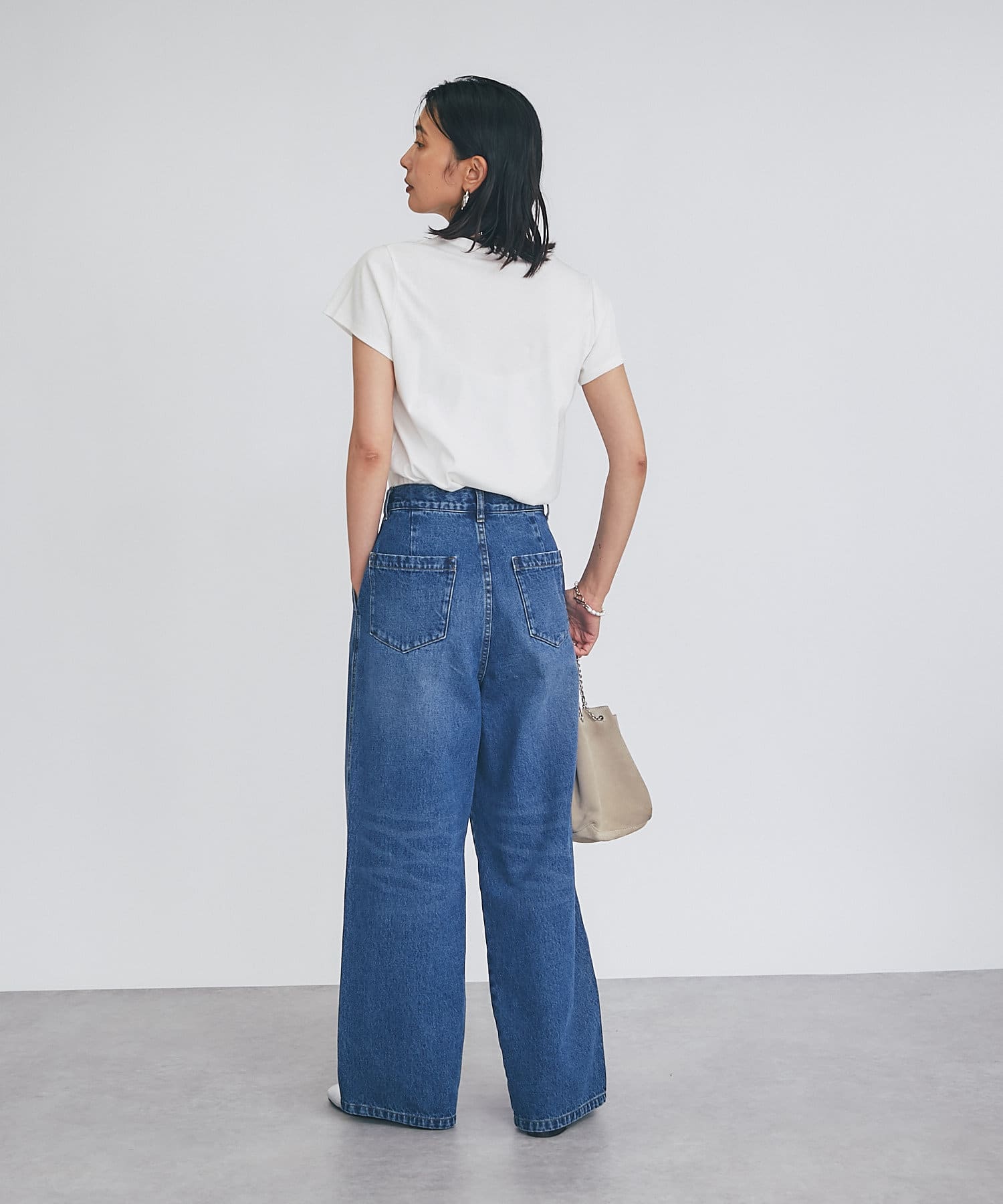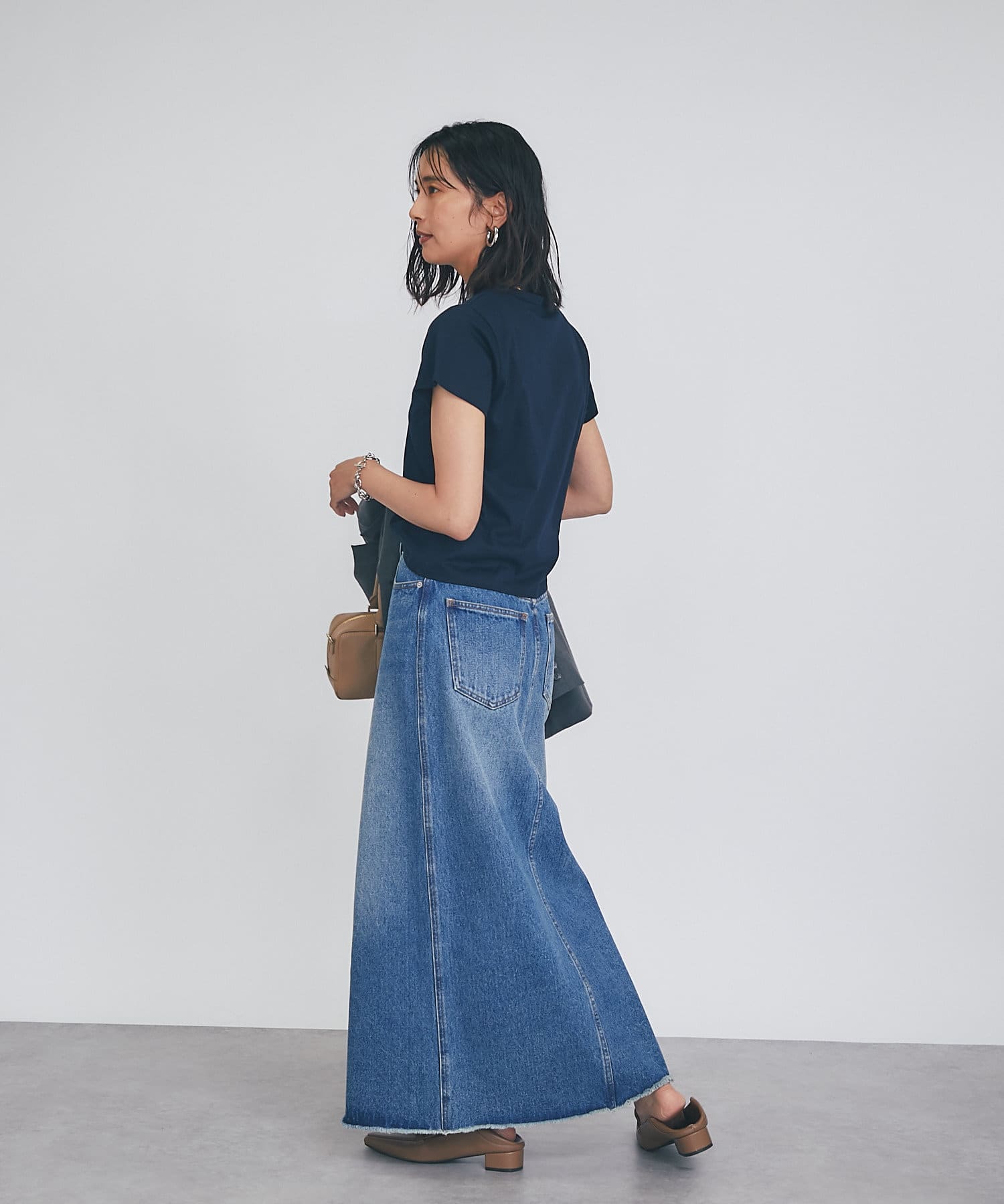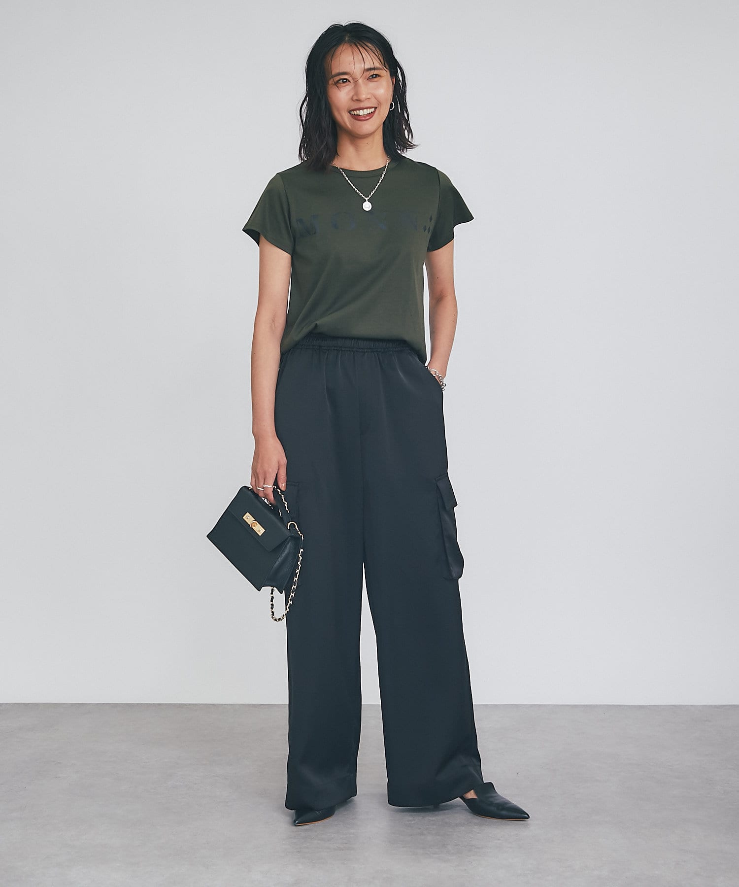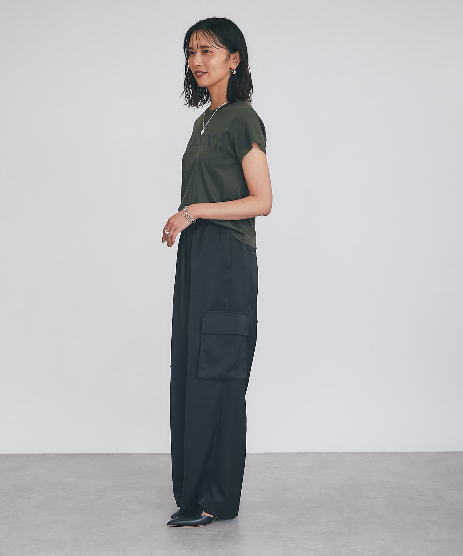 シンプルで華奢見えするシルエットなので、ボトムにワイドパンツやフレアスカートなどボリューム感のあるアイテムを合わせてもバランスがとりやすいTシャツ。