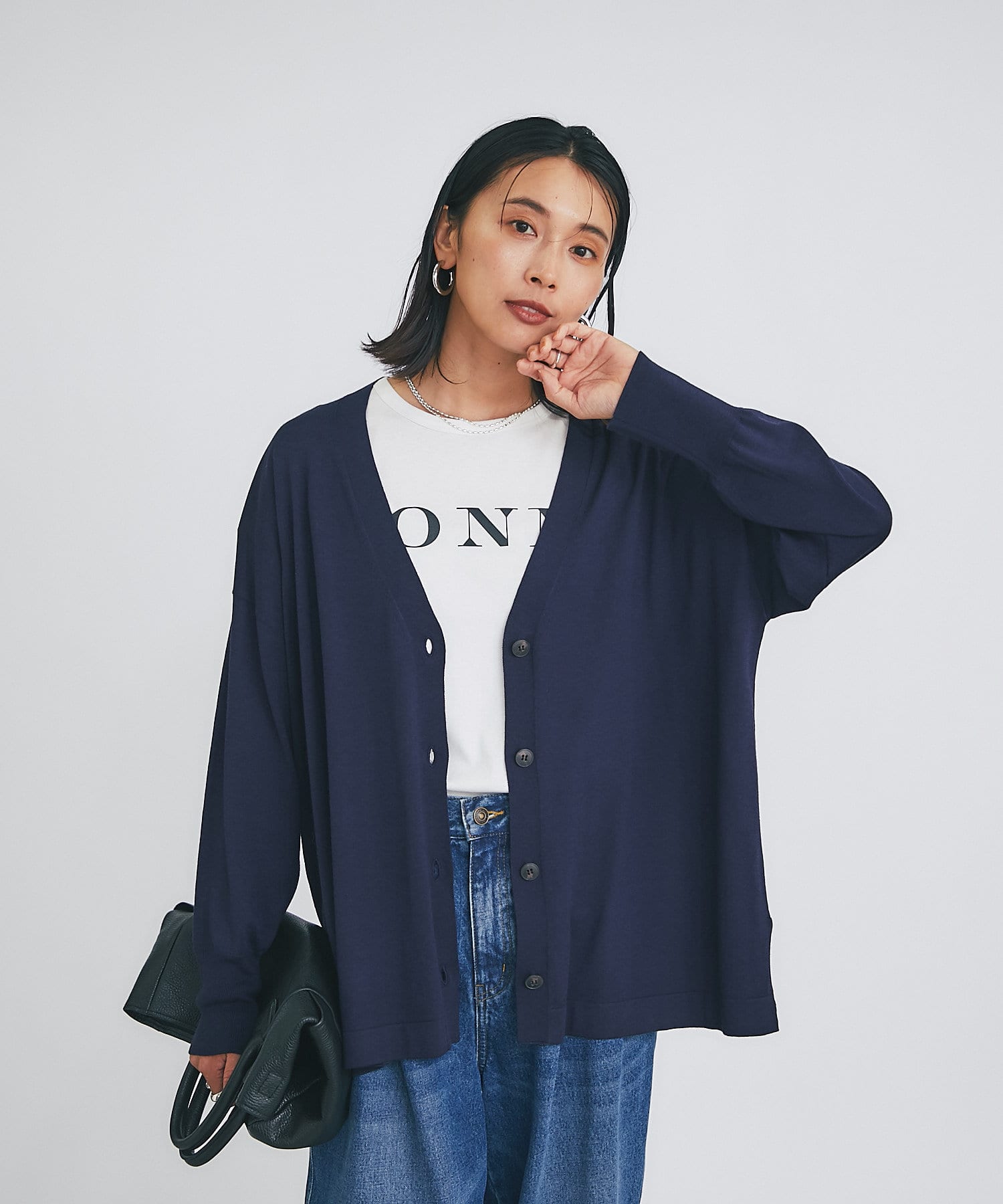 スカートやパンツ、デニムなど、ボトムを選ばない便利なアイテムです。