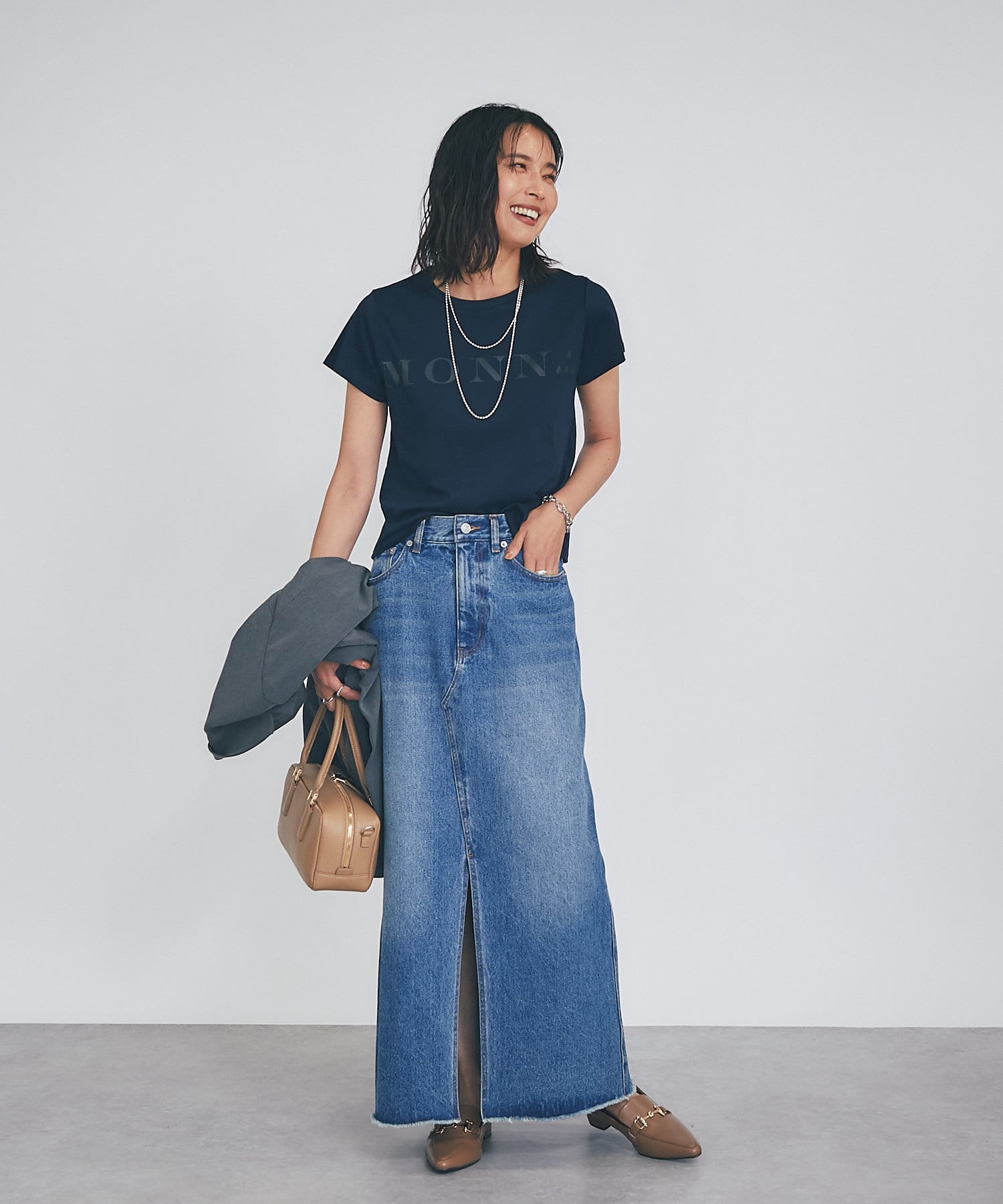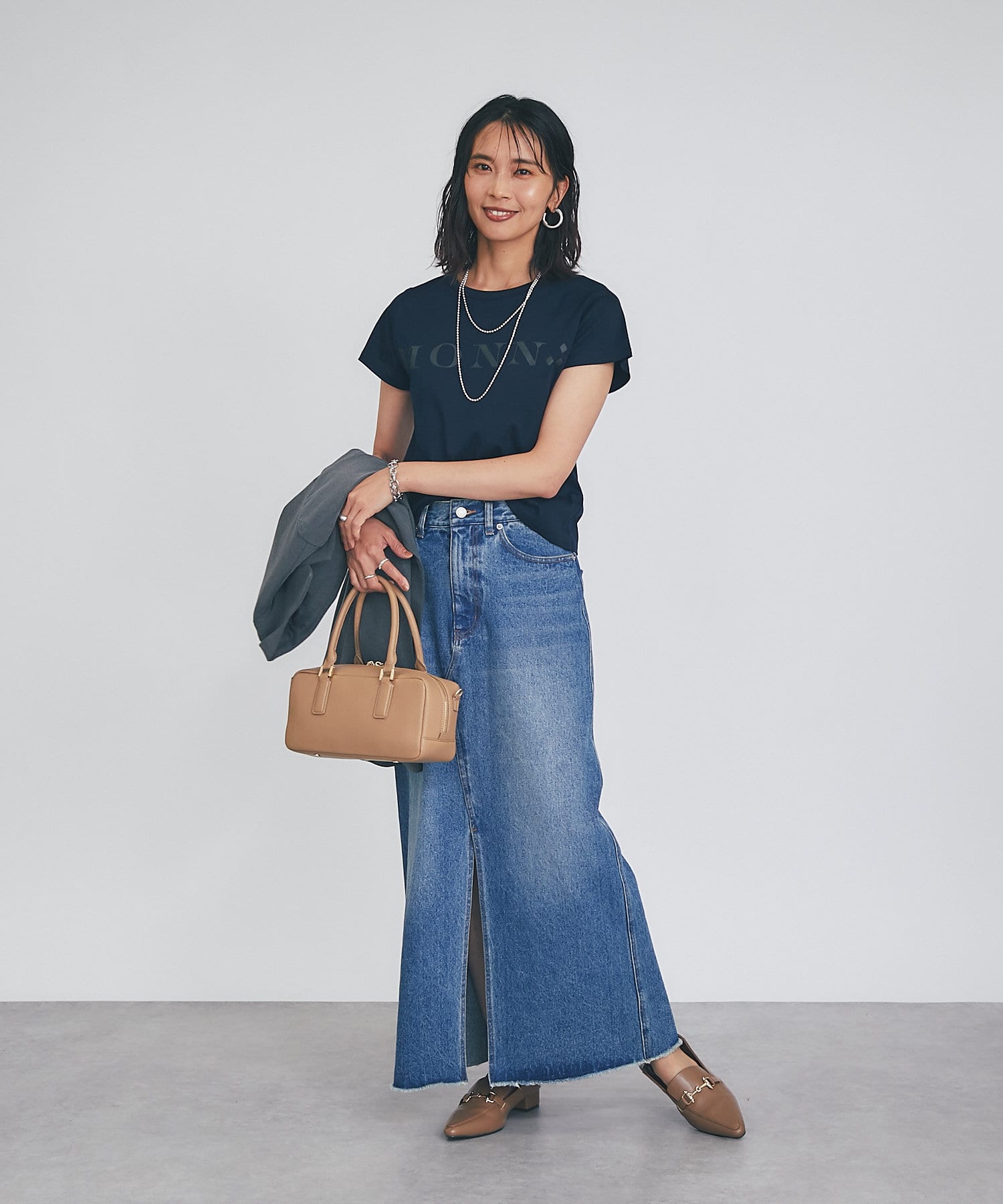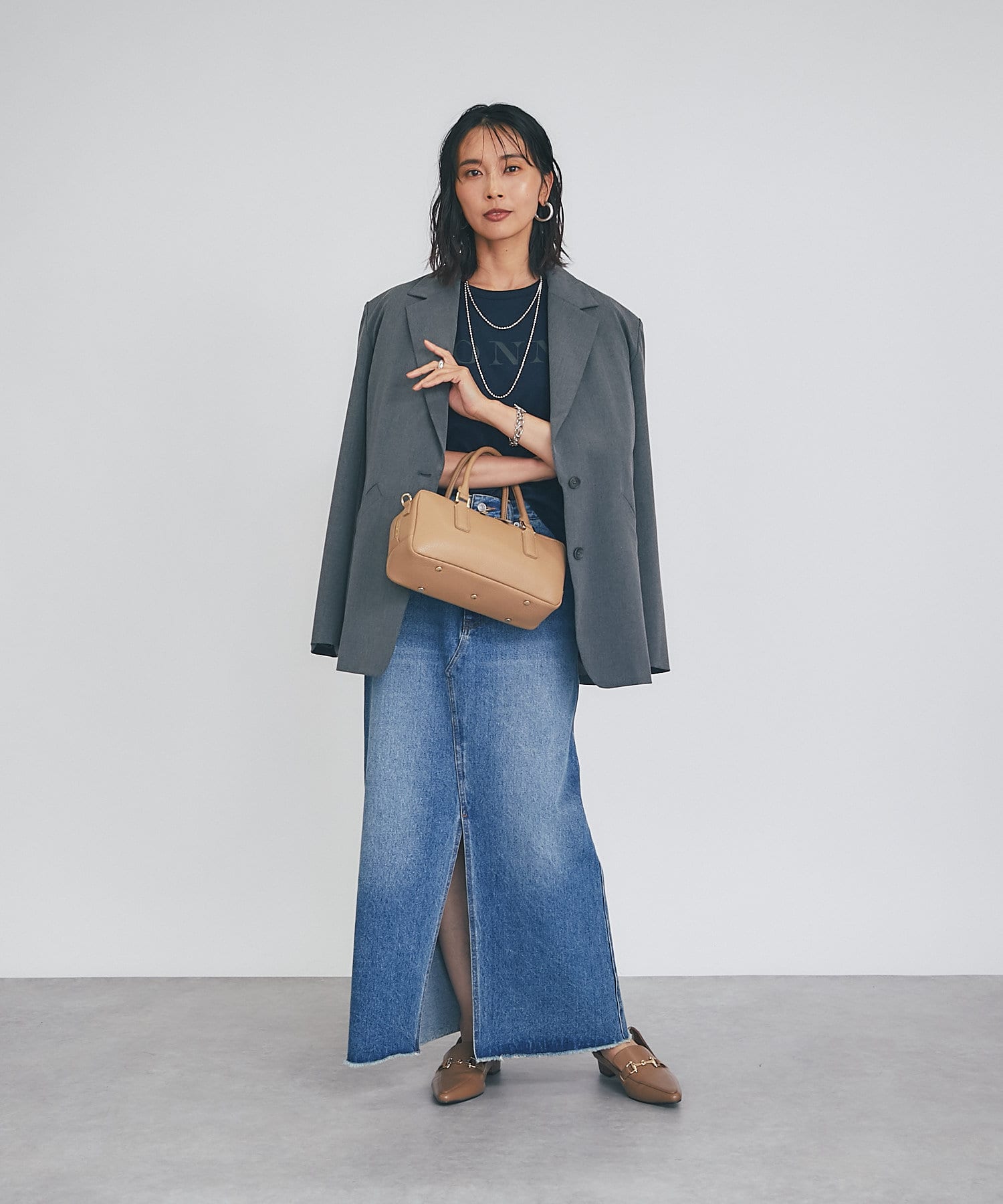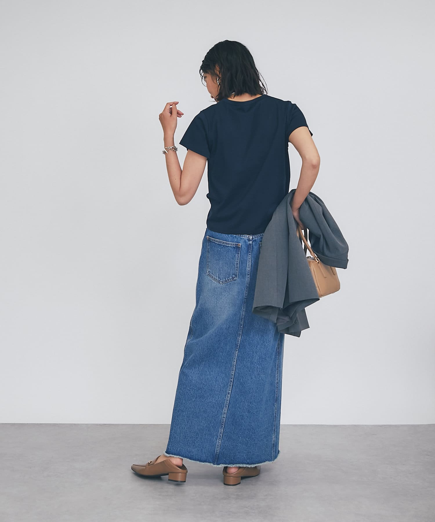 タイトスカートと合わせるとIラインのすっきりしたシルエットを楽しめます。
