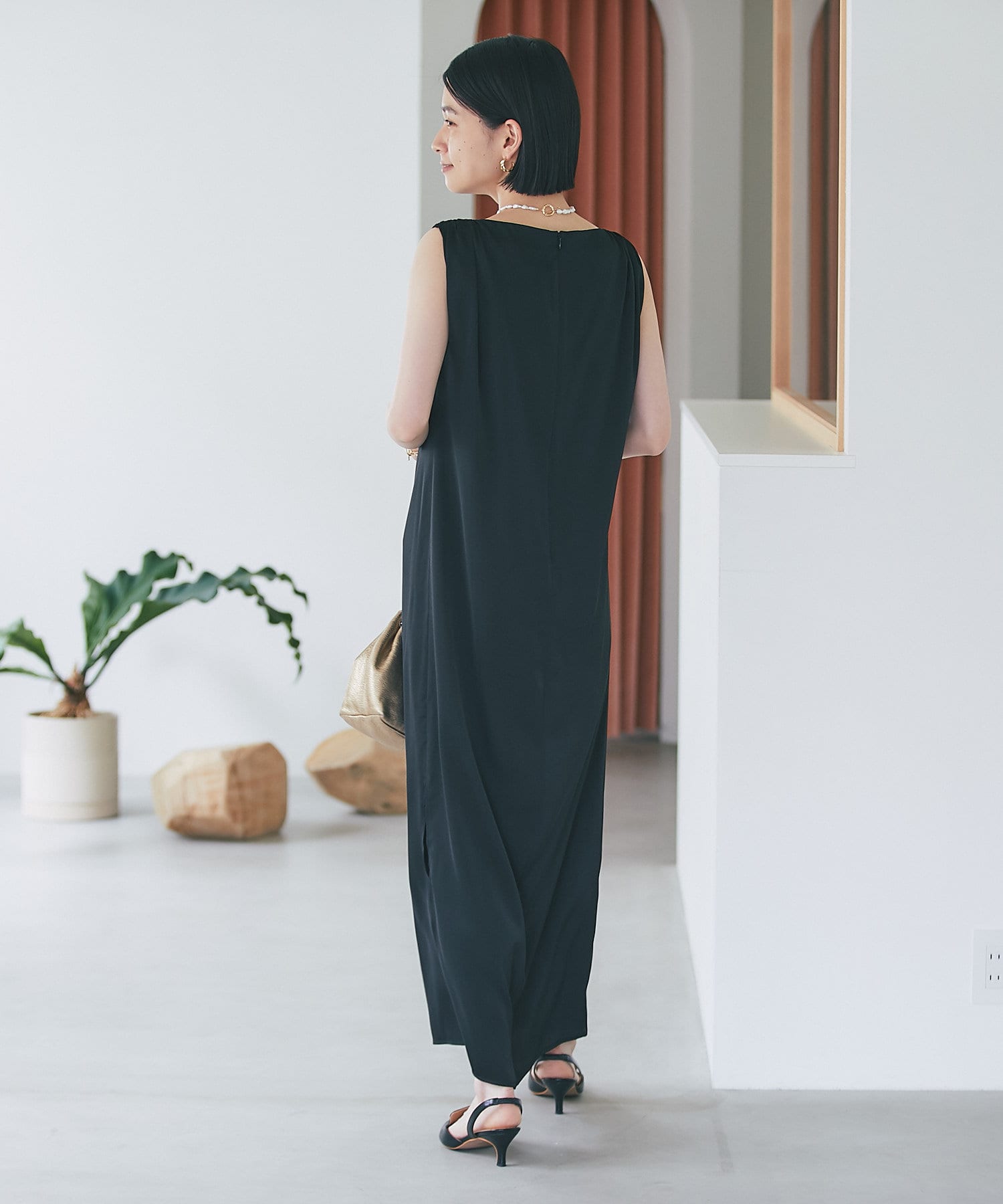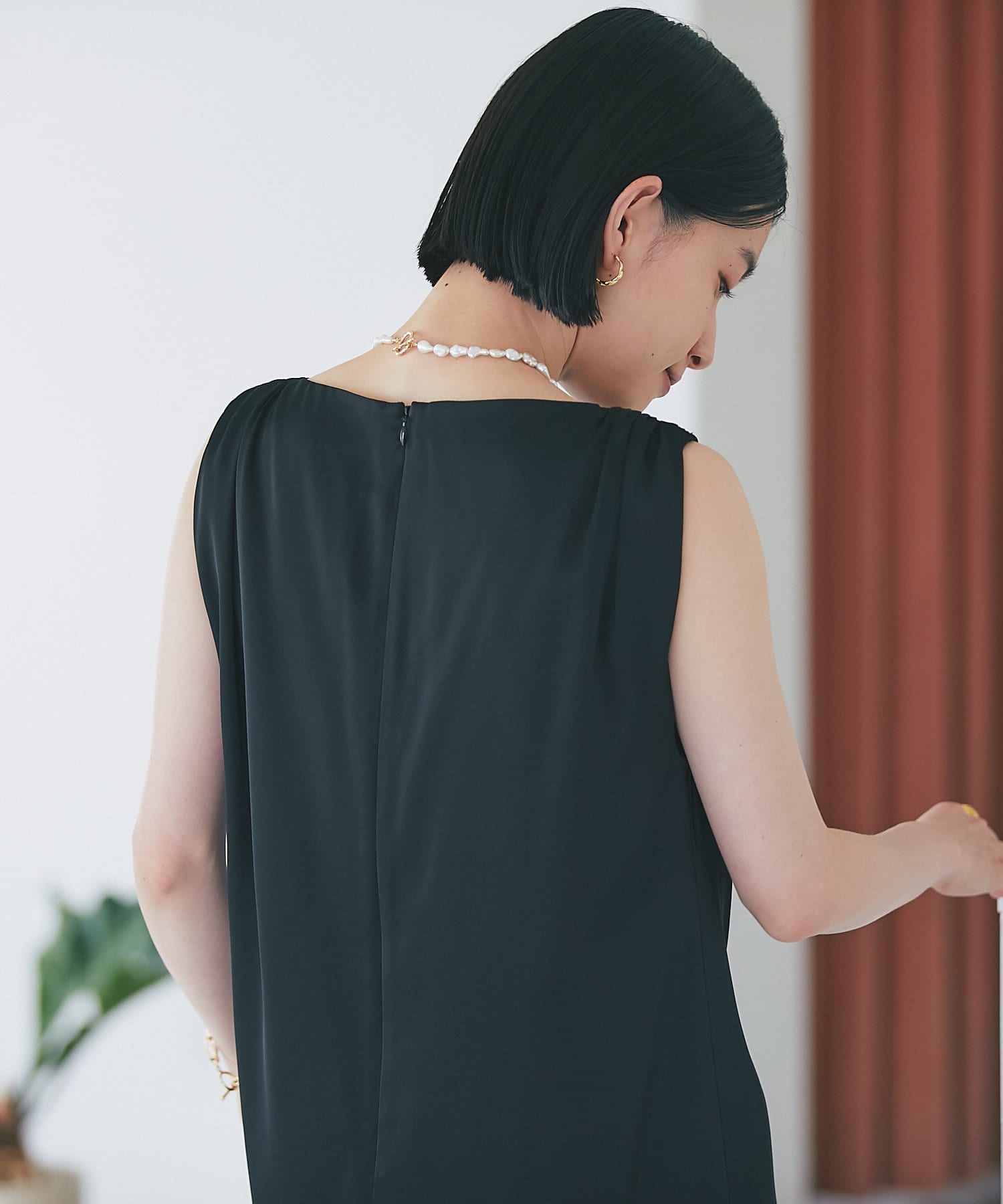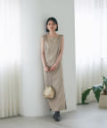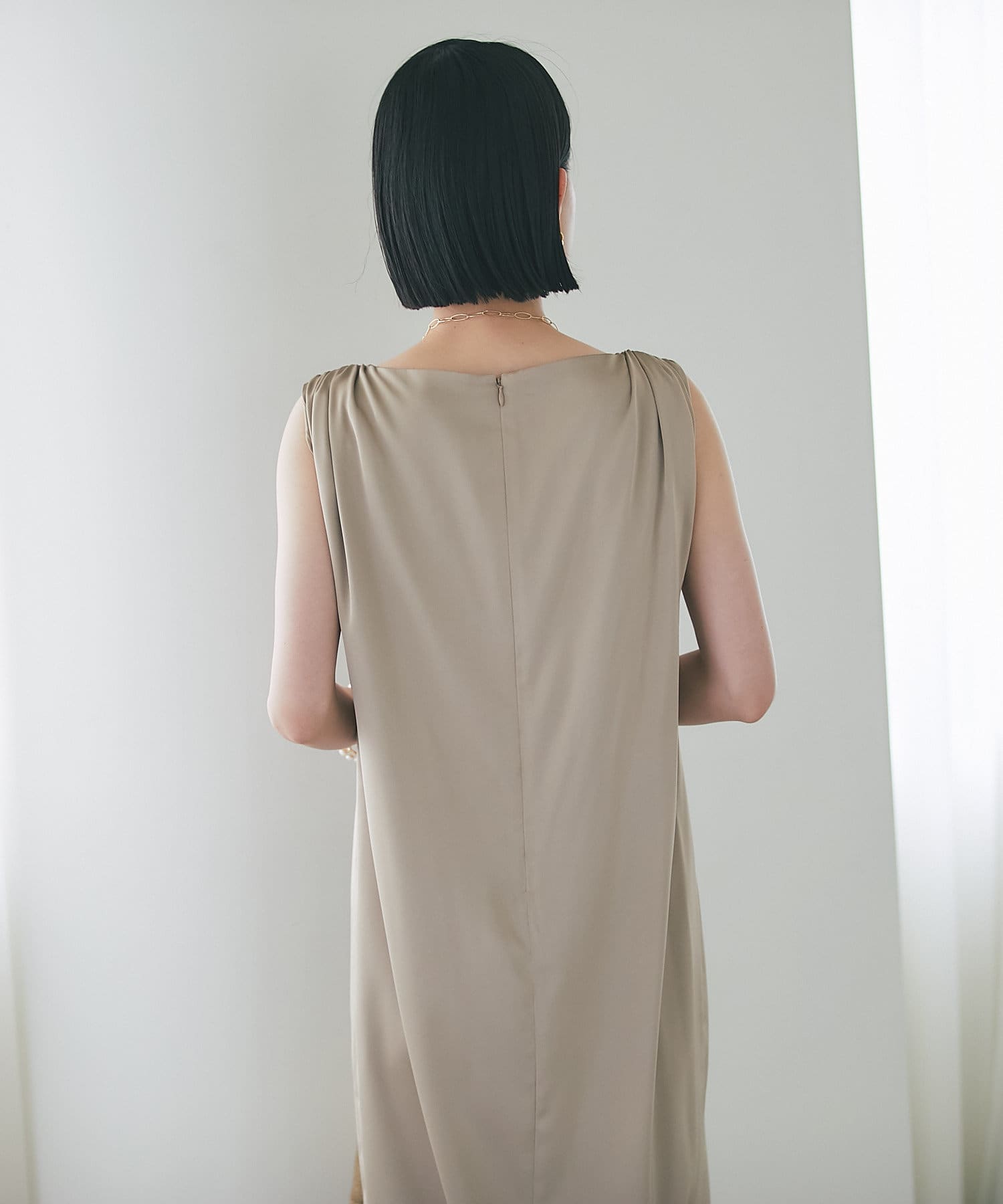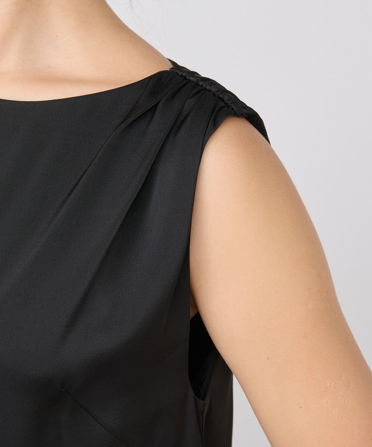 ノースリーブのデザインですが肩のギャザーのボリュームで肩回りを華奢な印象に見せてくれます。