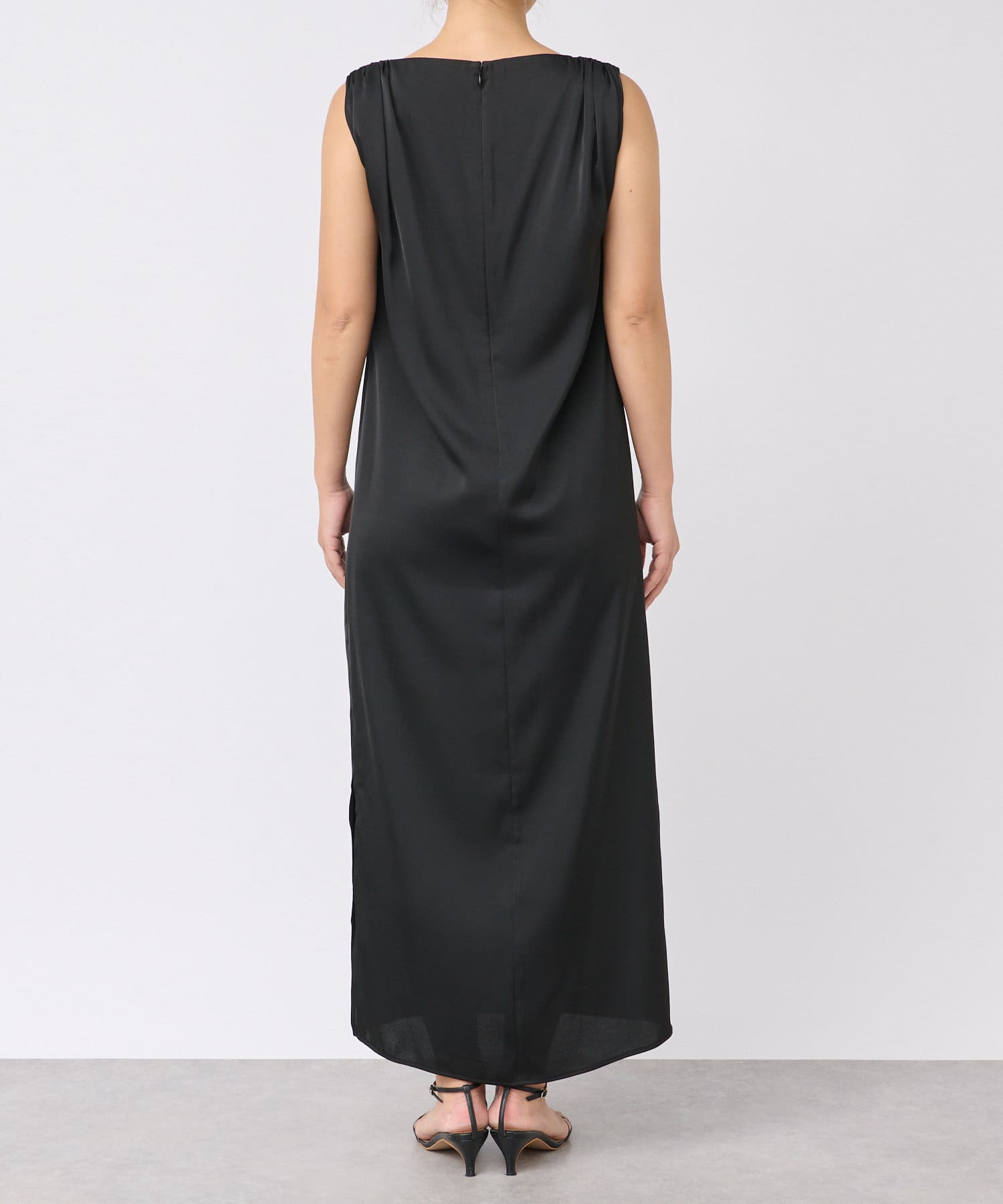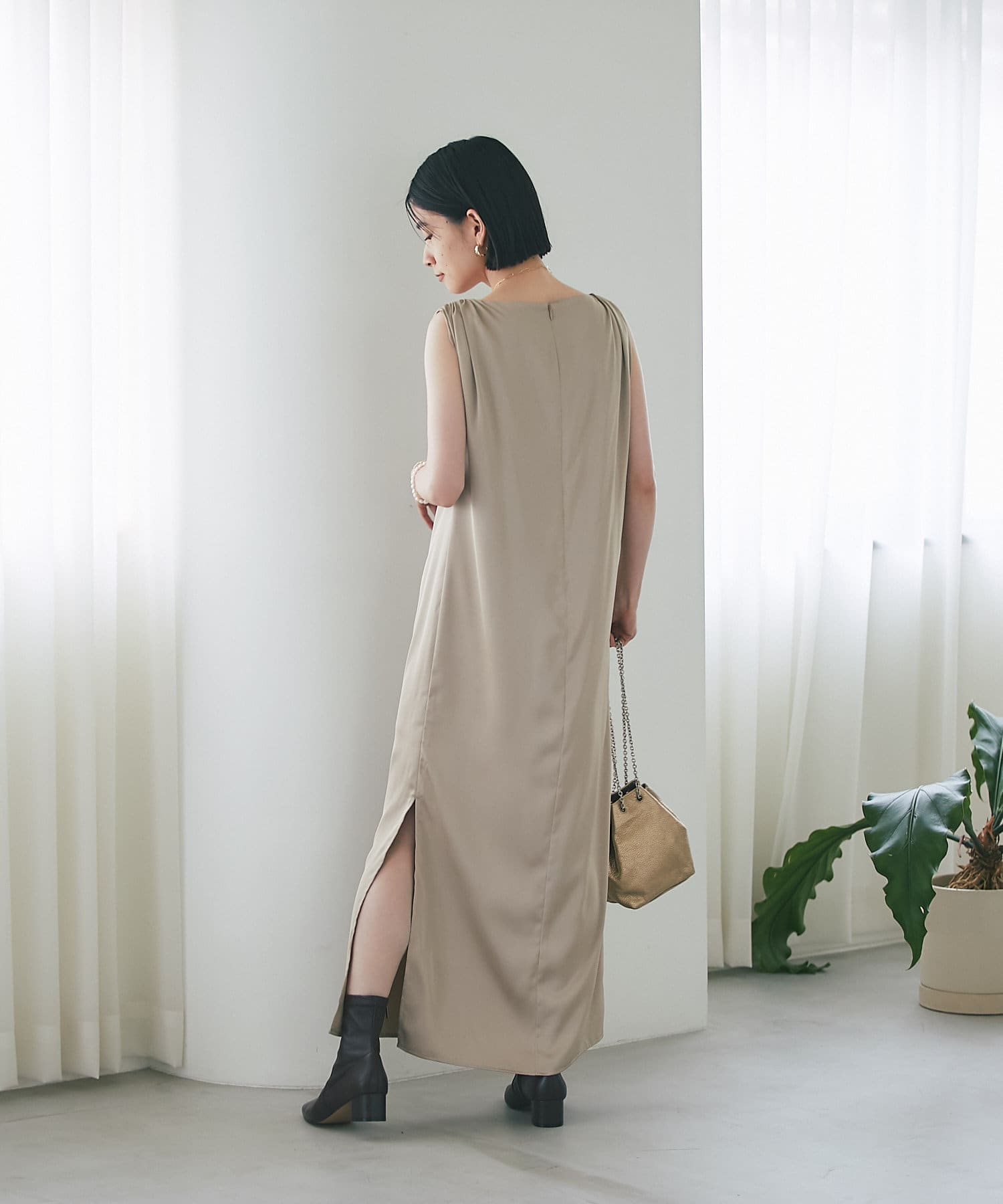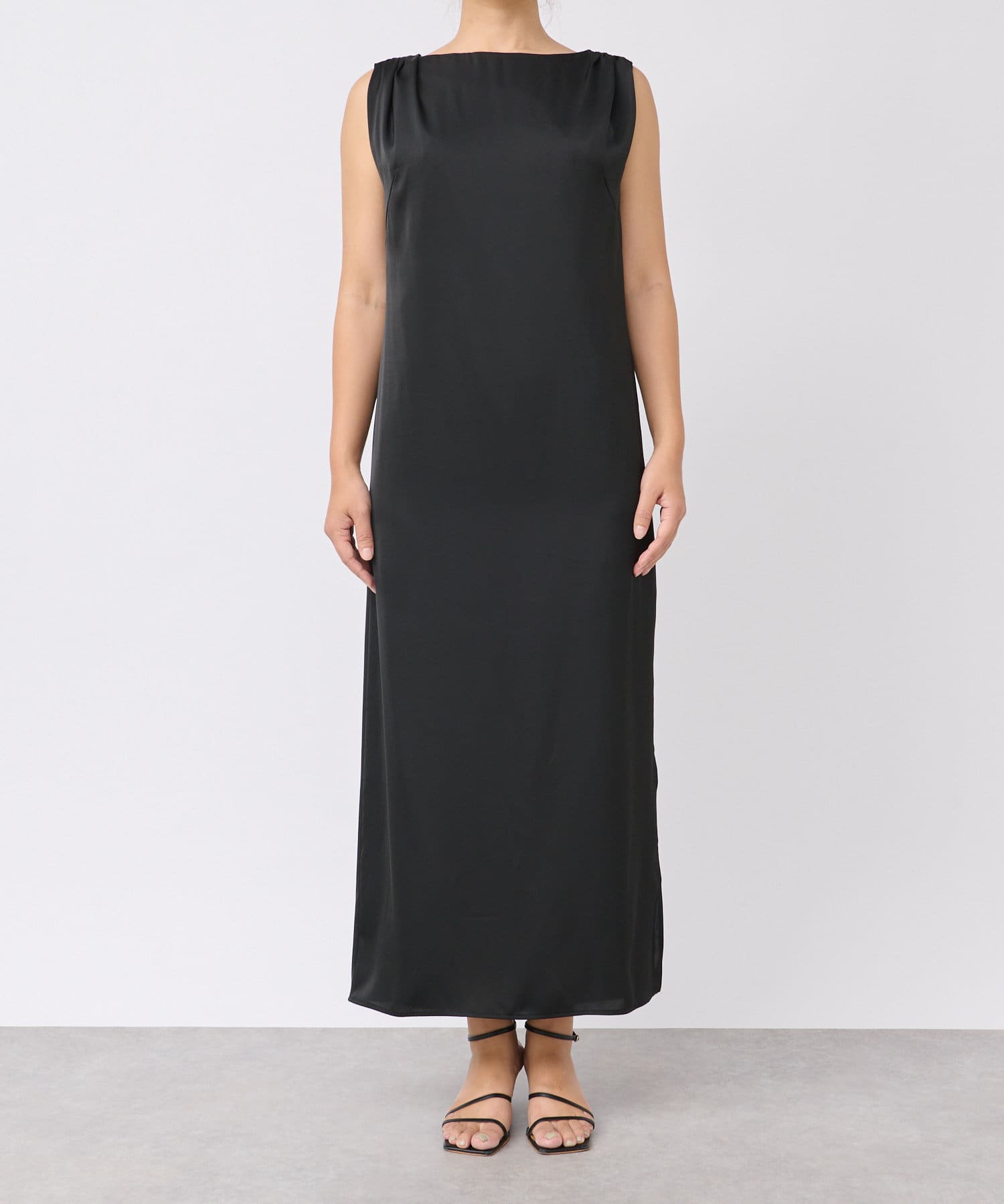 ミニマルな印象のIラインシルエットのサテンワンピース。