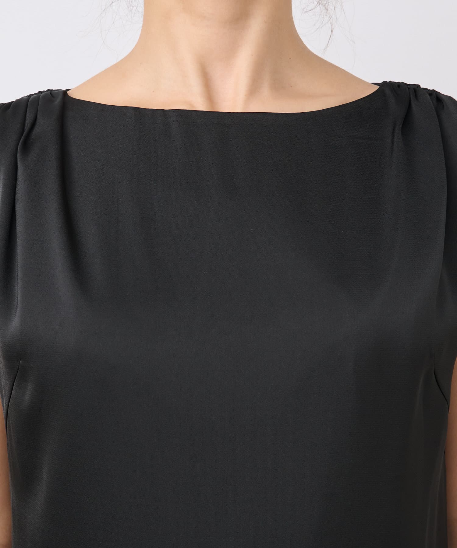 ・ギャザーが肩回りを華奢な印象に見せるデザイン