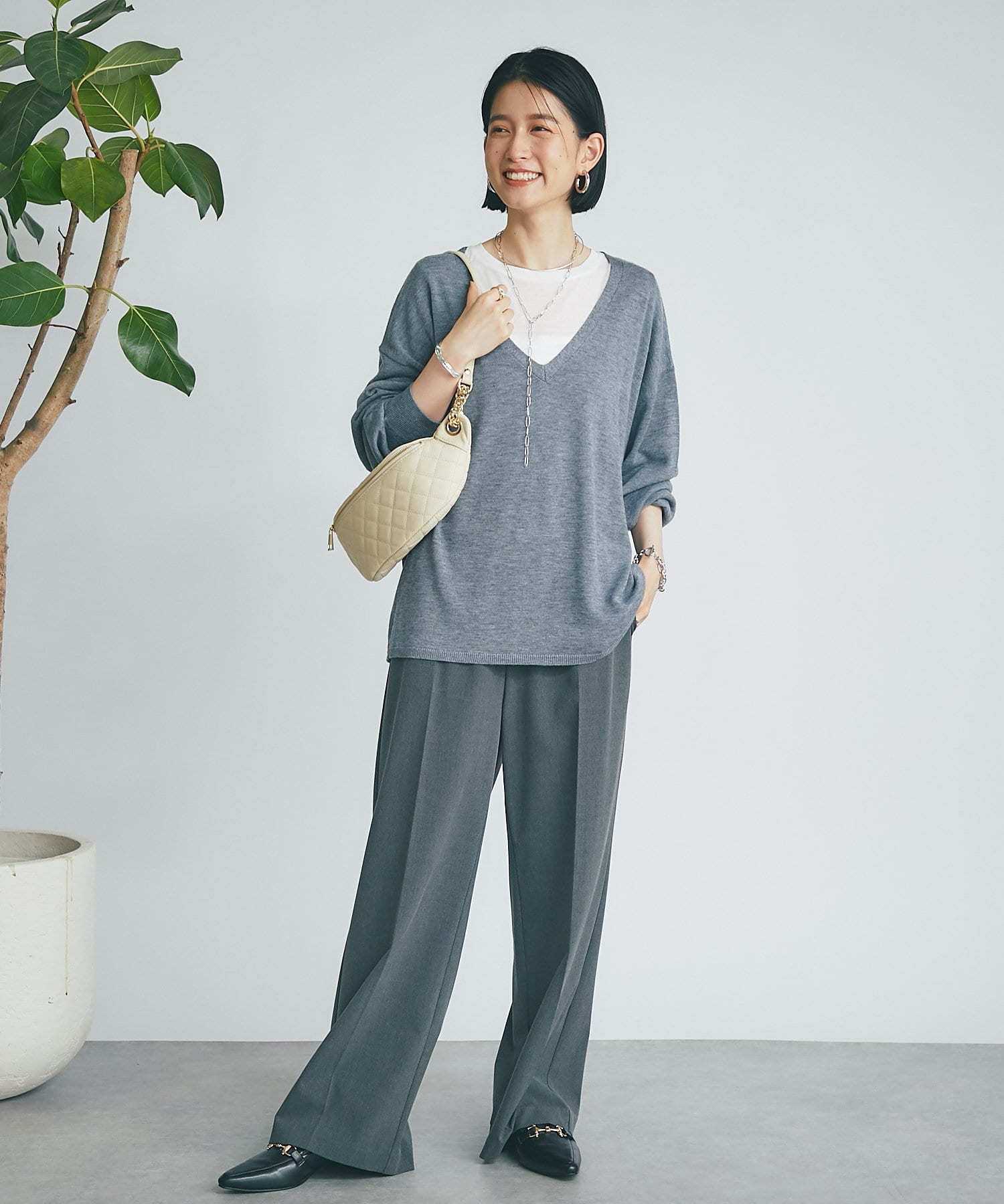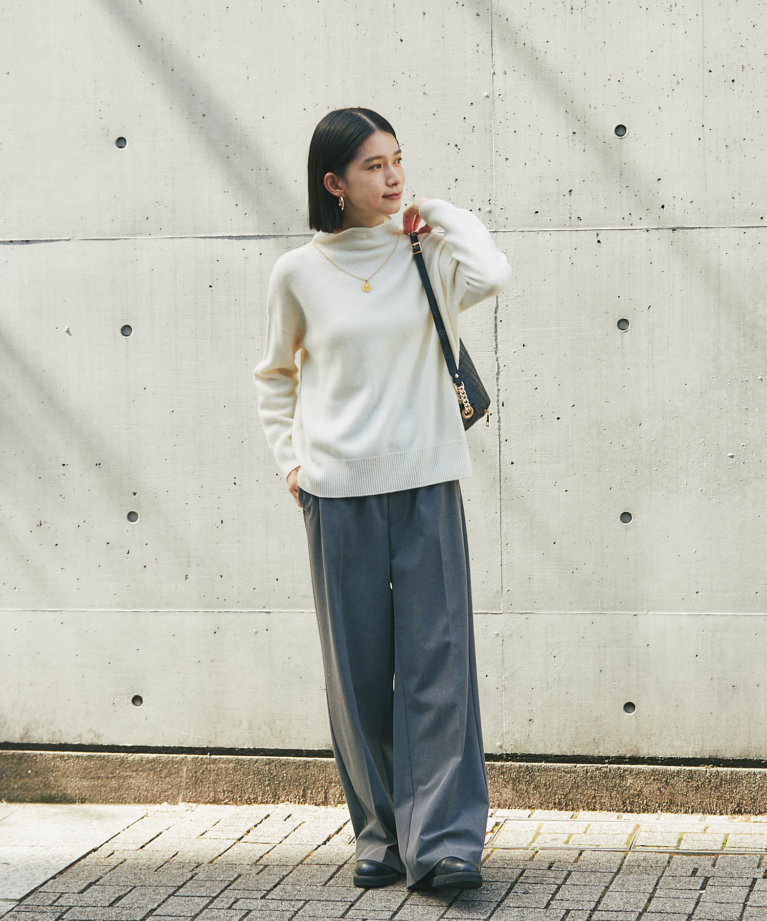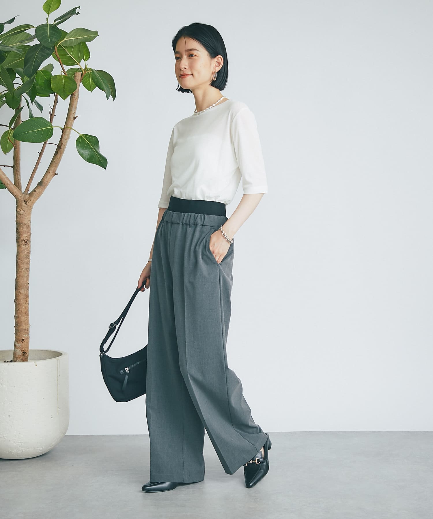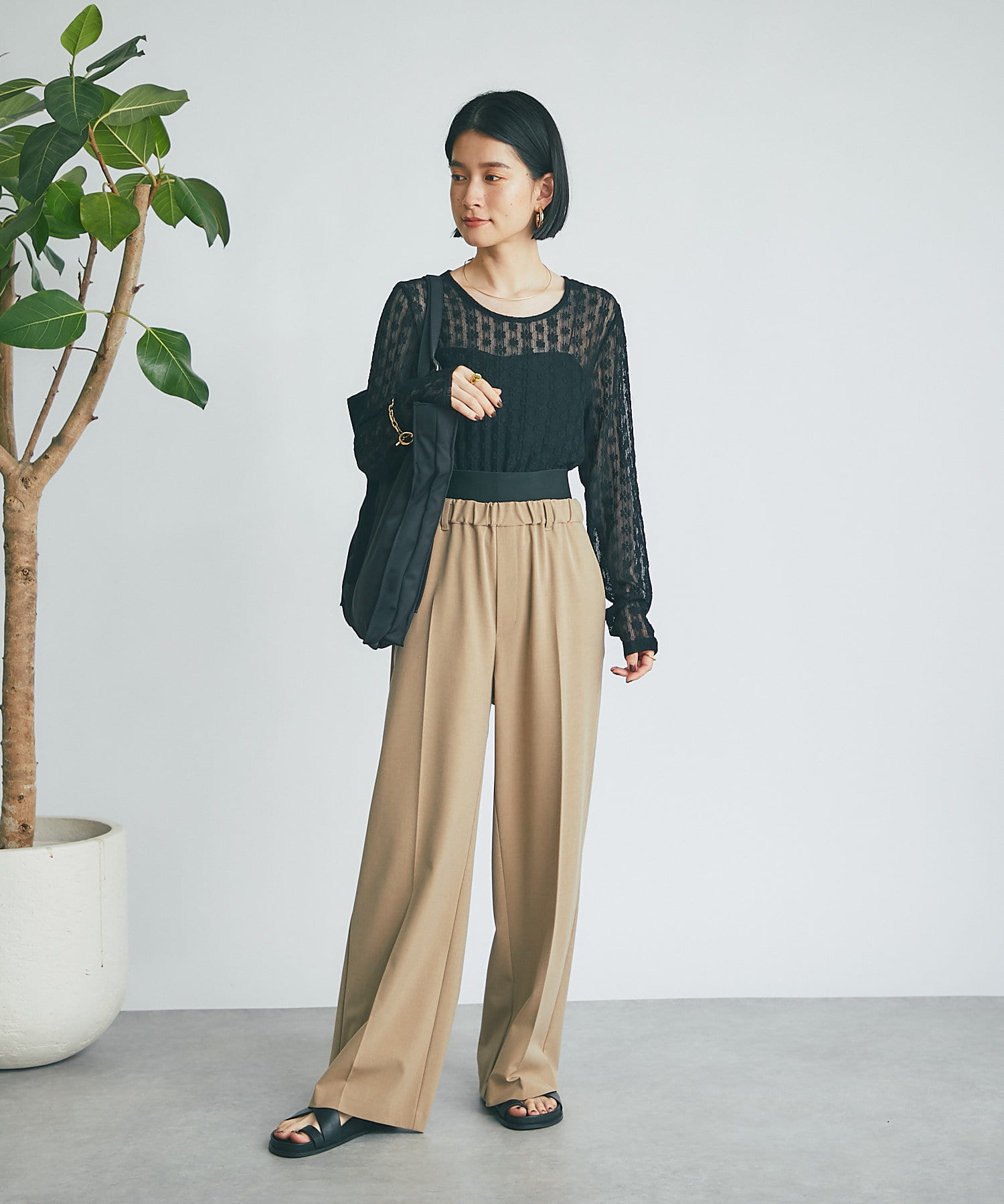トップスをインするスタイリングもおすすめですが、ゆったりめのトップスを合わせてシンプルなスラックスとしても着用いただけます。