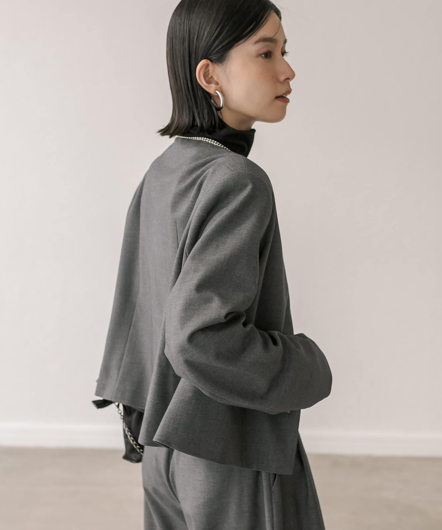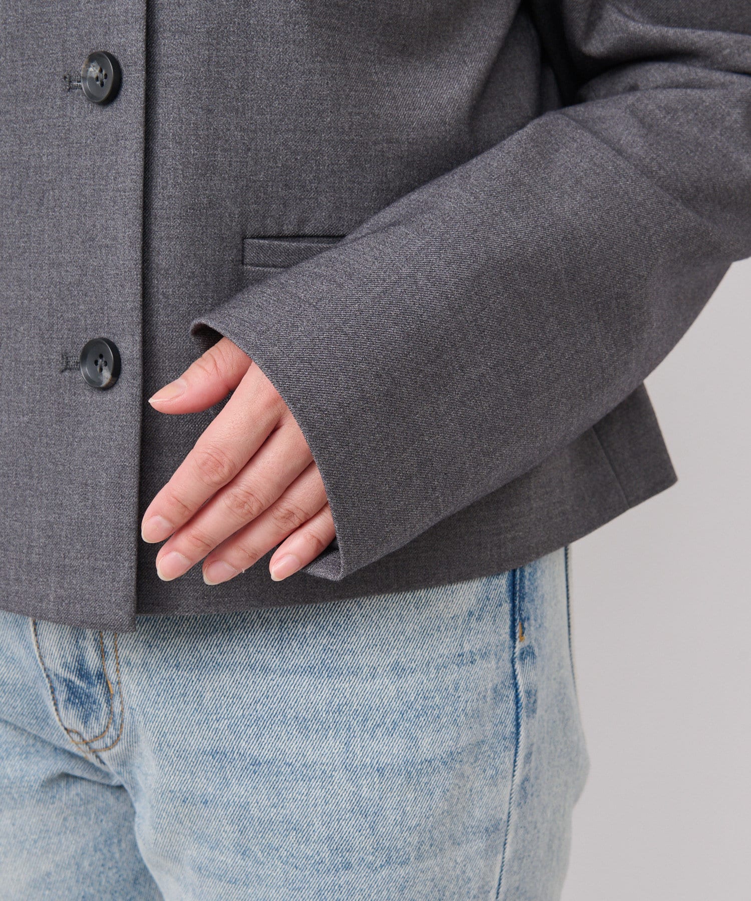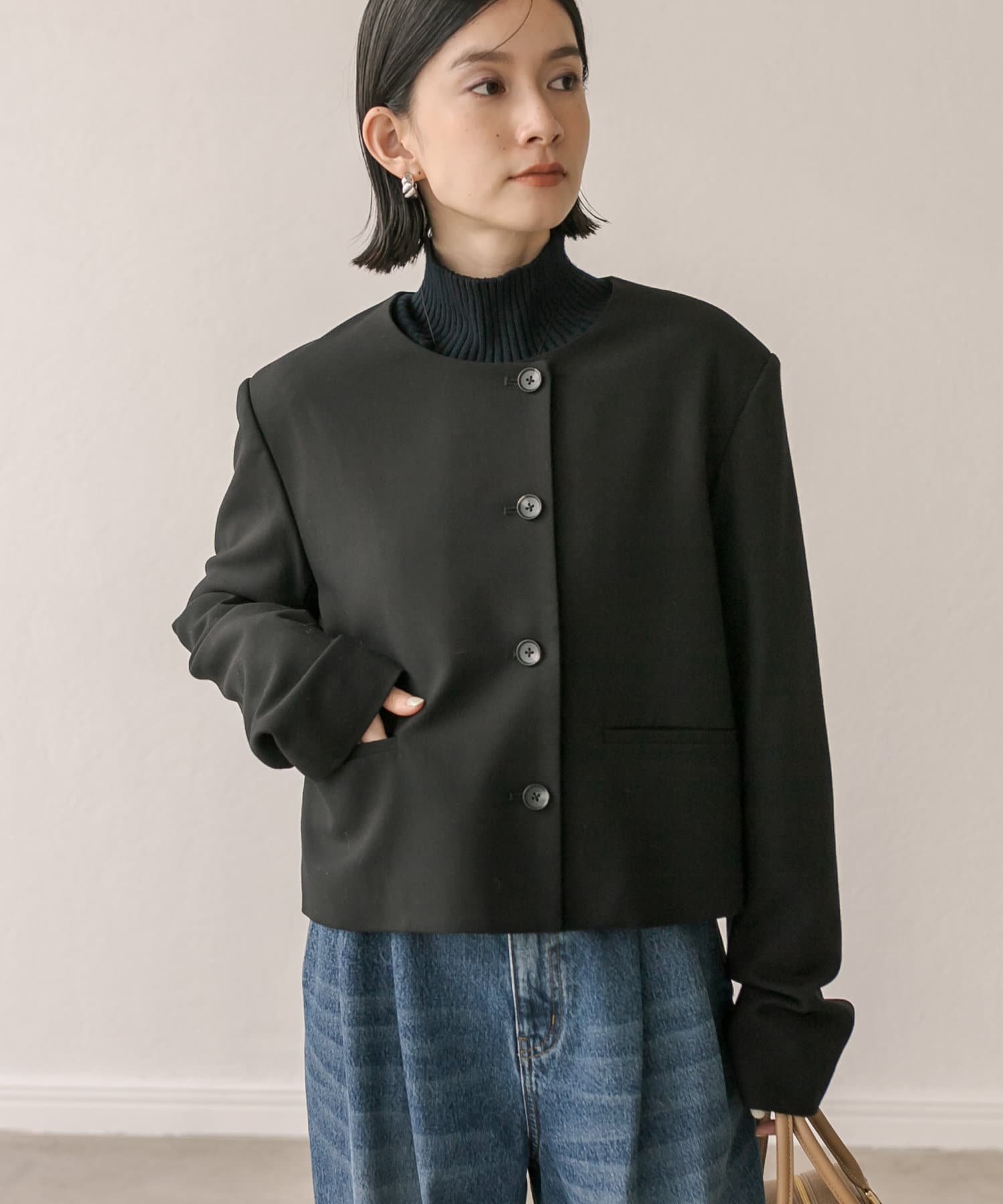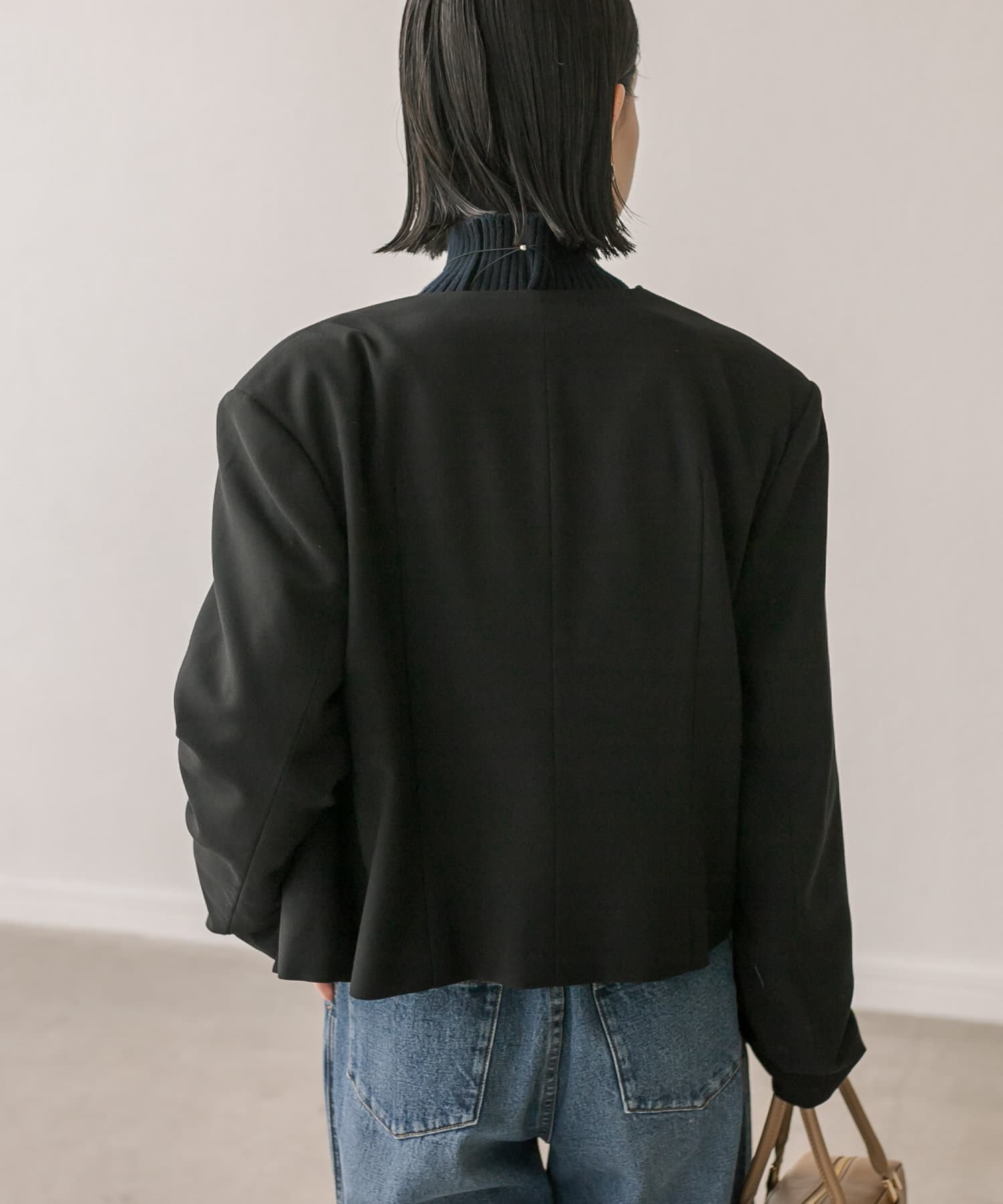 ショート丈の着丈とやや長めの袖丈、肩パット入りのデザインで、着るだけで様になるアイテム。