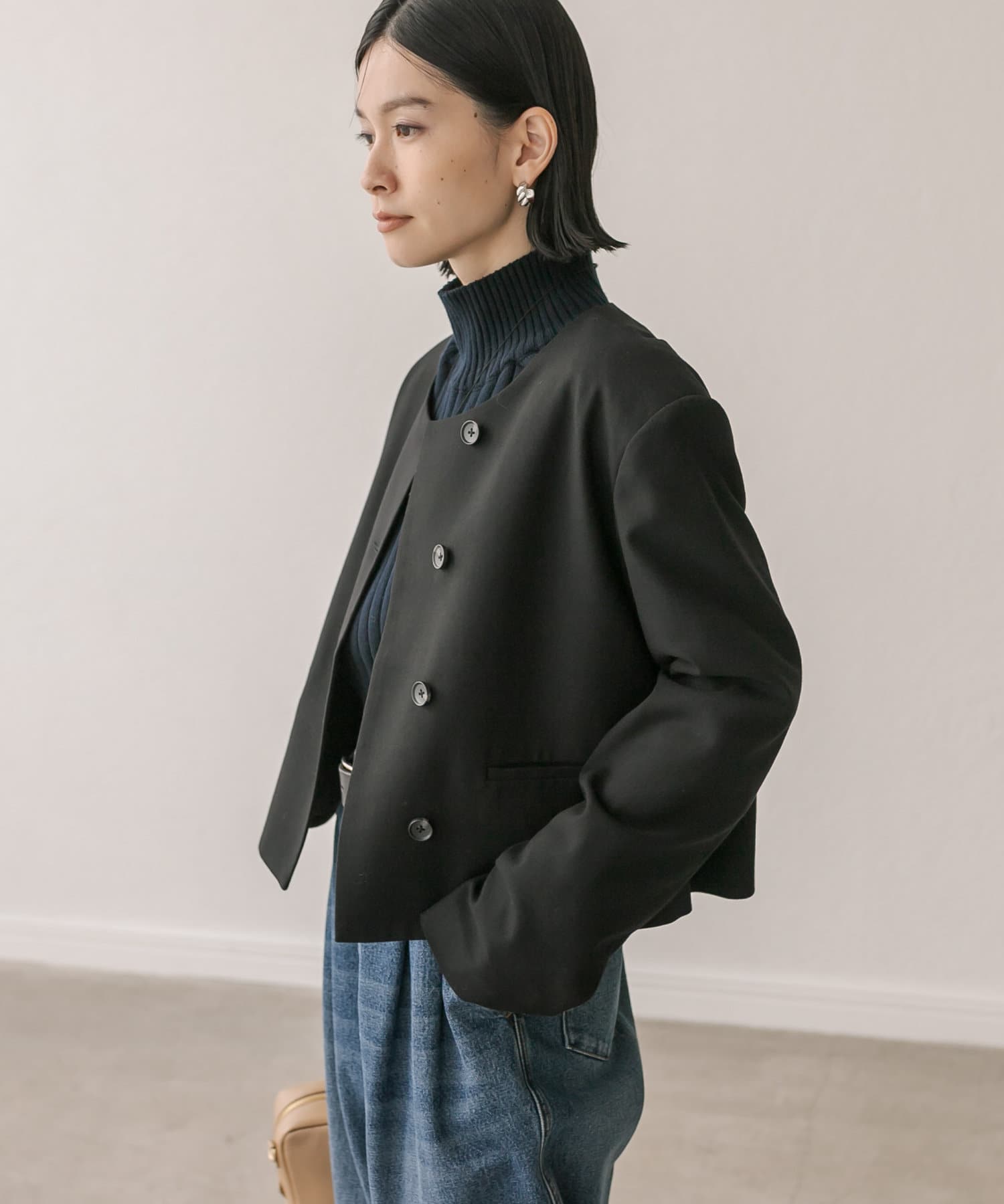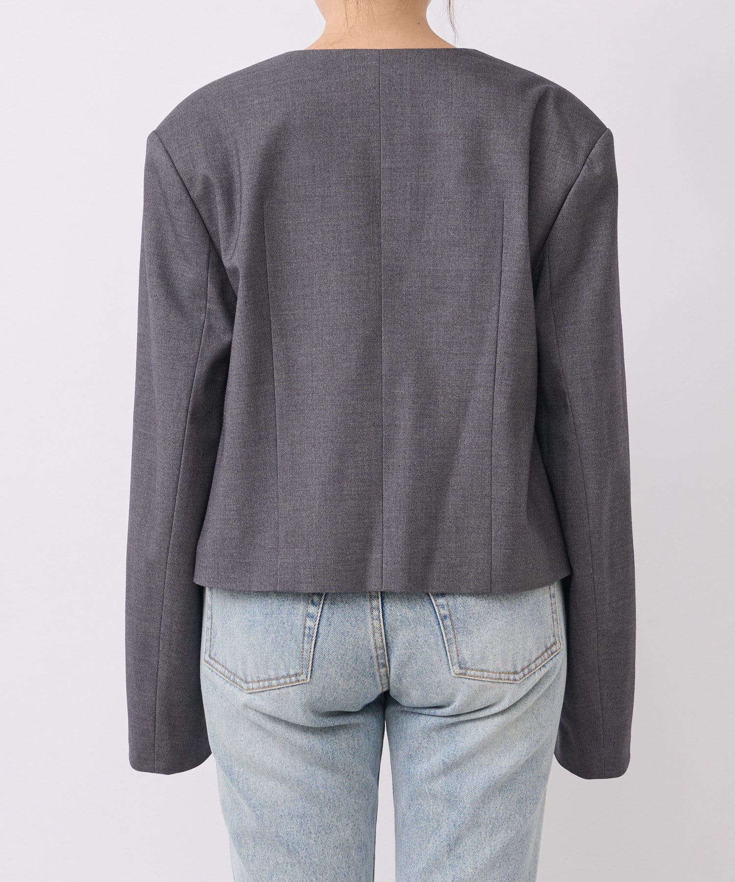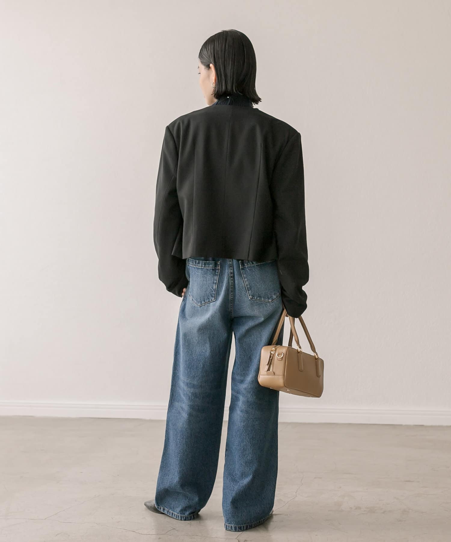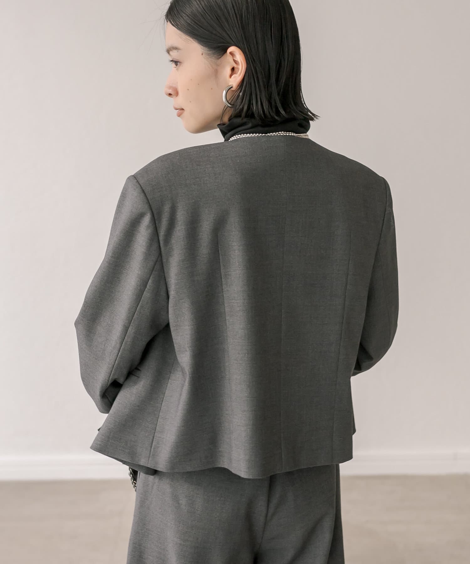 ショート丈の着丈とやや長めの袖丈、肩パット入りのデザインで、着るだけで様になるアイテム。