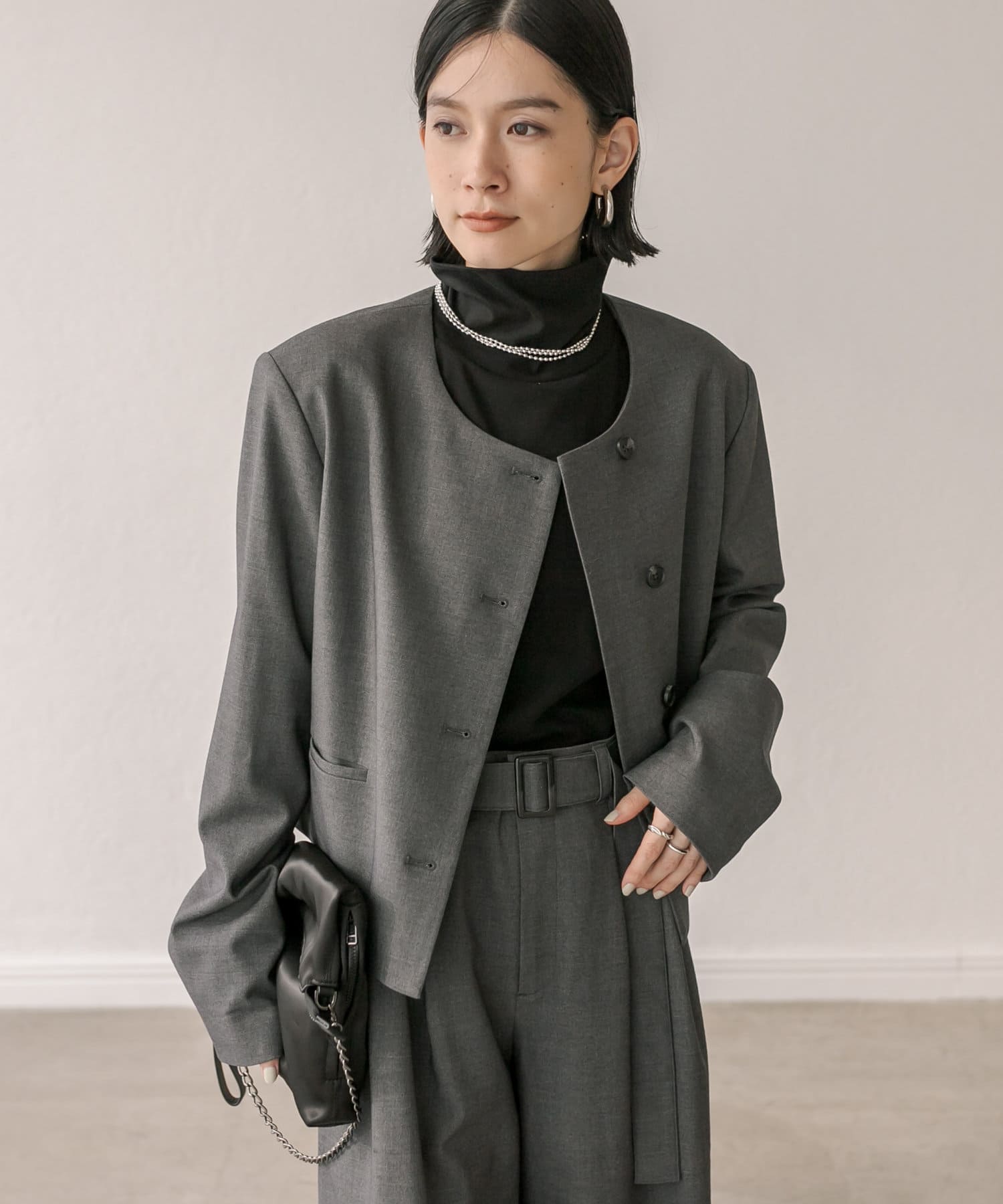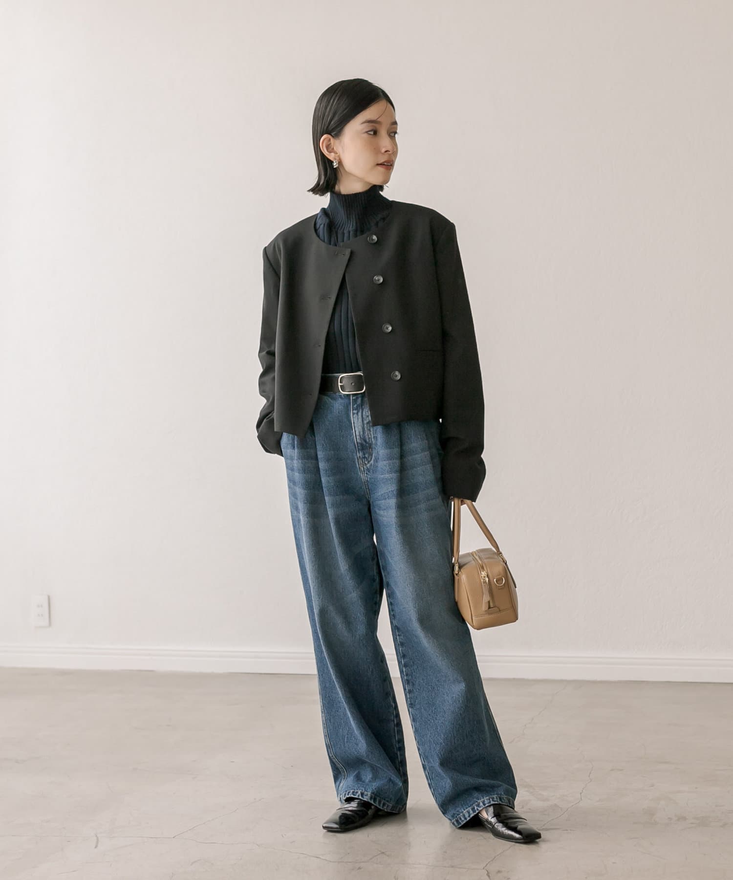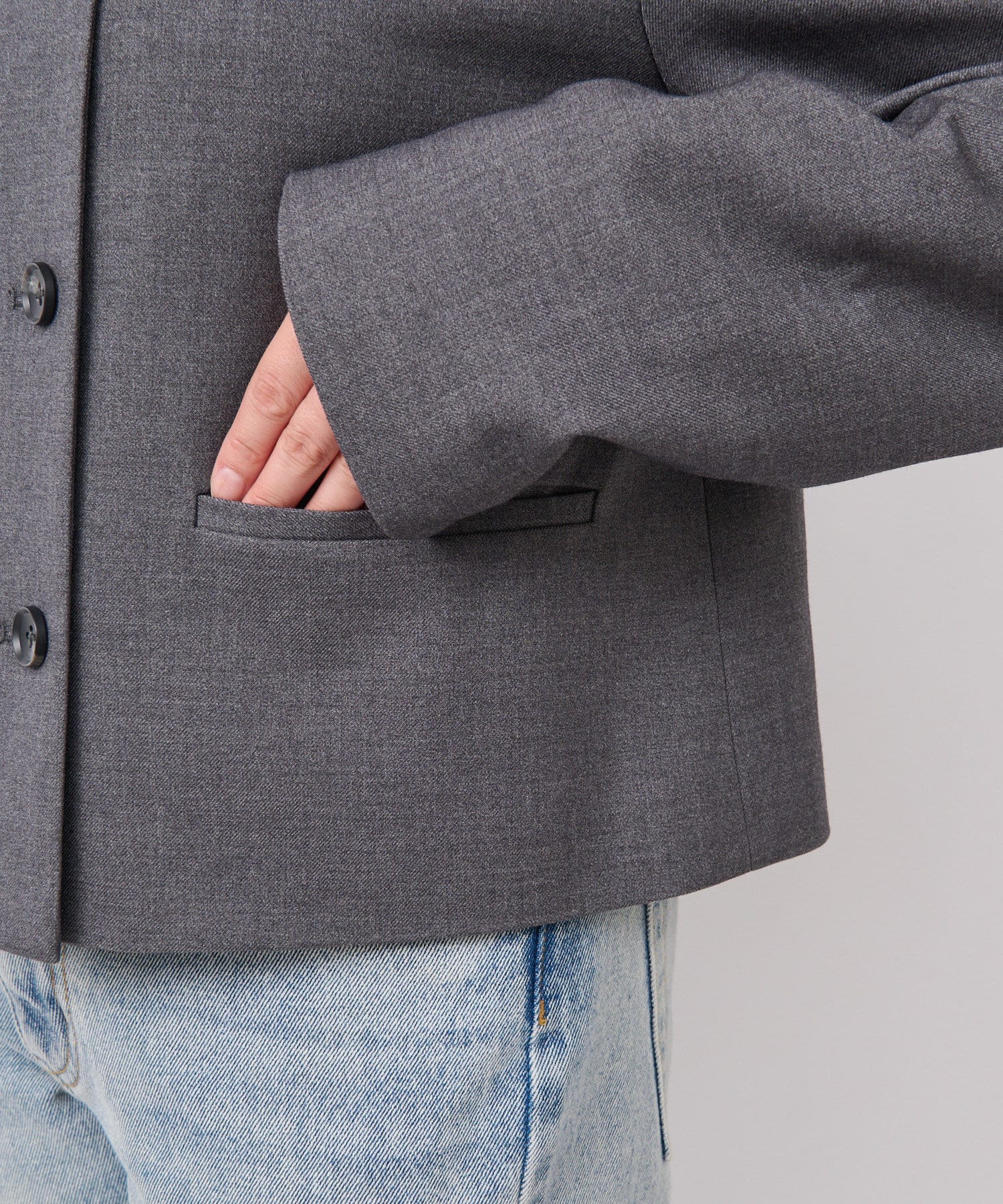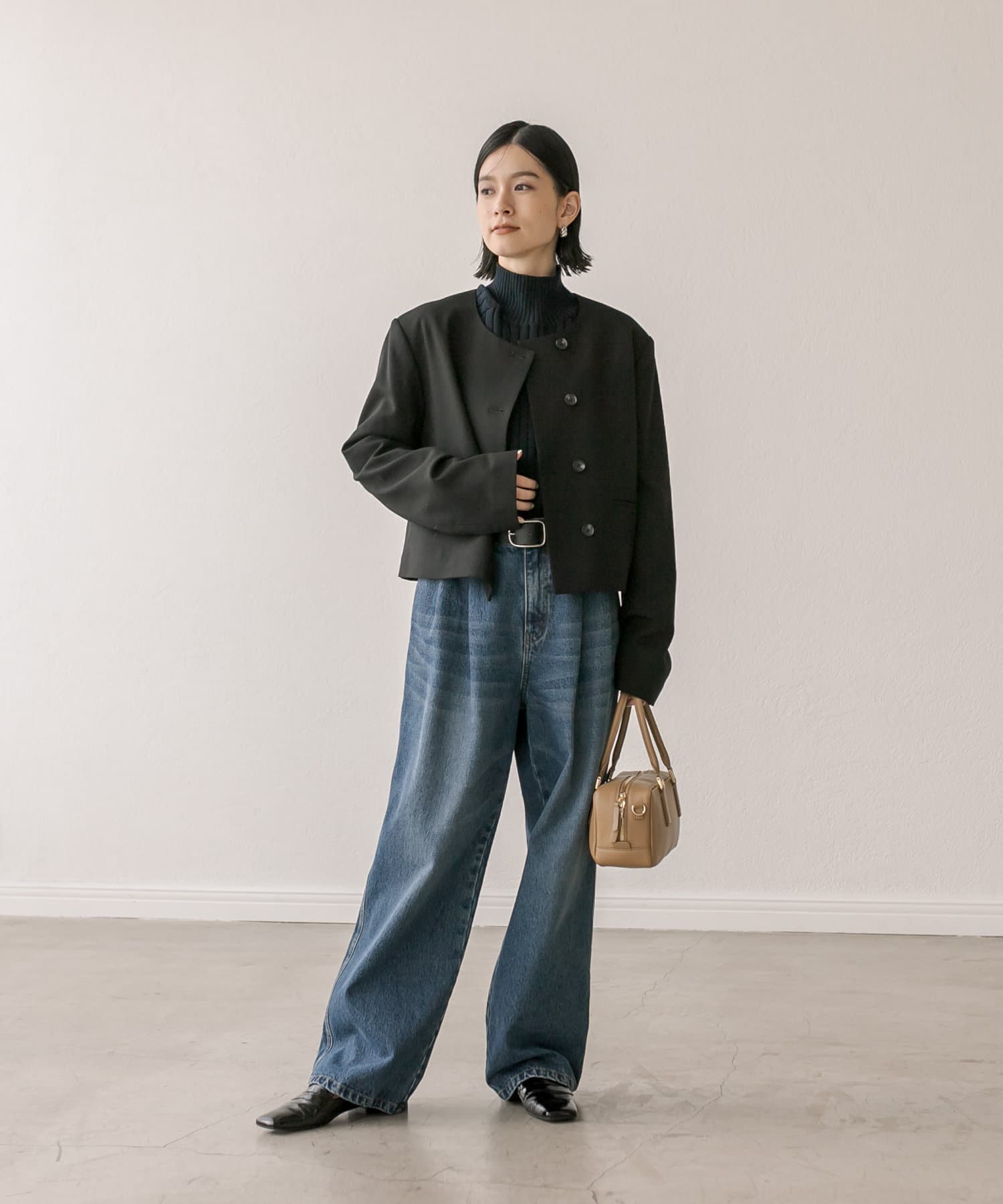 ショート丈の着丈とやや長めの袖丈、肩パット入りのデザインで、着るだけで様になるアイテム。