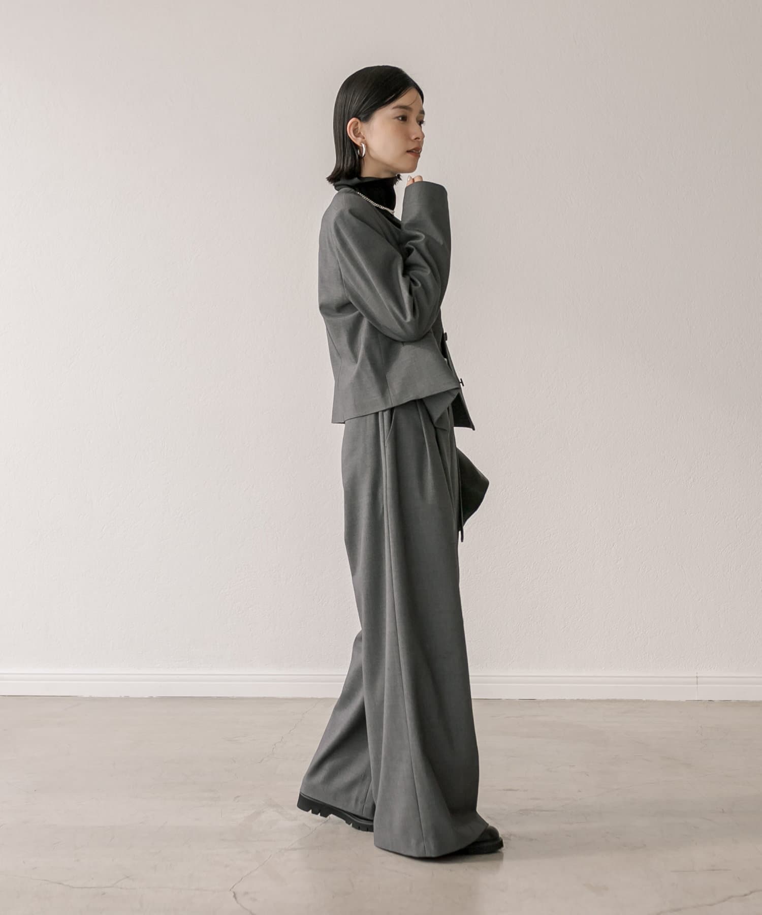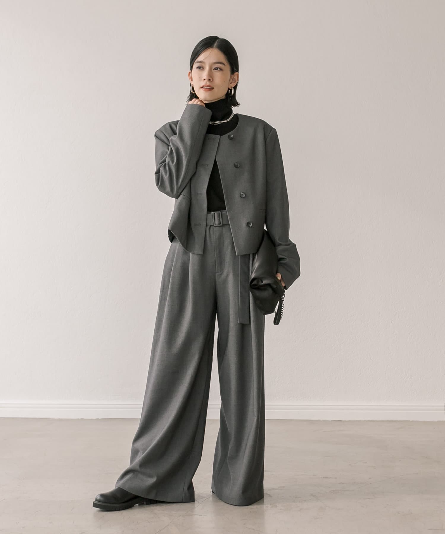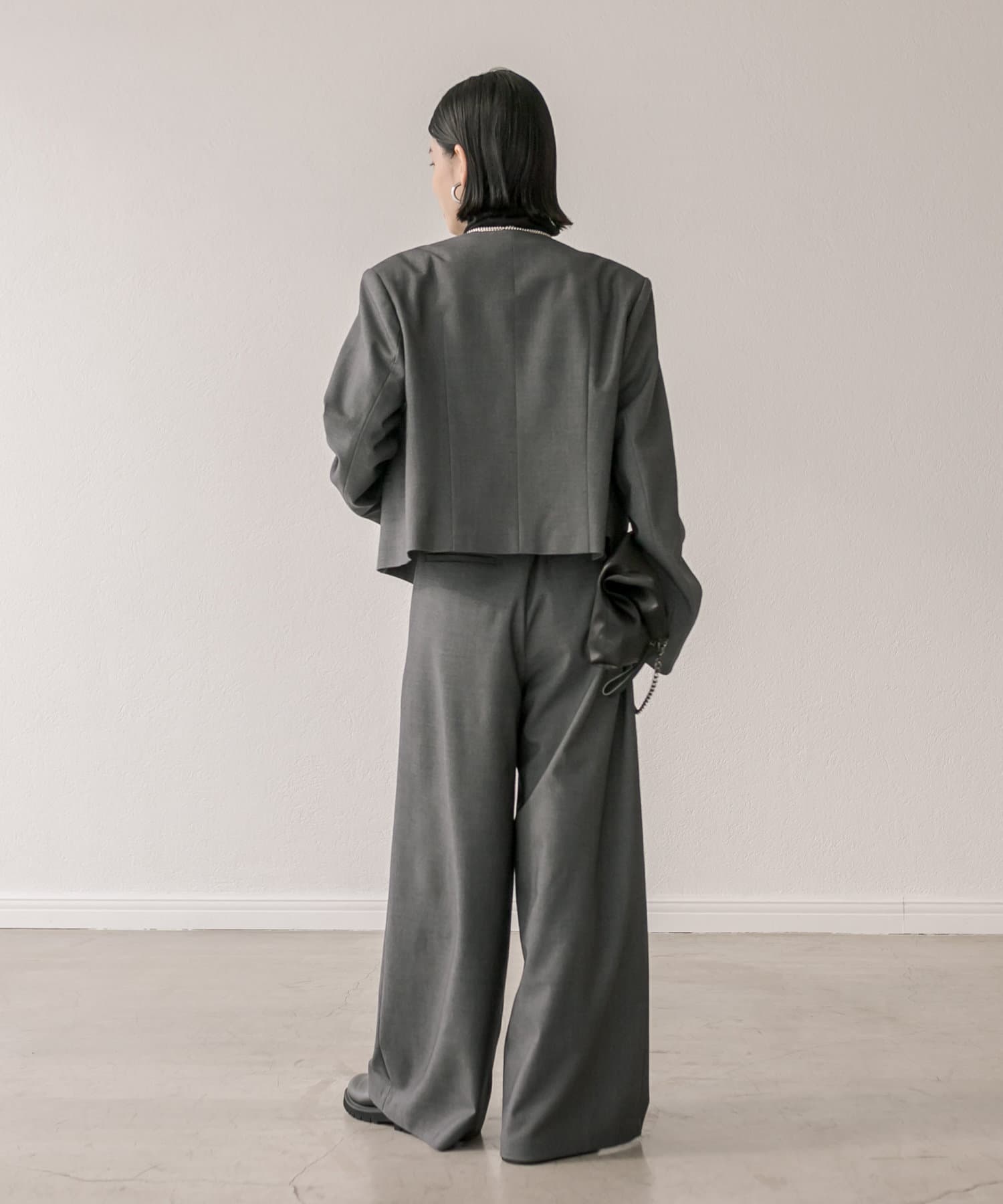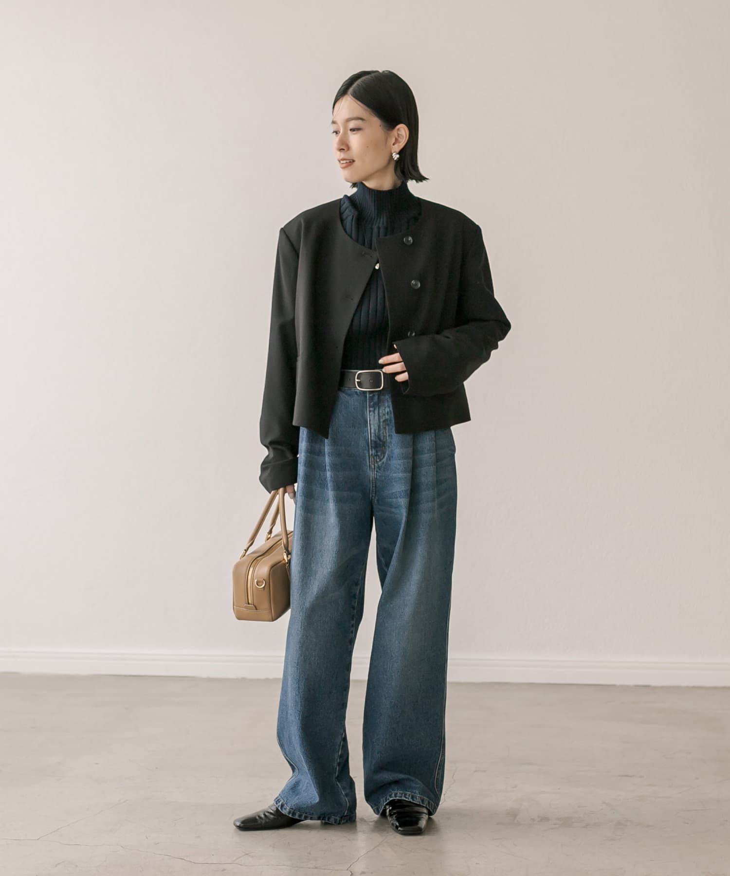 ショート丈の着丈とやや長めの袖丈、肩パット入りのデザインで、着るだけで様になるアイテム。