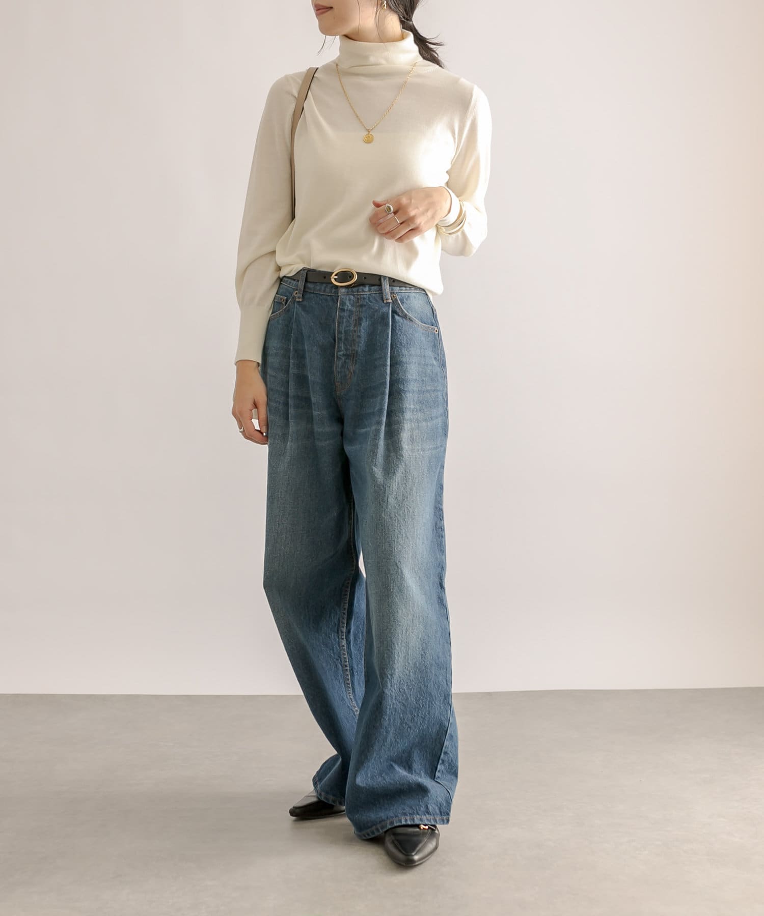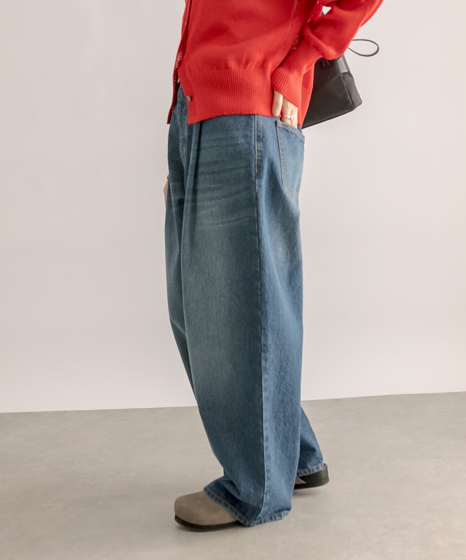 タックが入ったワイドシルエットで、気になる腿周りもさりげなくカバーする優秀なデザイン。