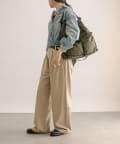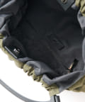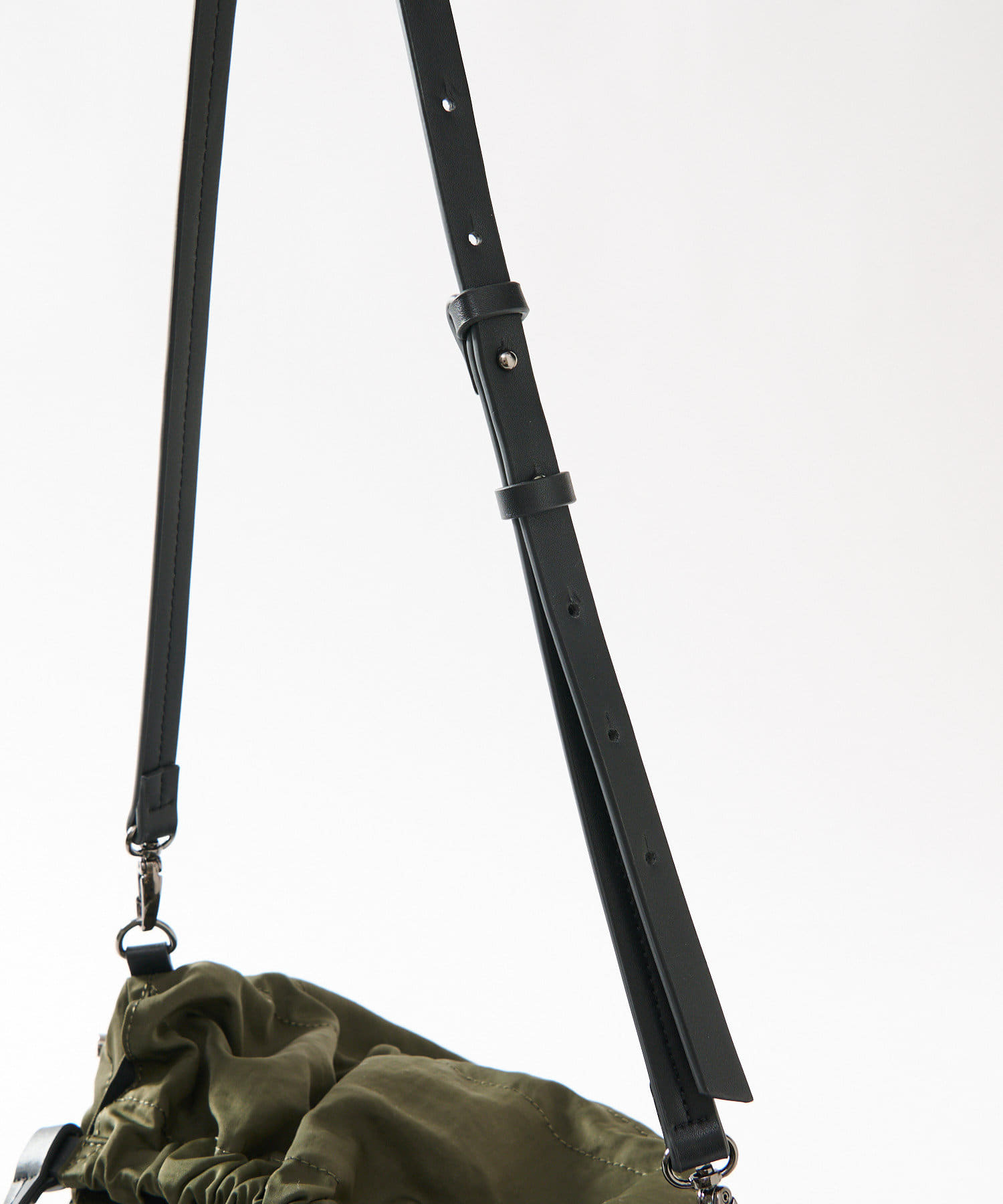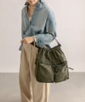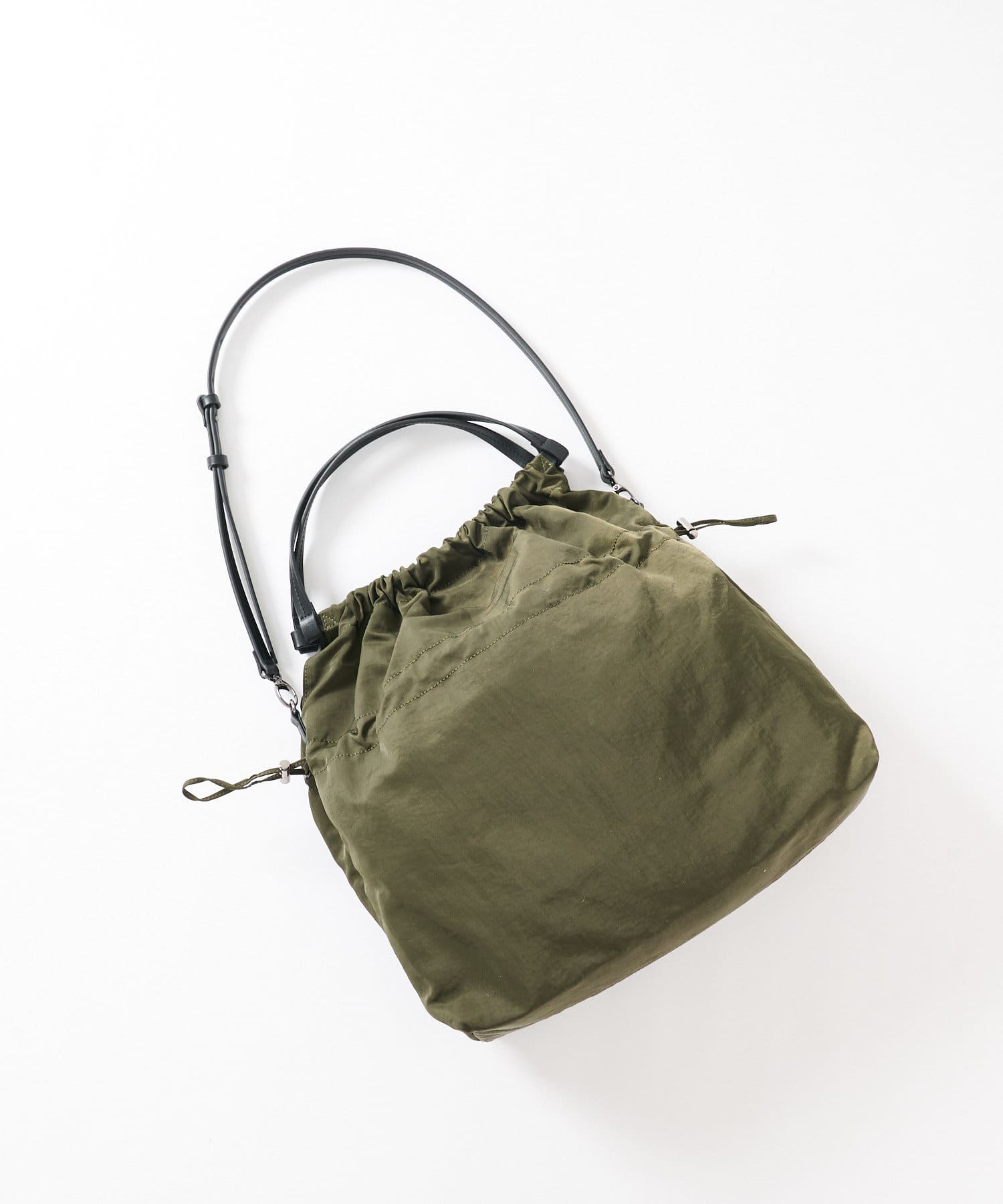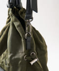 本体の両サイドに通っているひもを絞ることで巾着のようにアレンジいただくことも可能です。