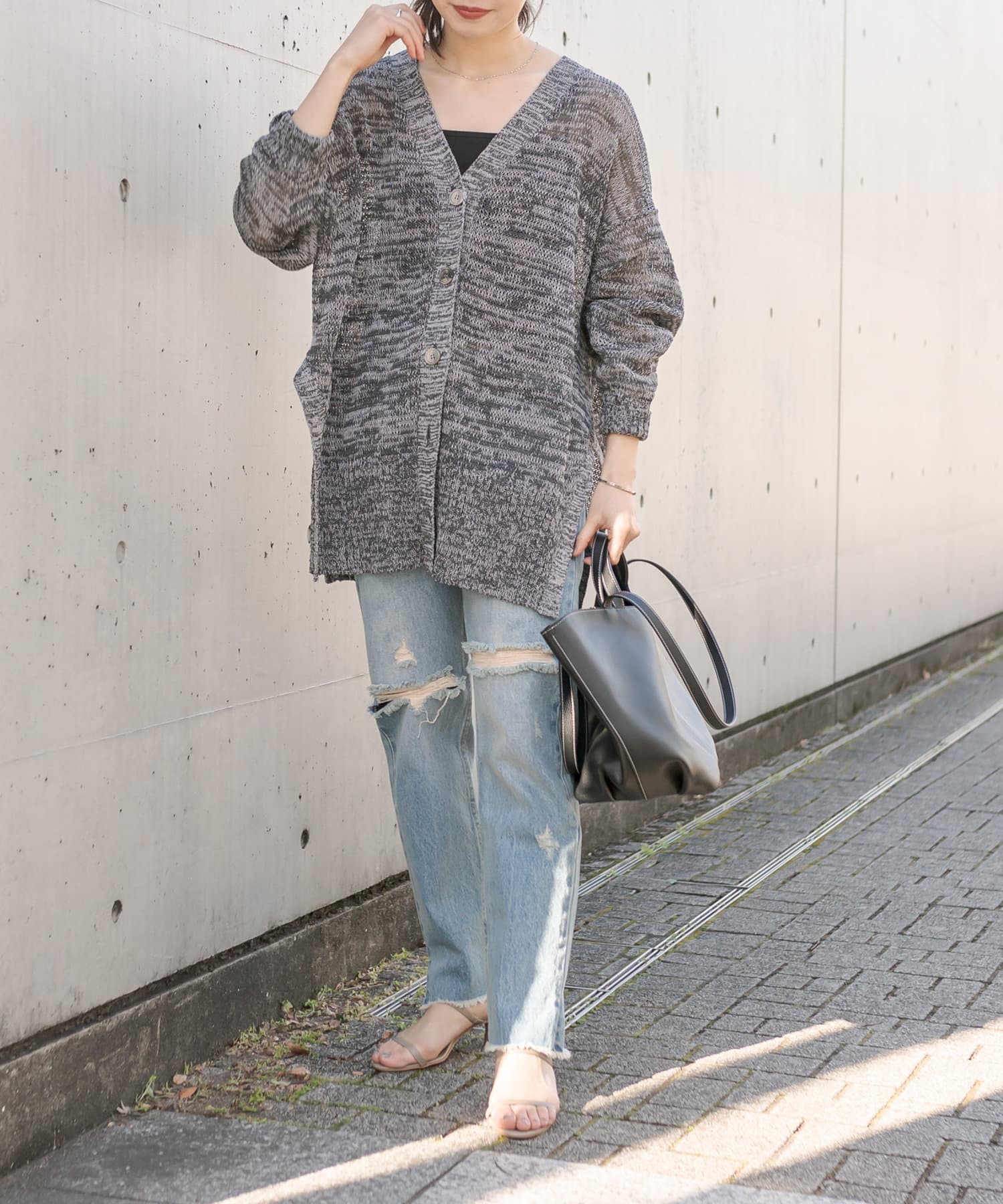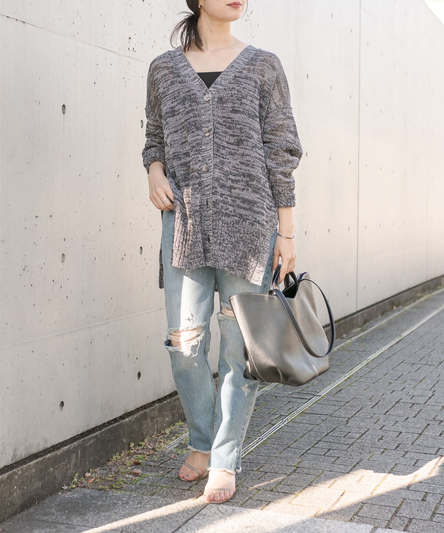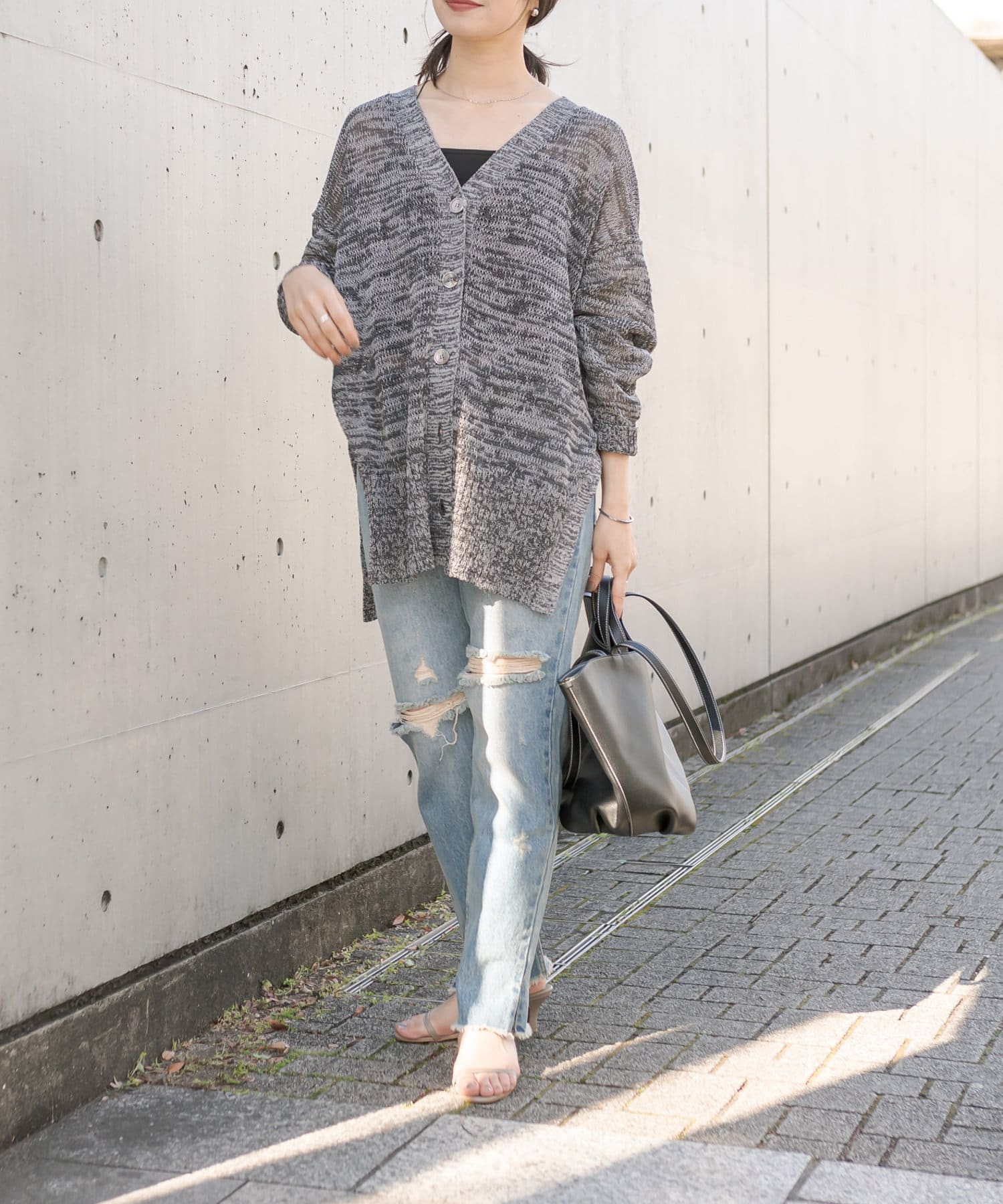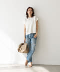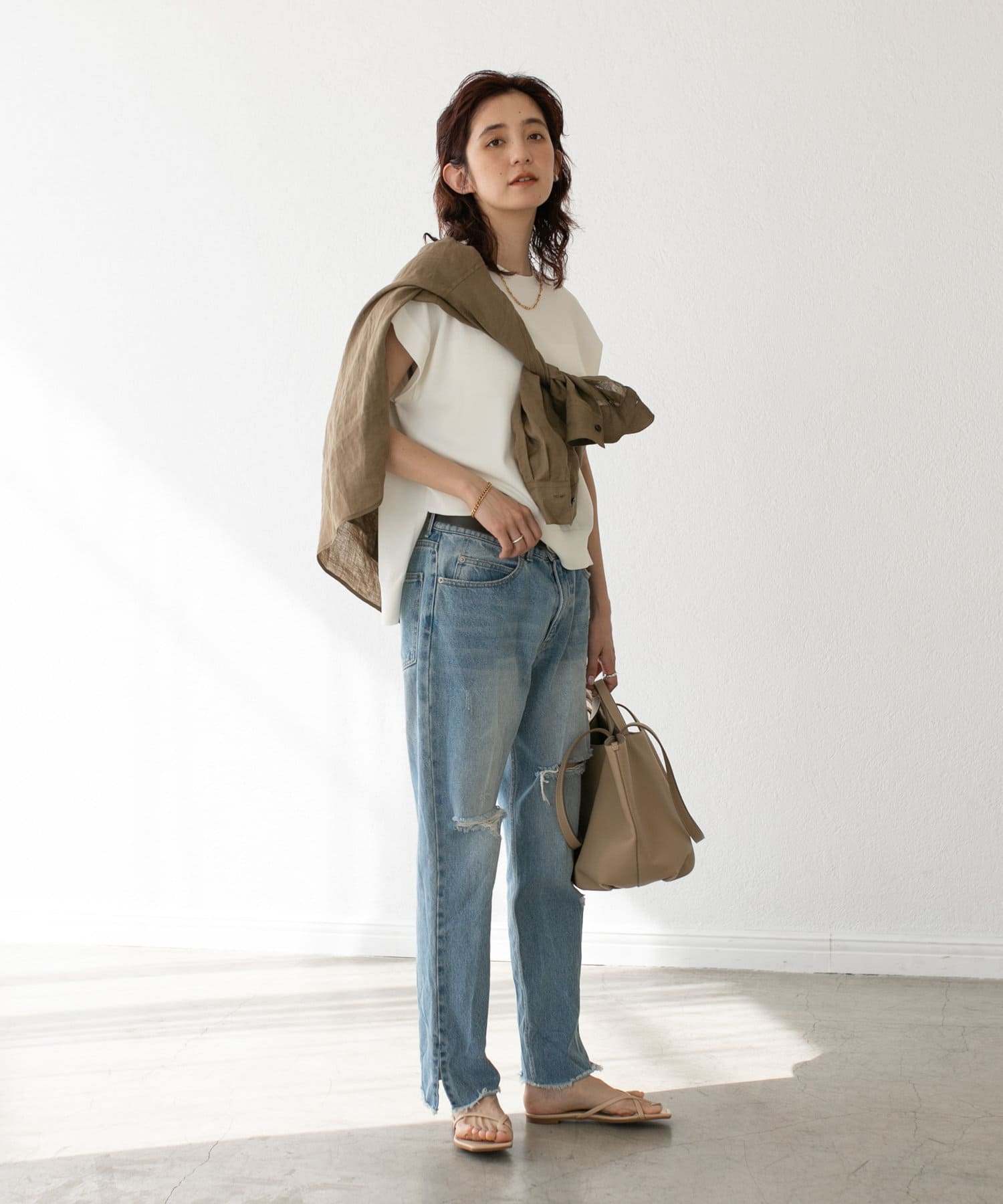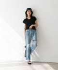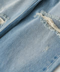 窮屈にならない程度に、身体に程良く沿うシルエット。膝上のダメージ加工がポイントです。
