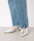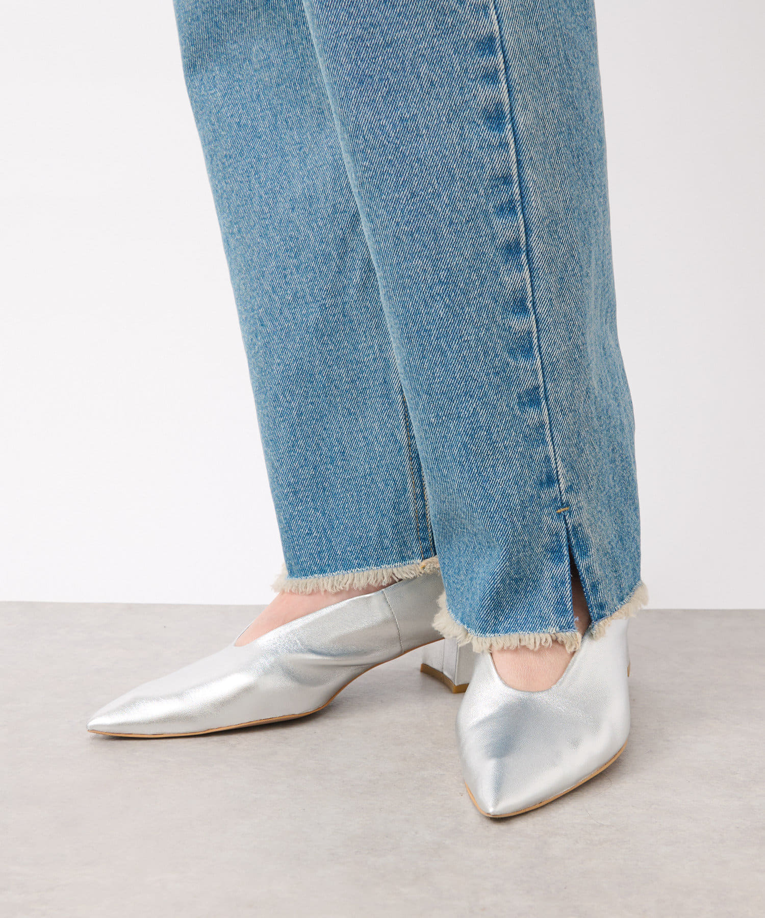 裾スリットがサンダル、スニーカーを履いた時に裾がたまらずに比較的すっきりとした印象で履いていただけます。