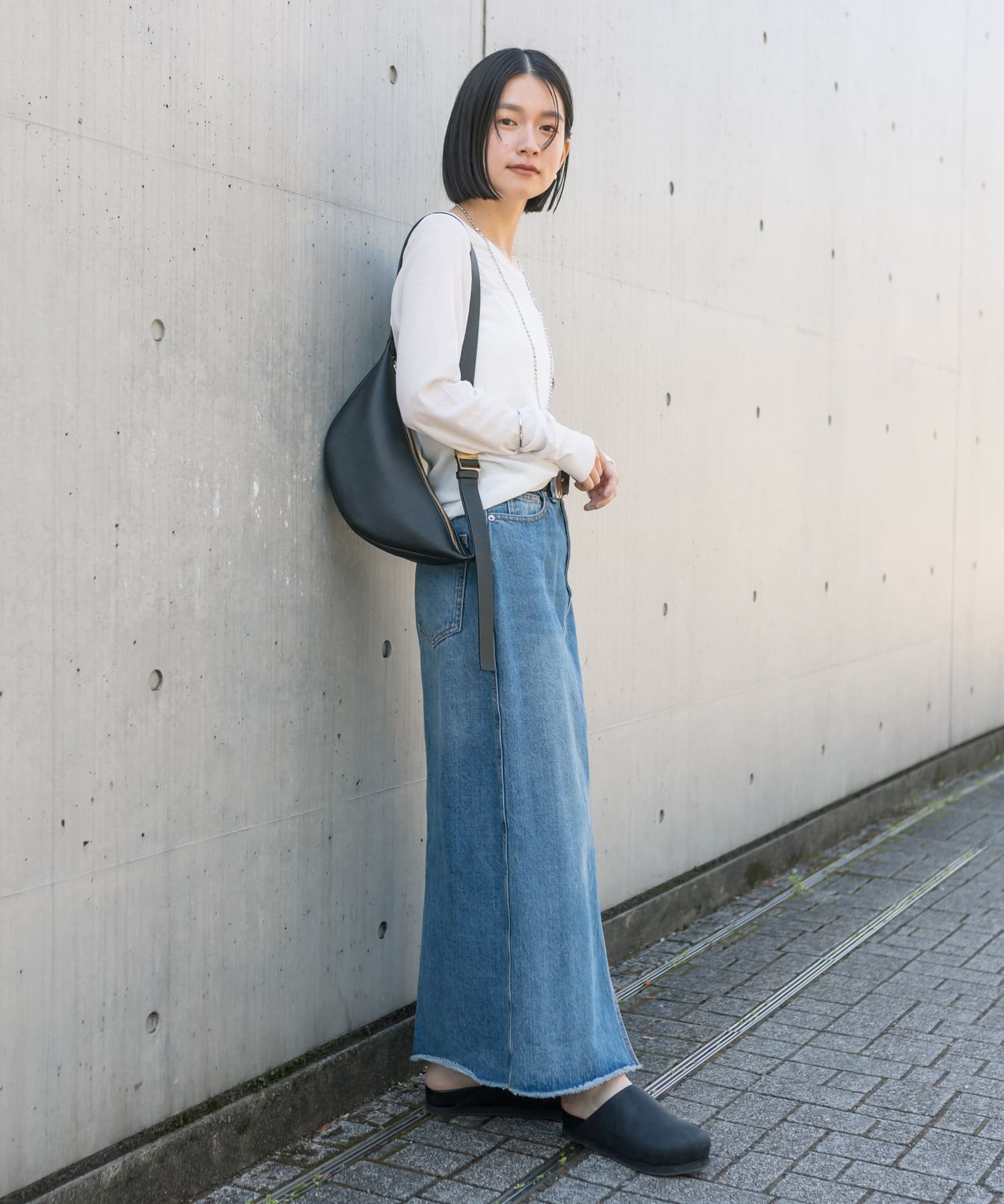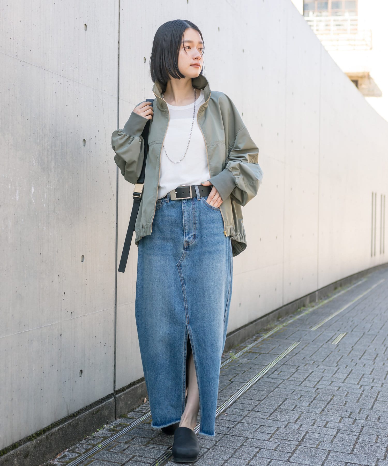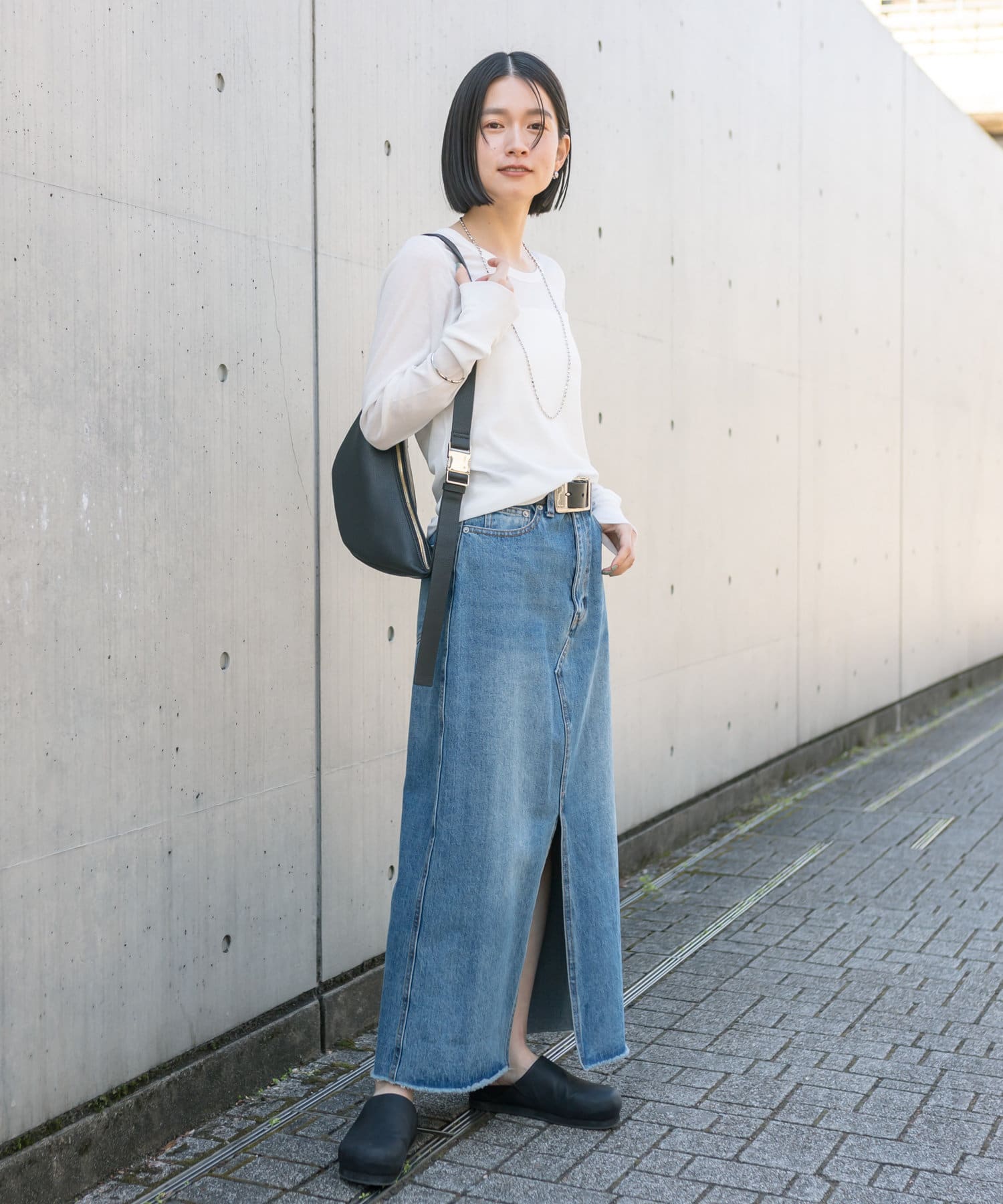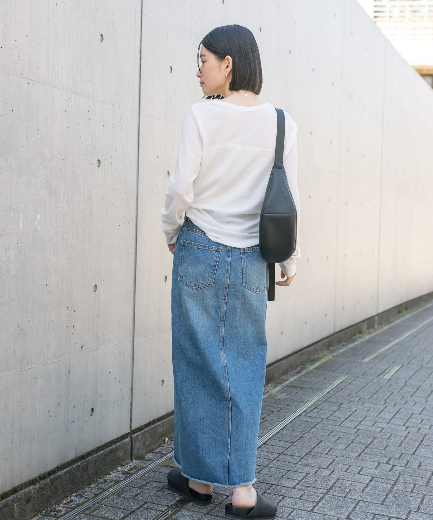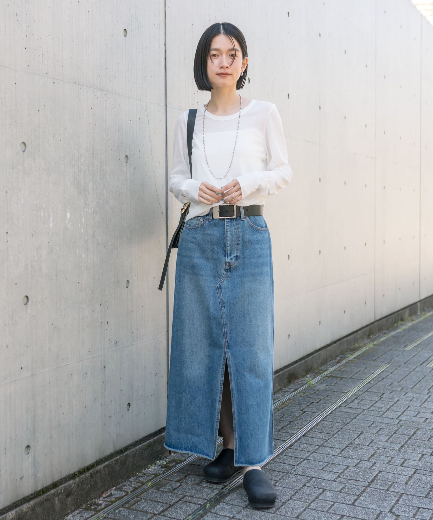 窮屈感は感じにくく、ほどよく身体にフィットするサイズ感。 長めの袖丈で一枚でも様になるデザインです。