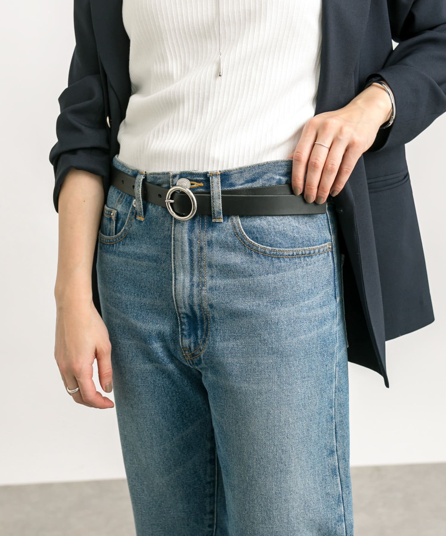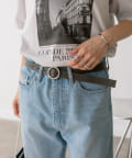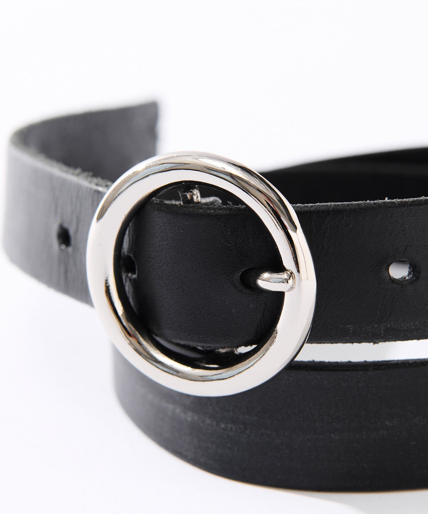 シルバーのサークル型のバックルがポイントのベルト。