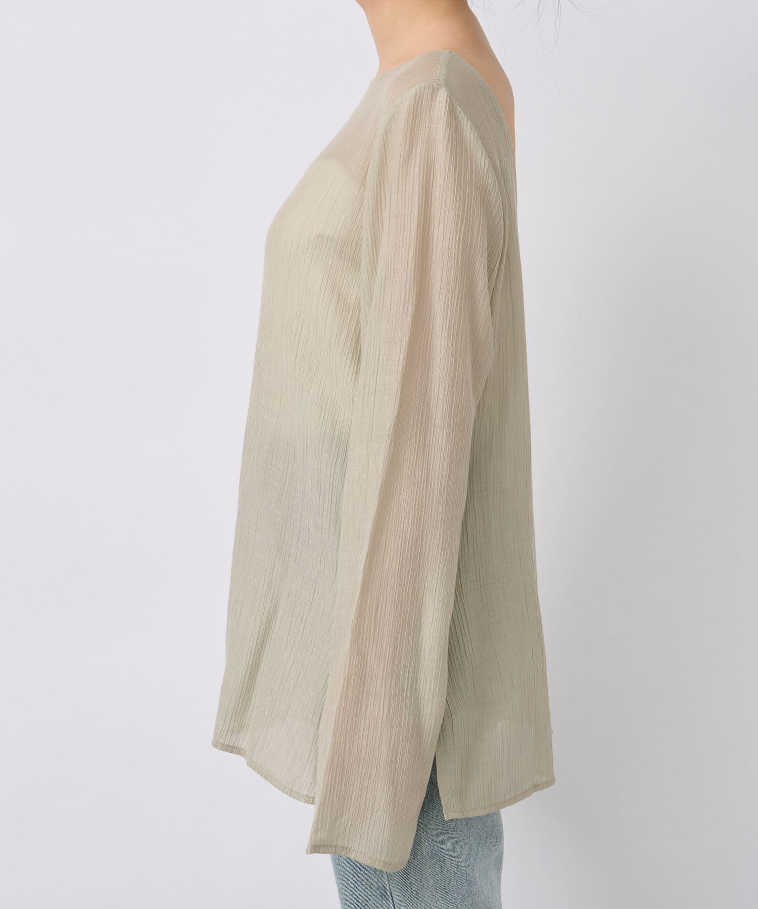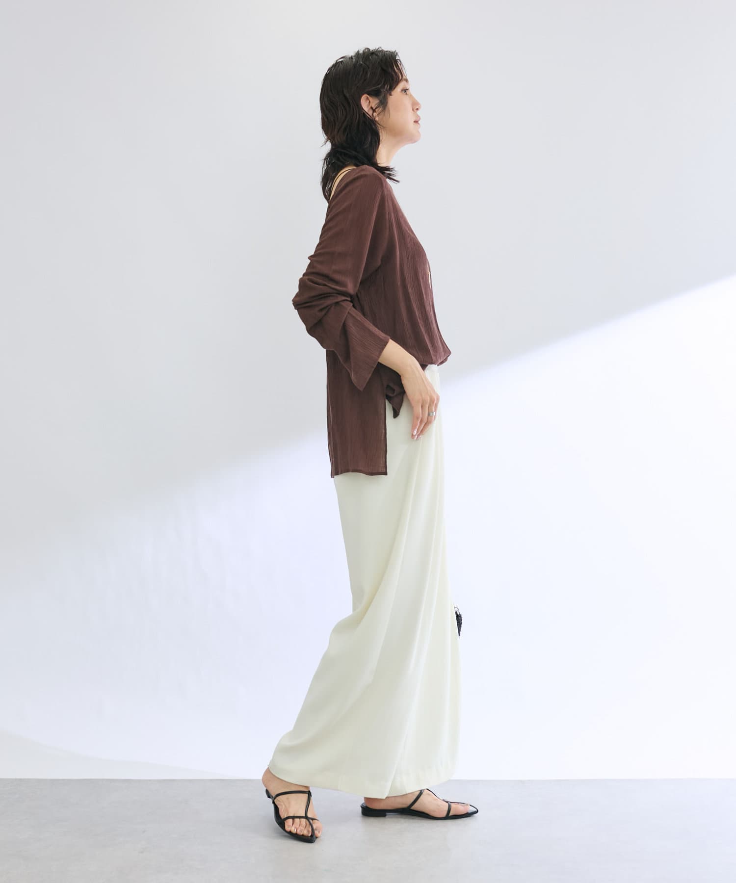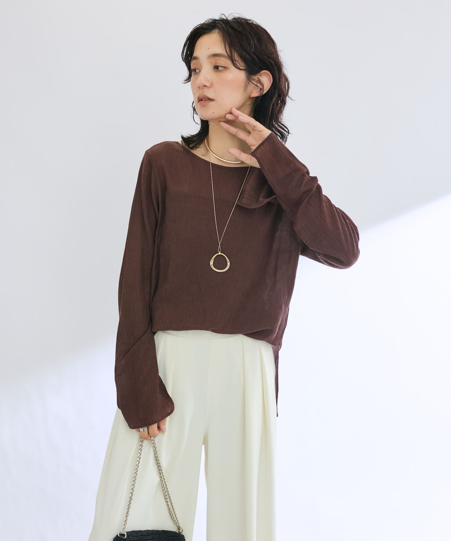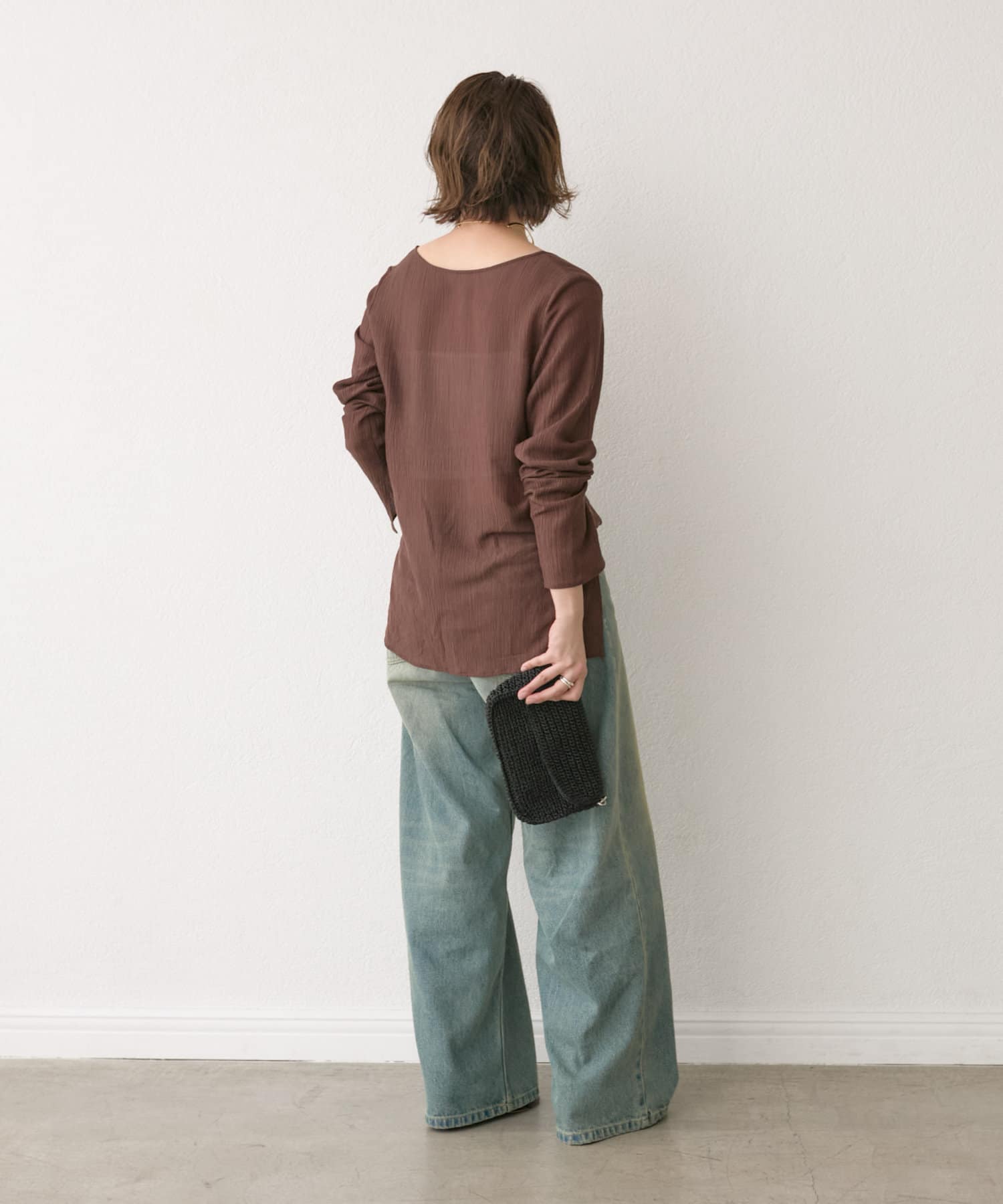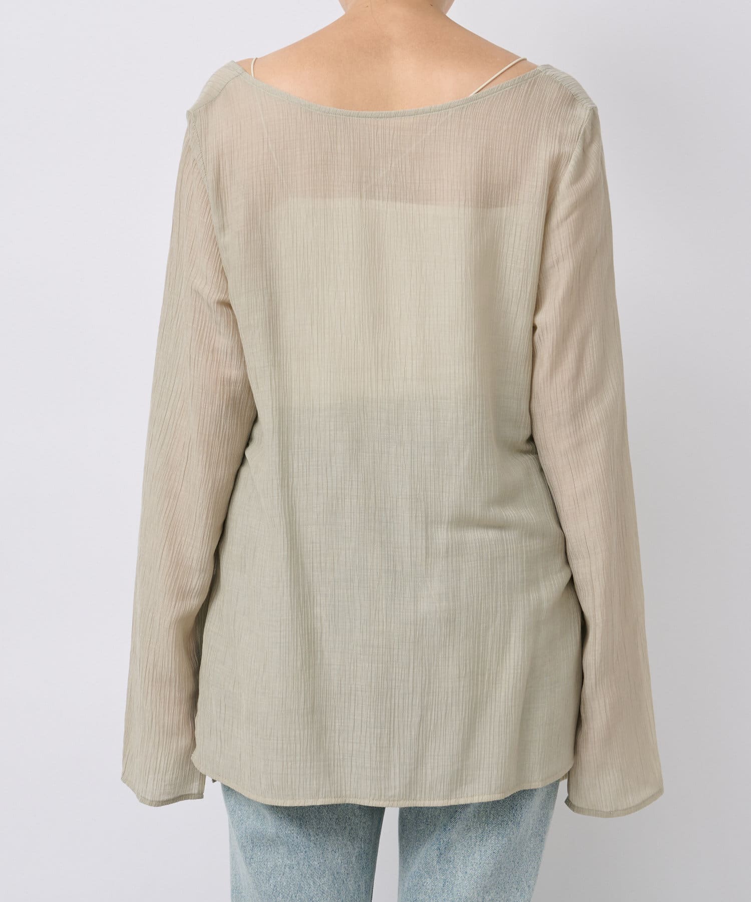 前後2WAYの仕様になっており、深めのUネックが女性らしい雰囲気に。さり気無い肌見せが叶うトップスです。