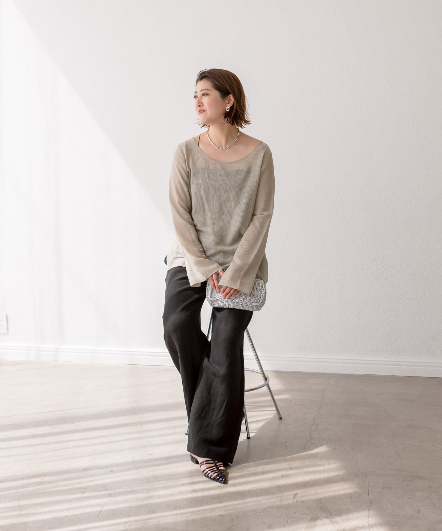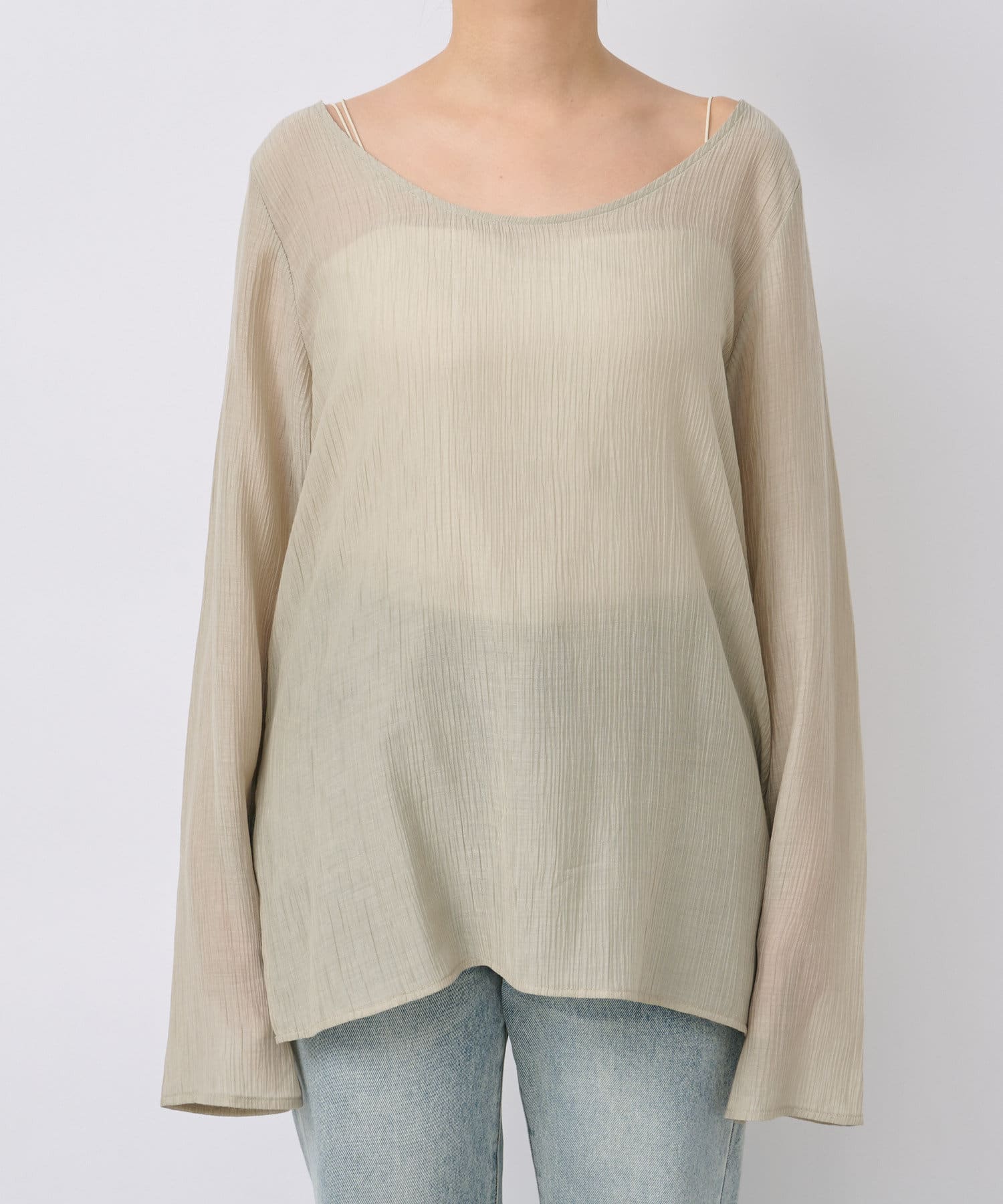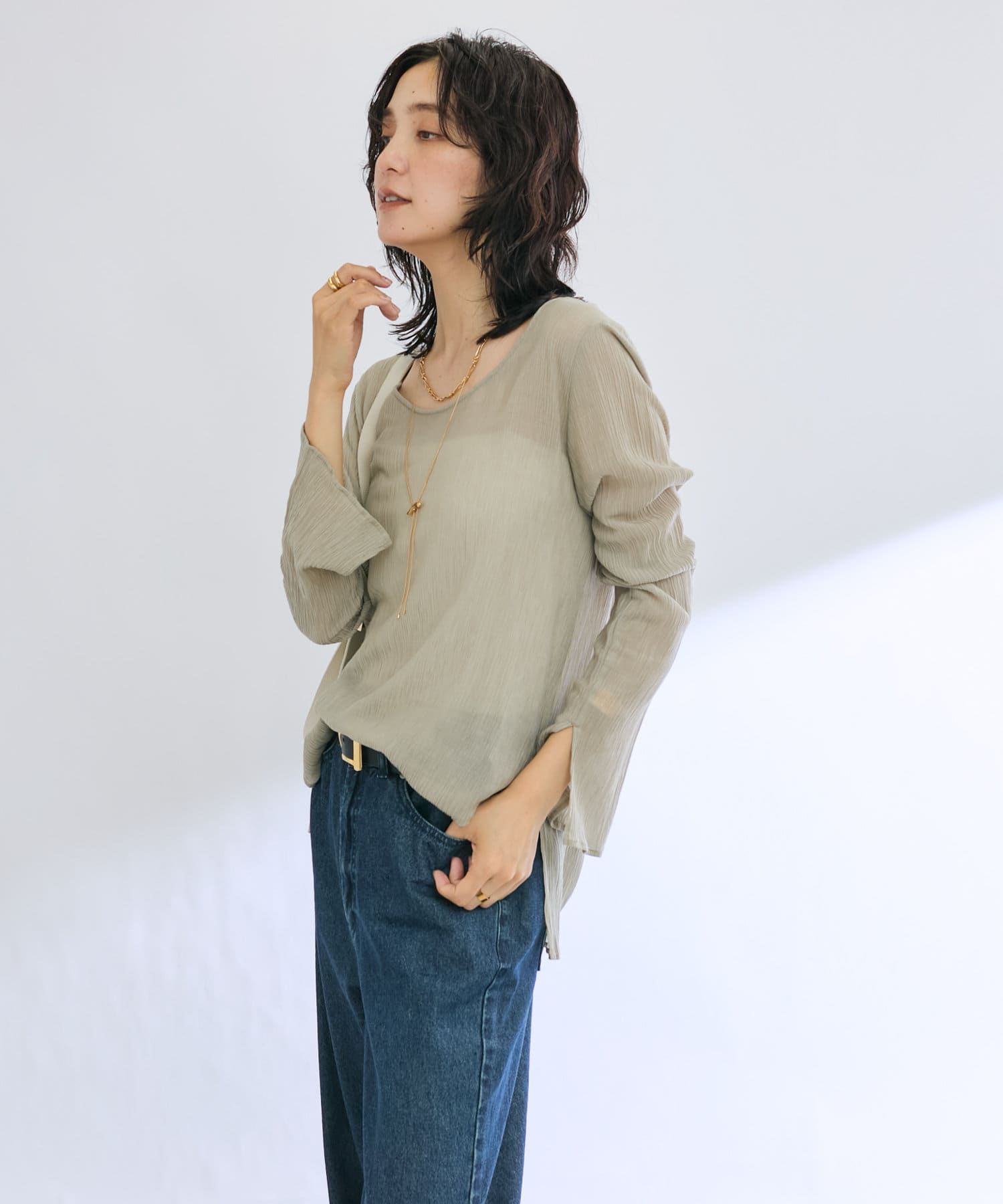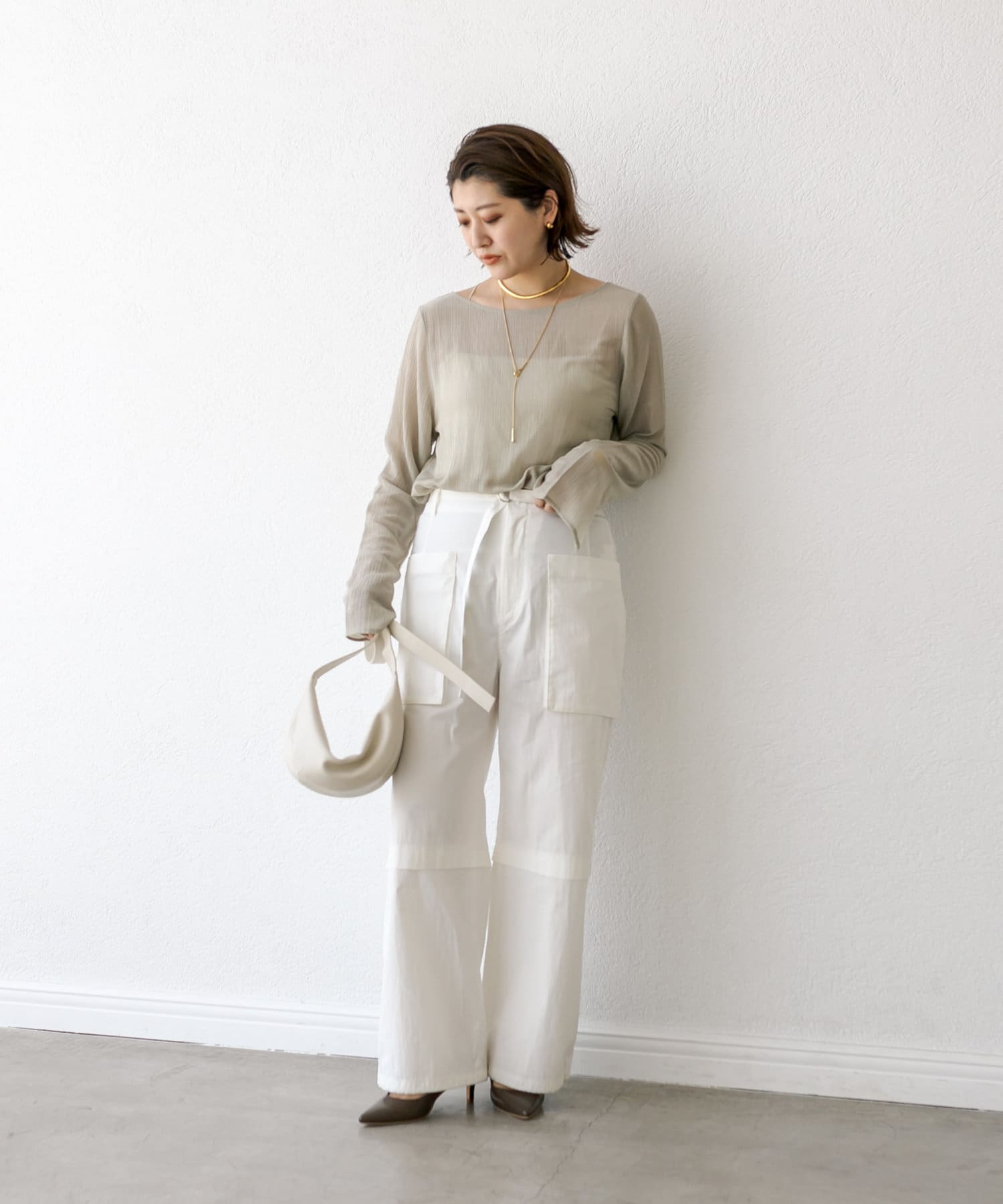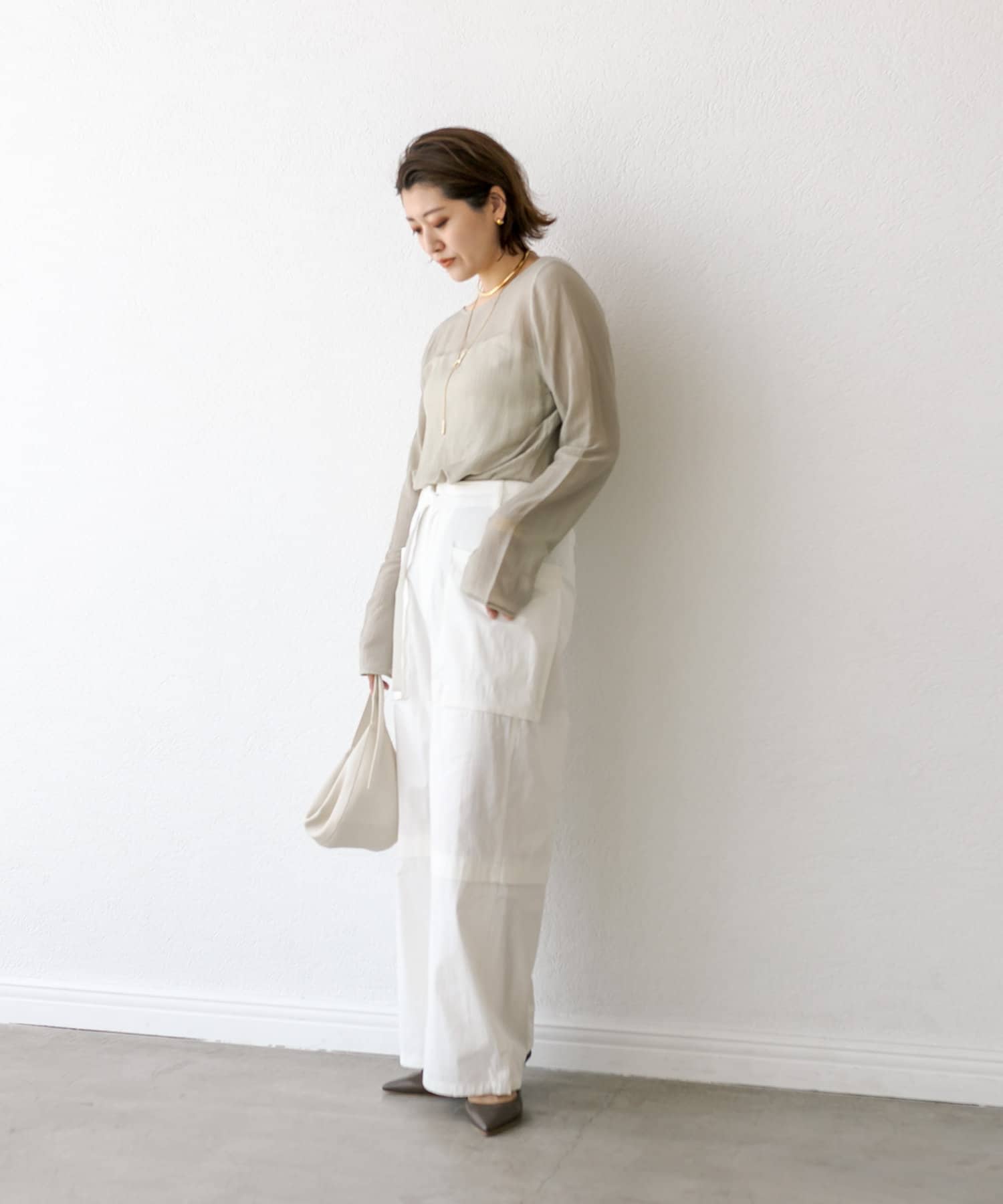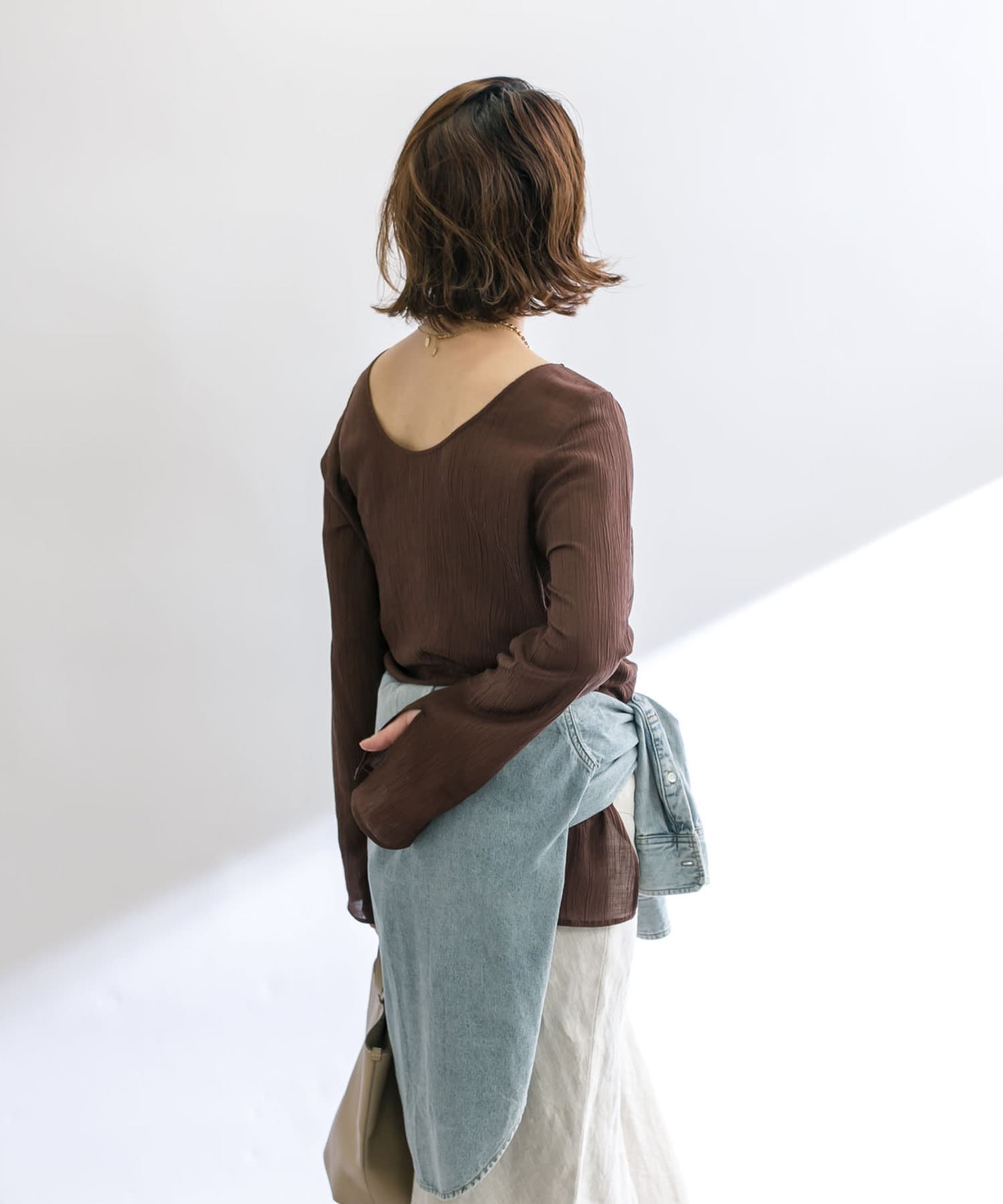 前後2WAYの仕様になっており、深めのUネックが女性らしい雰囲気に。さり気無い肌見せが叶うトップスです。