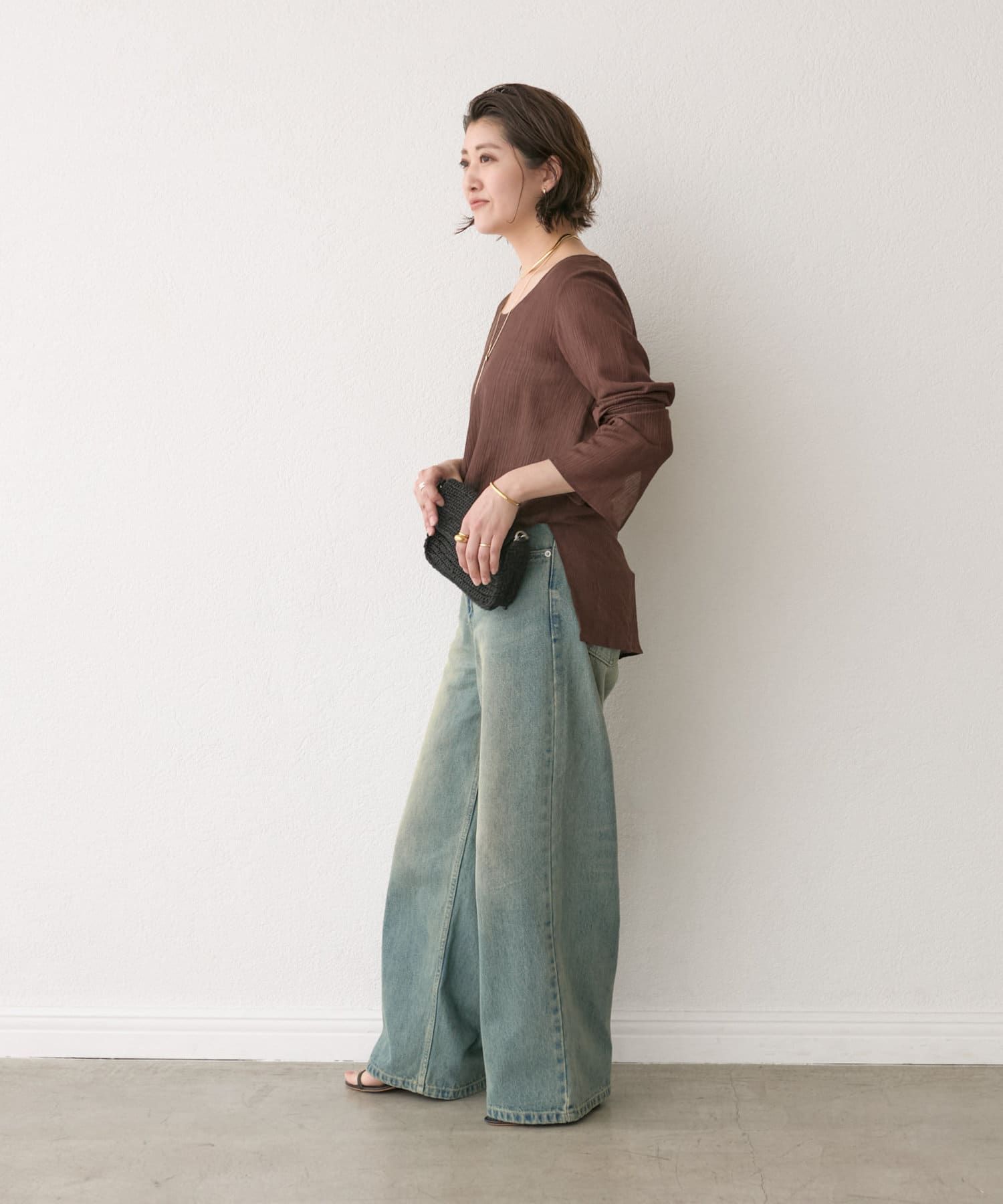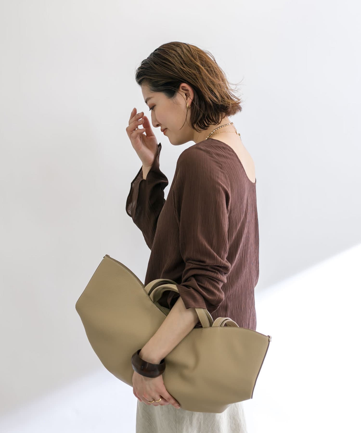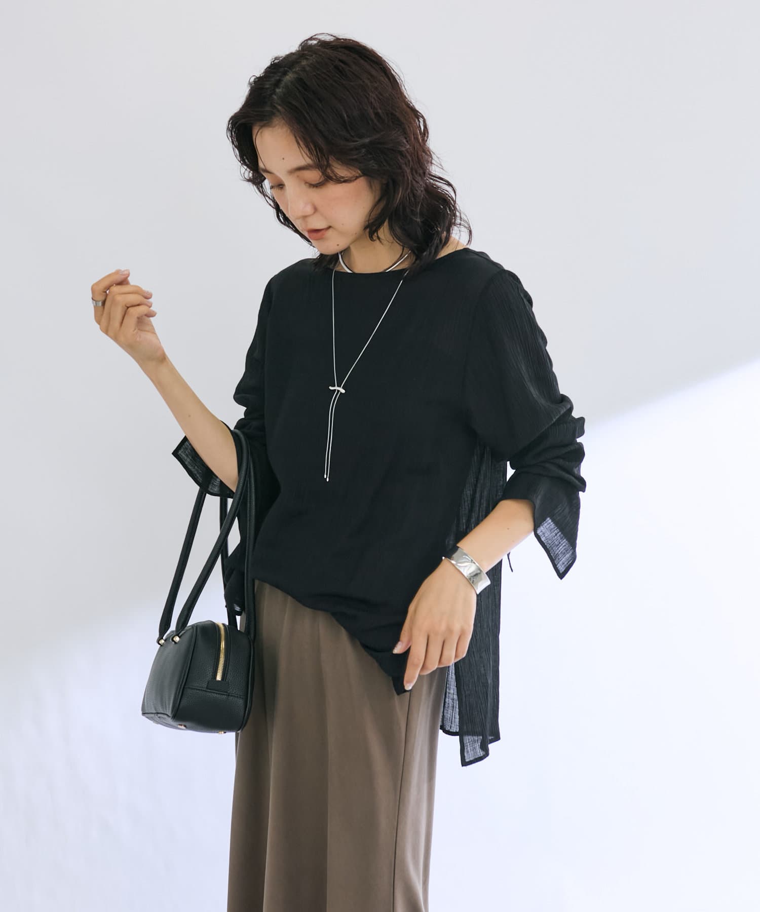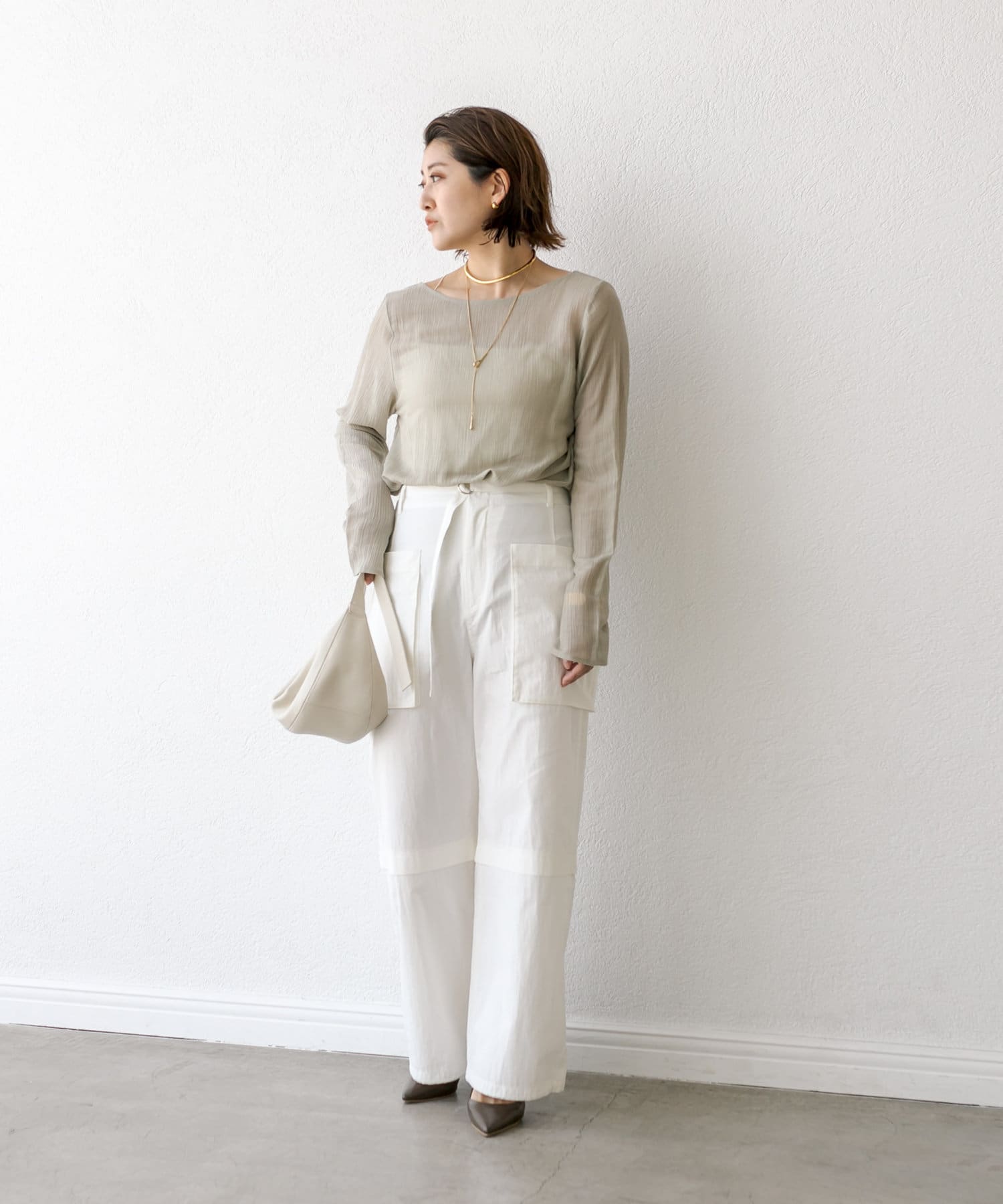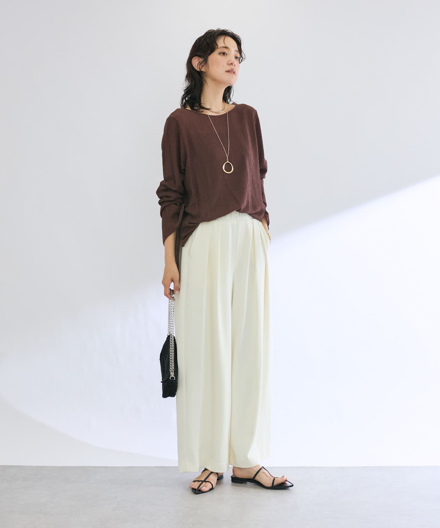 前後2WAYの仕様になっており、深めのUネックが女性らしい雰囲気に。さり気無い肌見せが叶うトップスです。