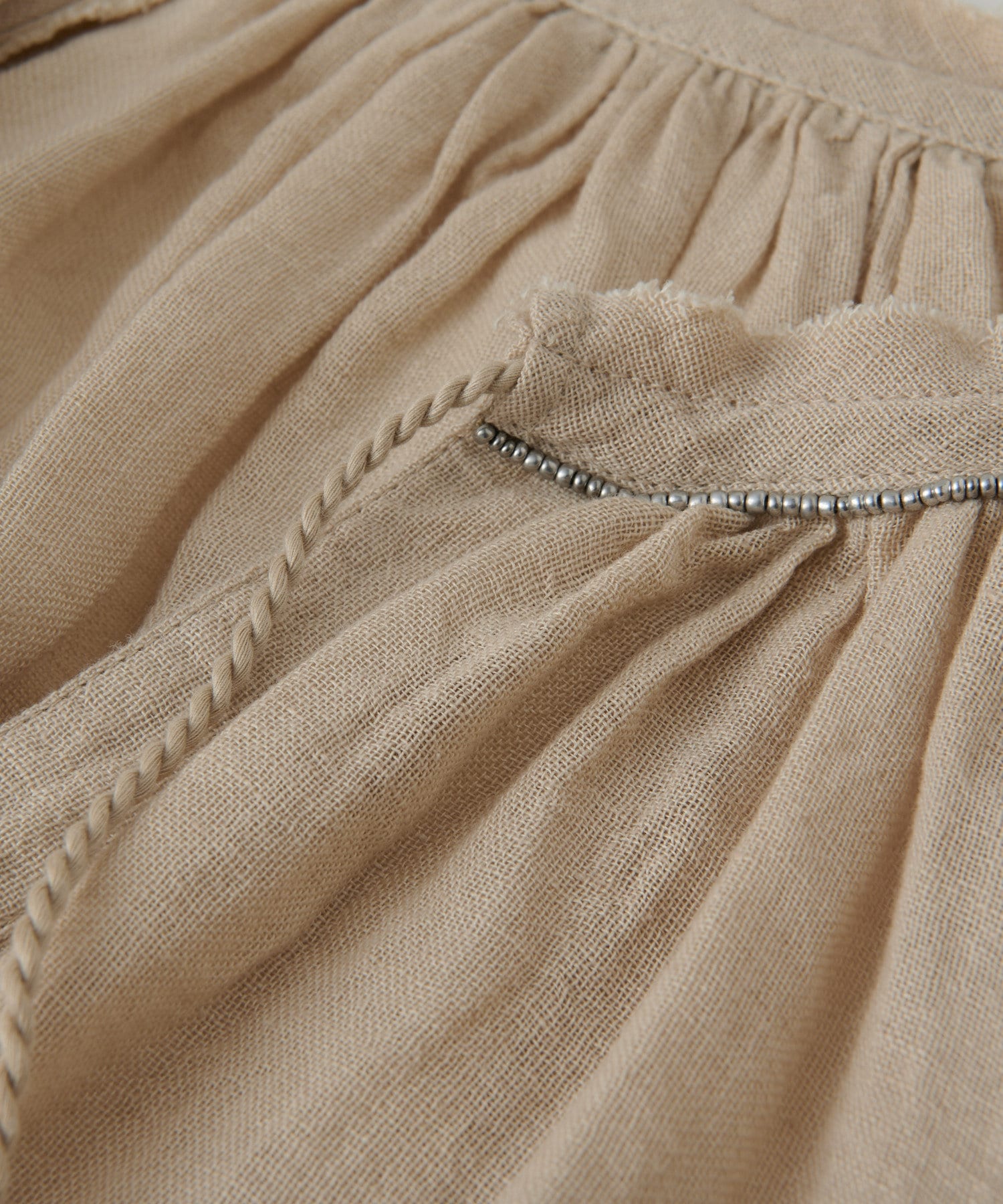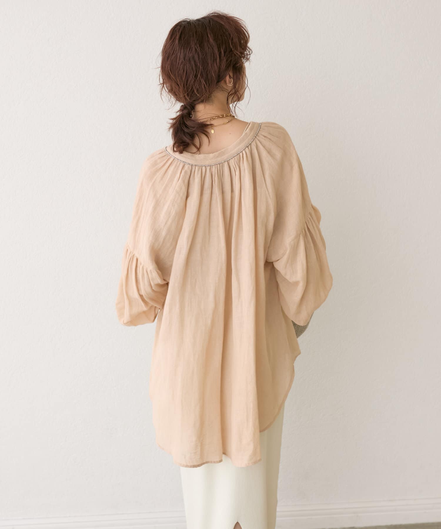 • たっぷりとしたボリューム感と衿のビーズ刺繍がポイントのリゾートムード高まる一枚