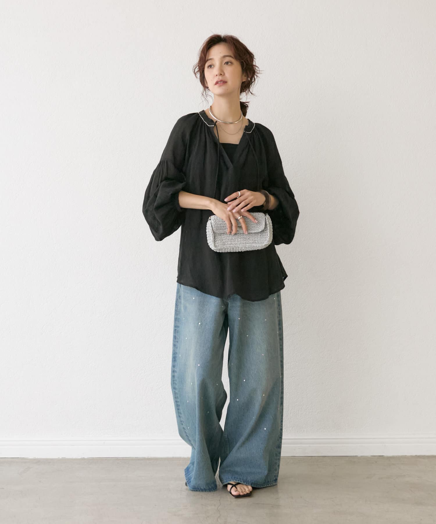 • ビジューデニムと合わせて、さりげなくキラキラする大人の遊び心のあるスタイリングがおすすめ