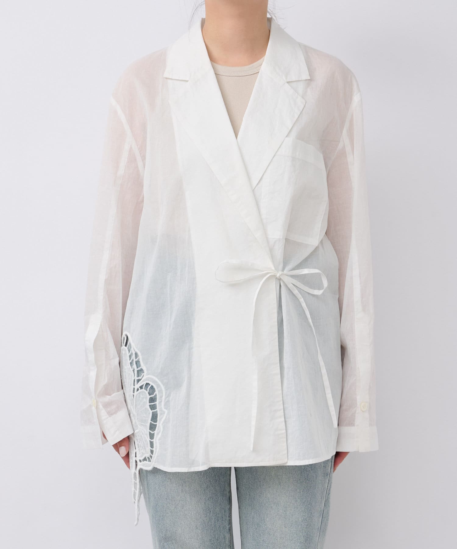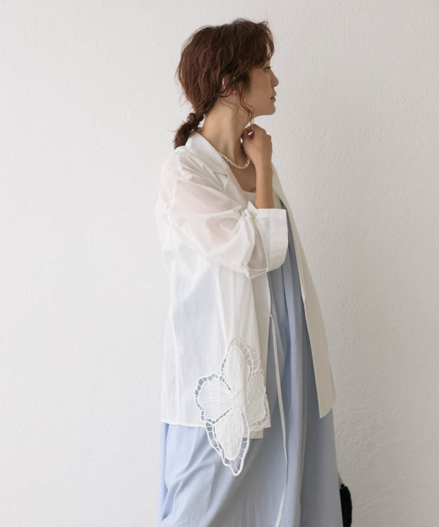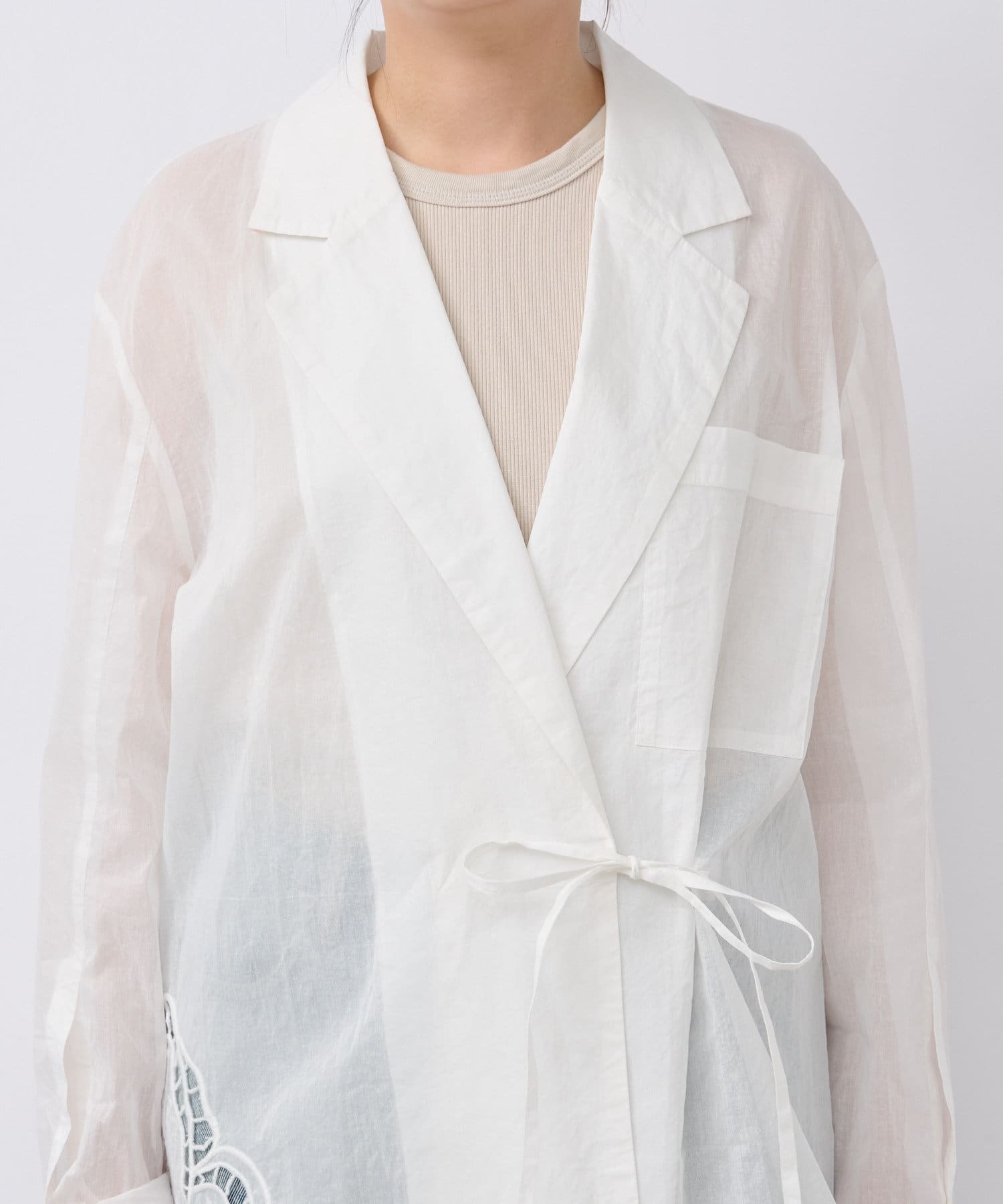 ペーパーライクな張り感のあるコットンオーガンジー素材を使用し、左裾にオリジナルのカットワーク刺繍を施したジャケットになります。