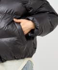スタンドネックのシンプルなデザインのダウンジャケット。
