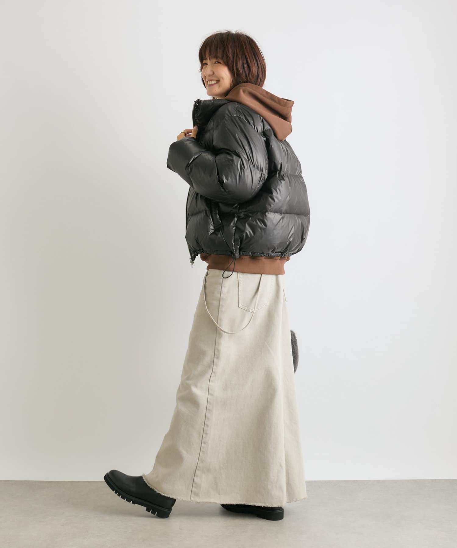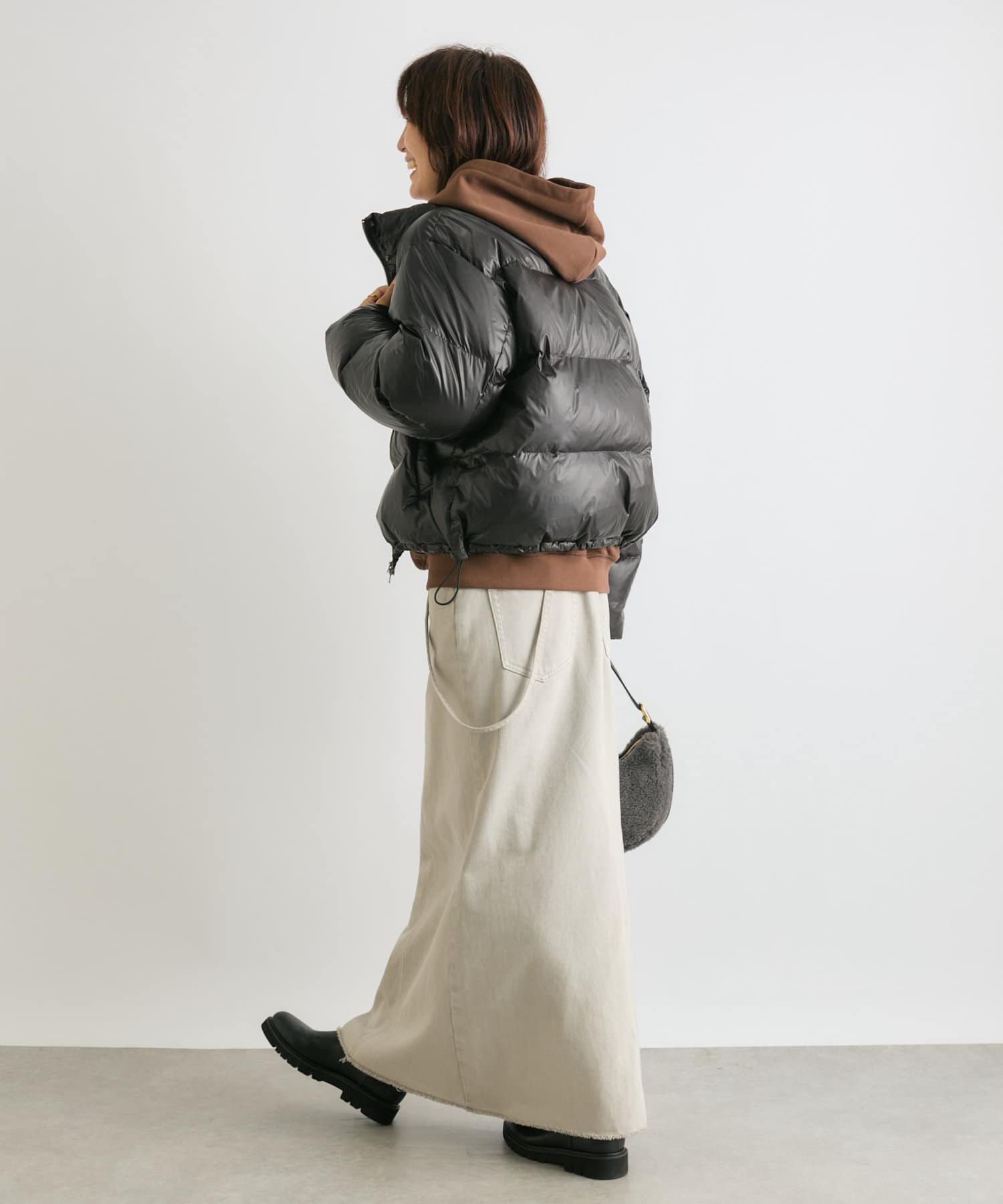 デニム等のカジュアルアイテムにも、キレイめスタイルをカジュアルダウンさせるのにもぴったりなダウンジャケットです。