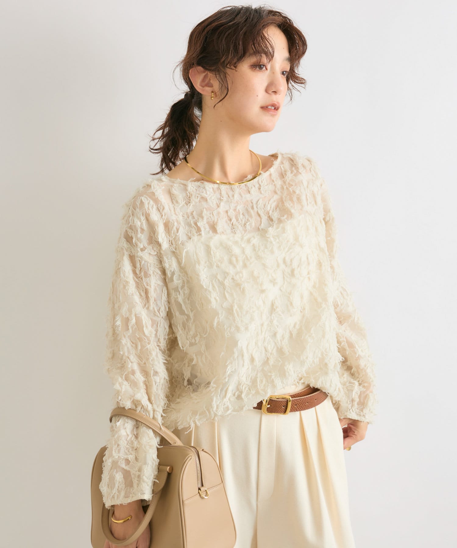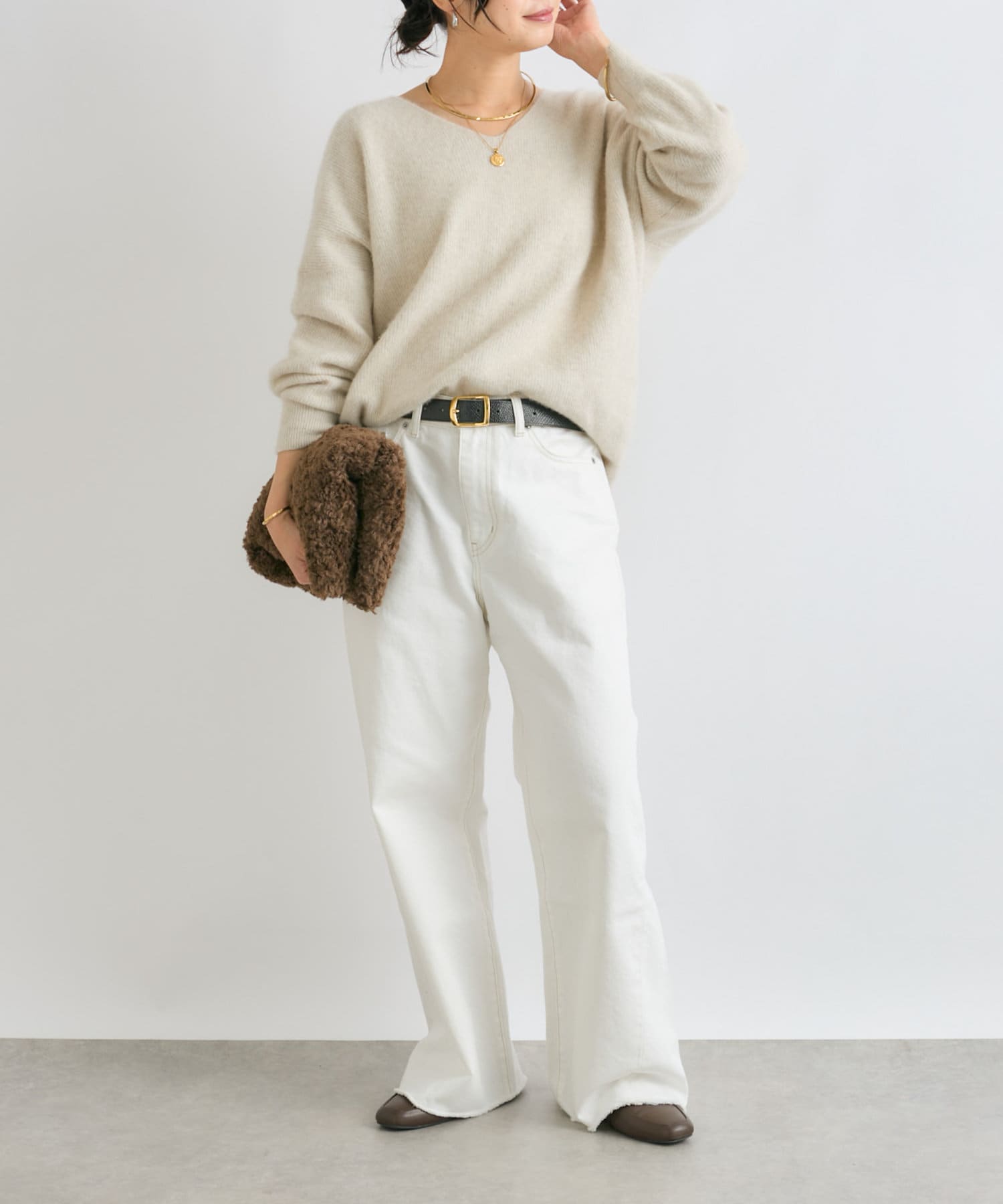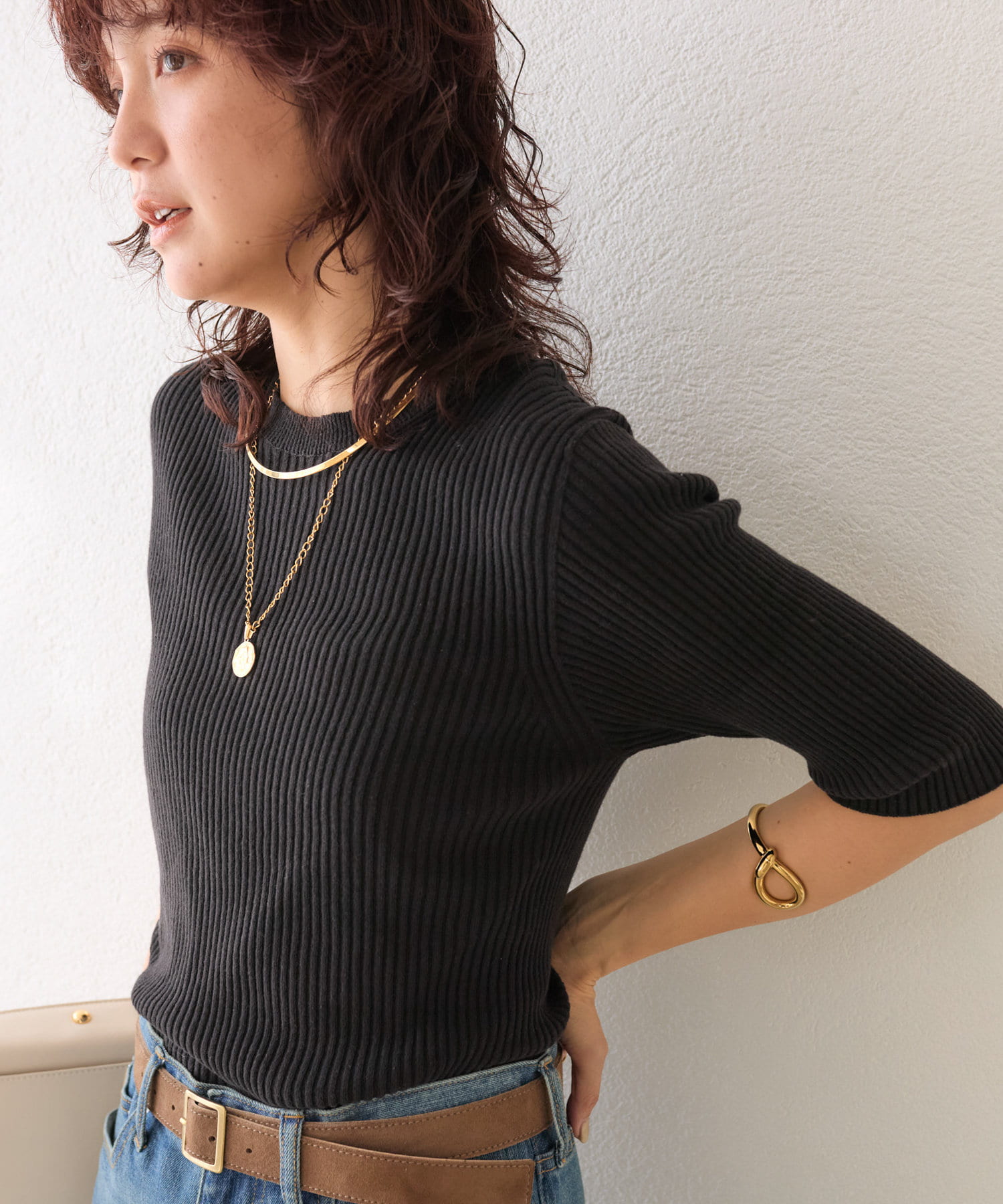 大きめの首回りでクルーネックのトップスと合わせても埋もれません。