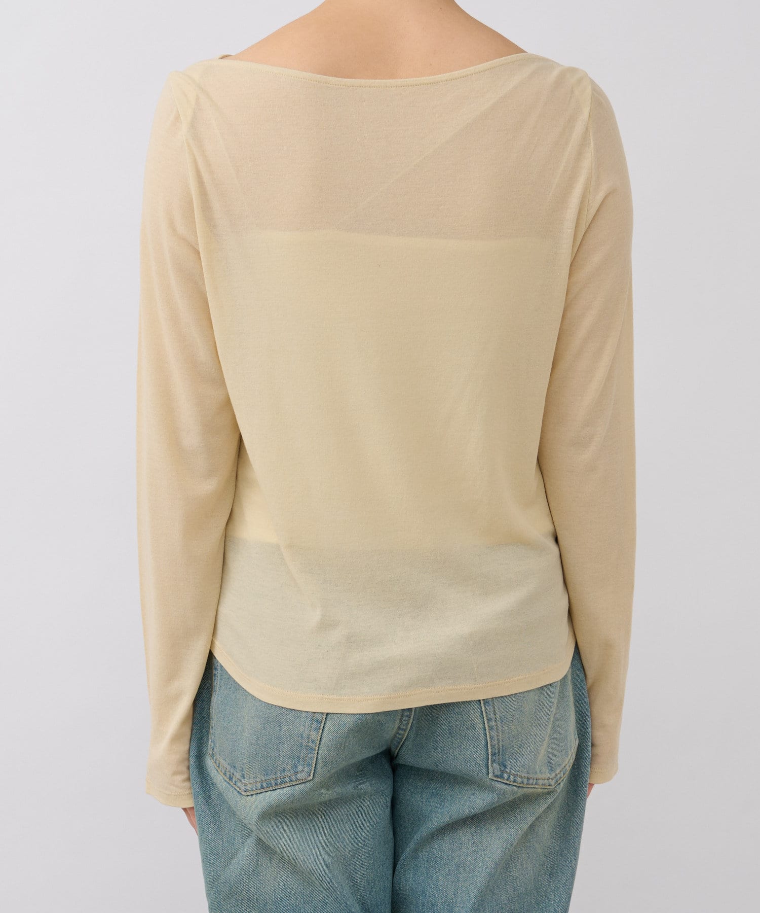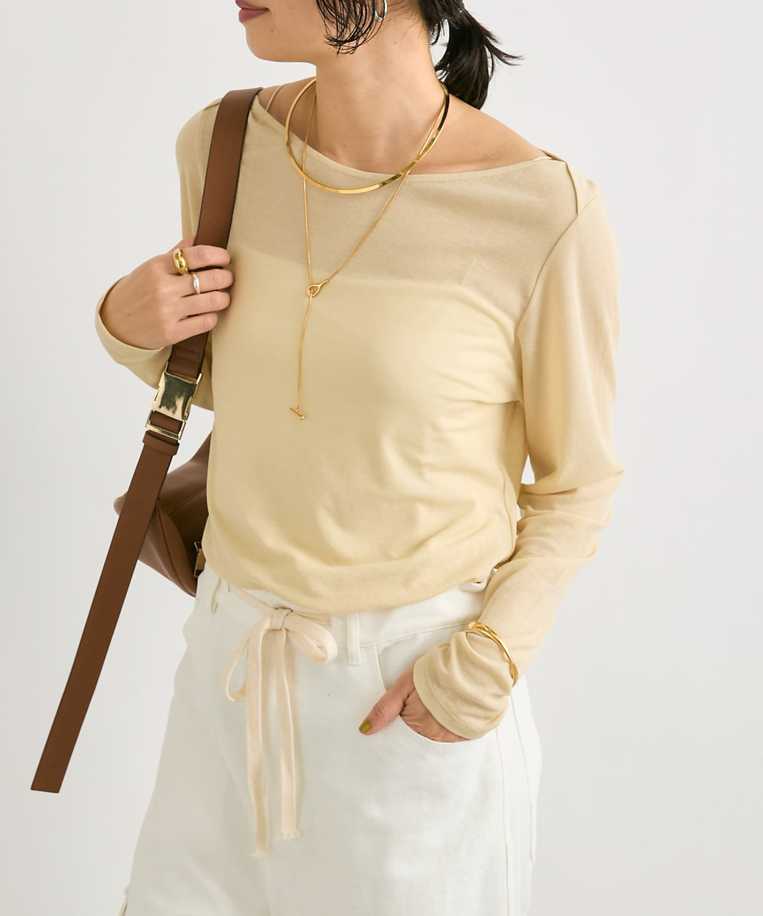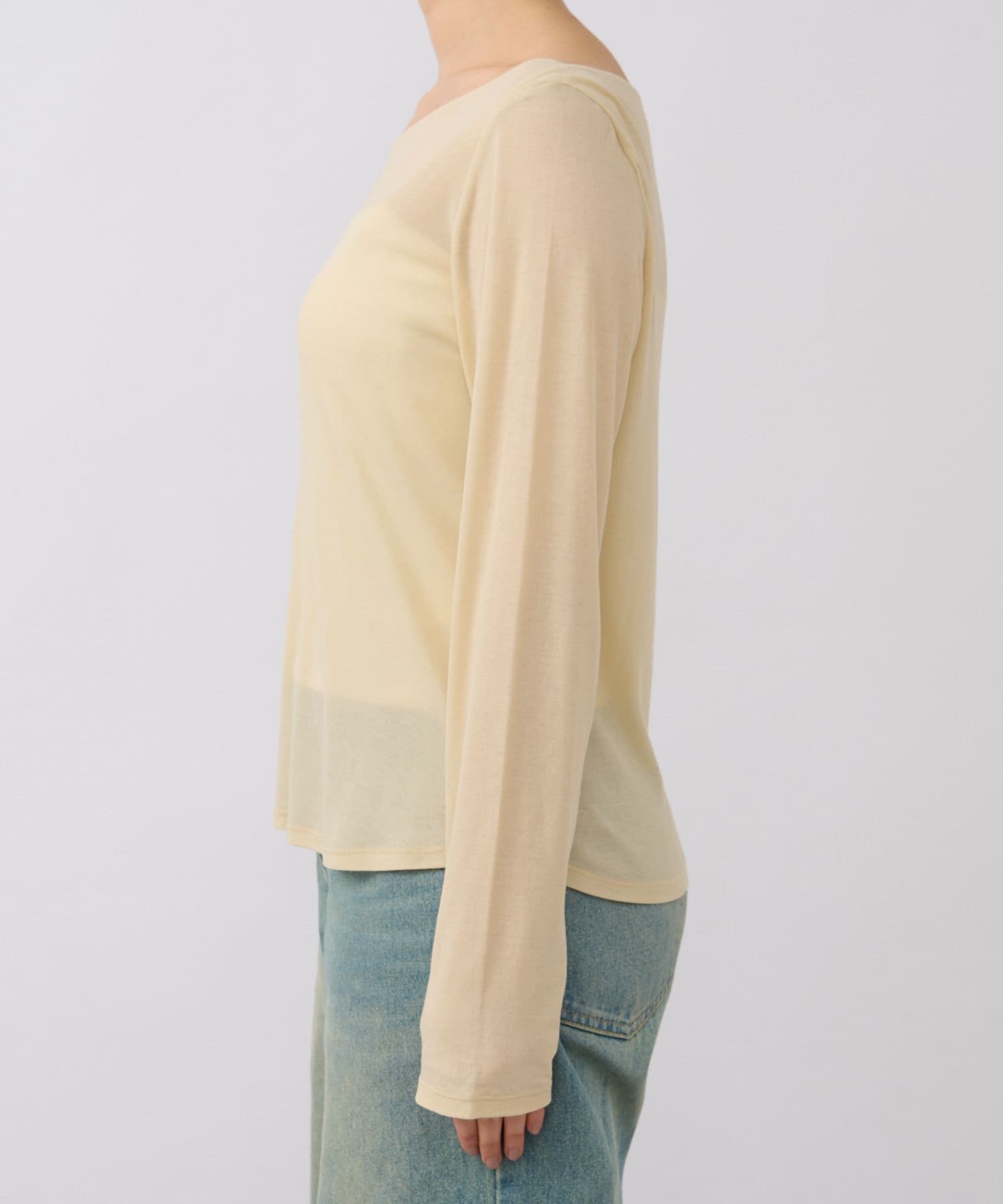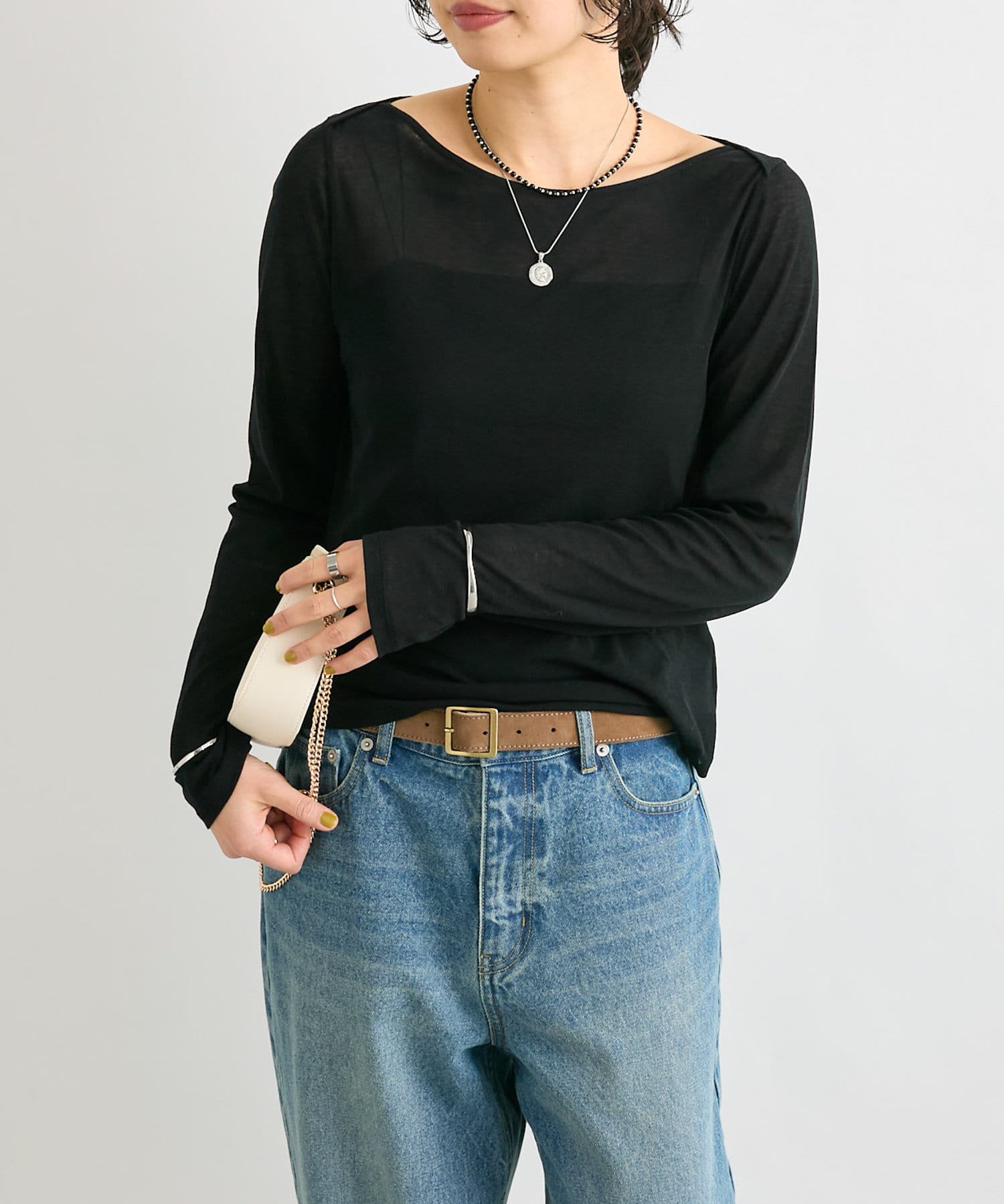 すっきりとしたボートネックデザインのシアー感あるロンTee。