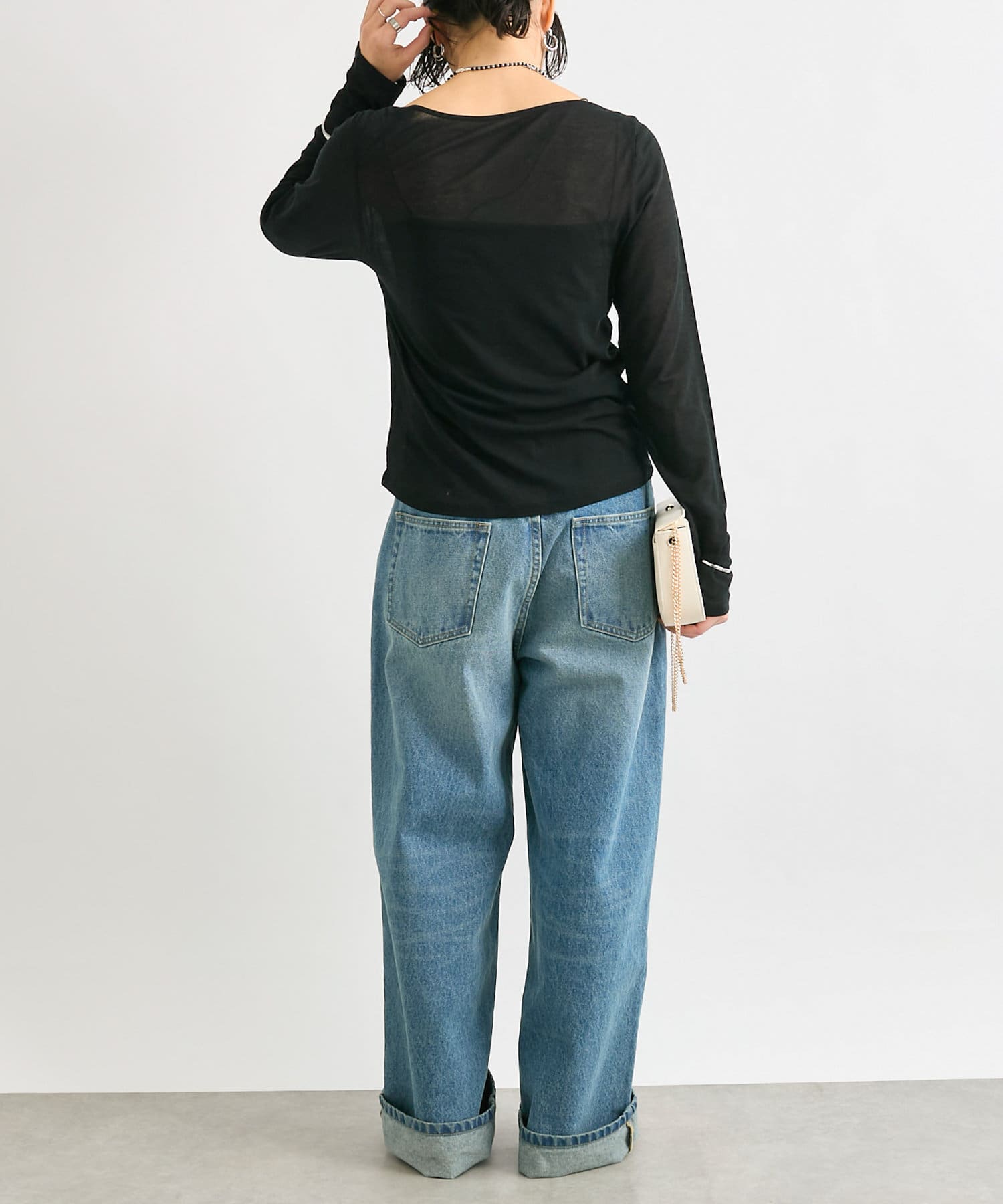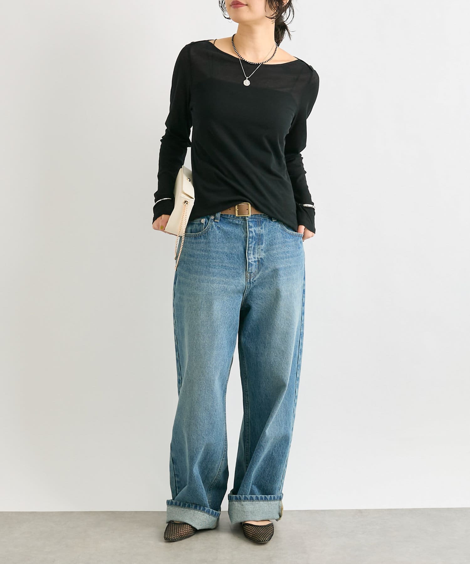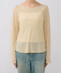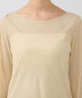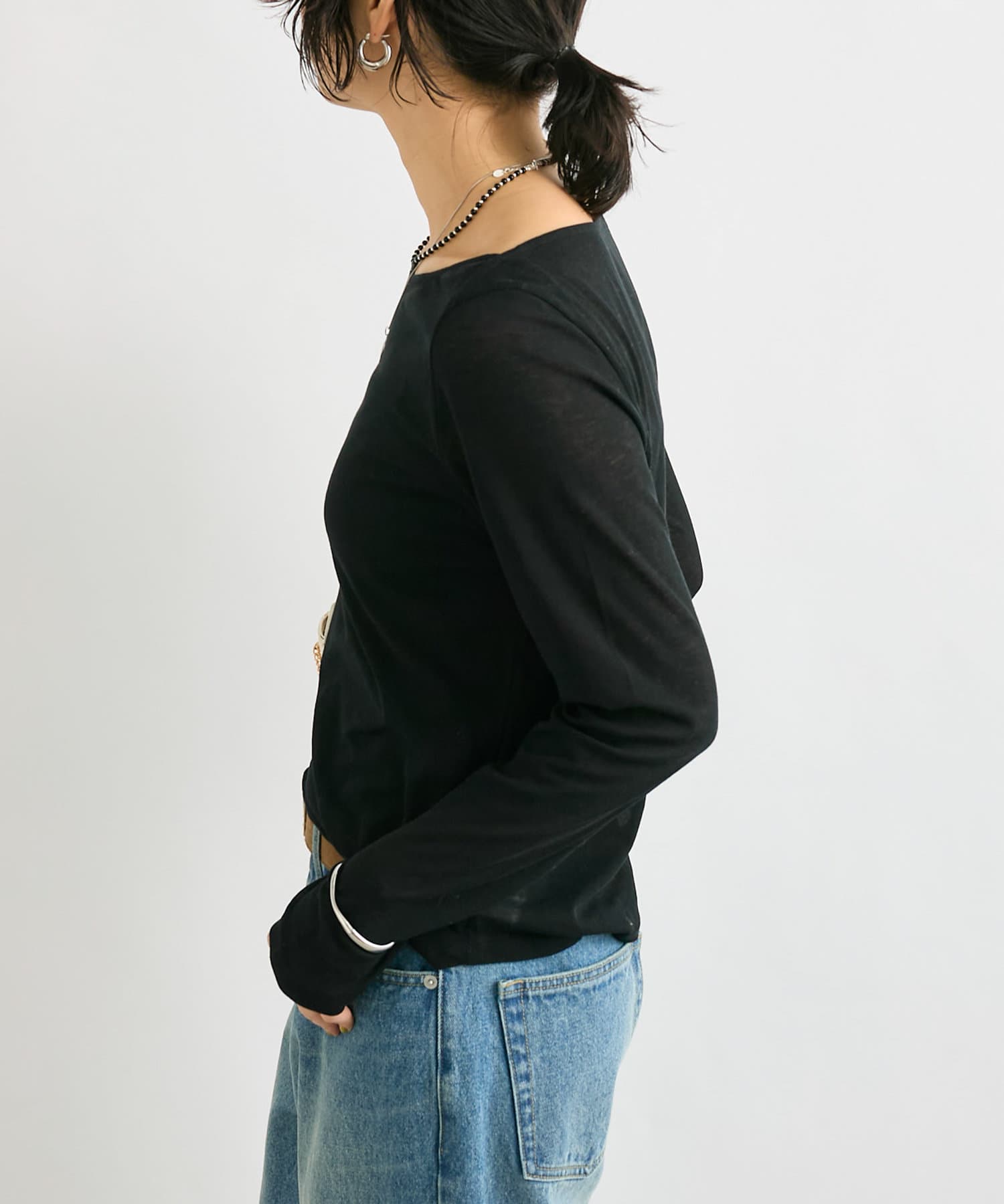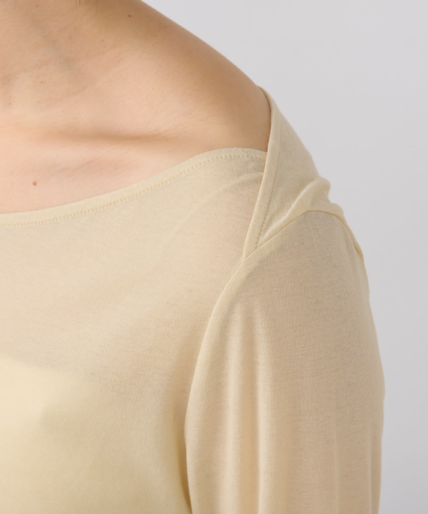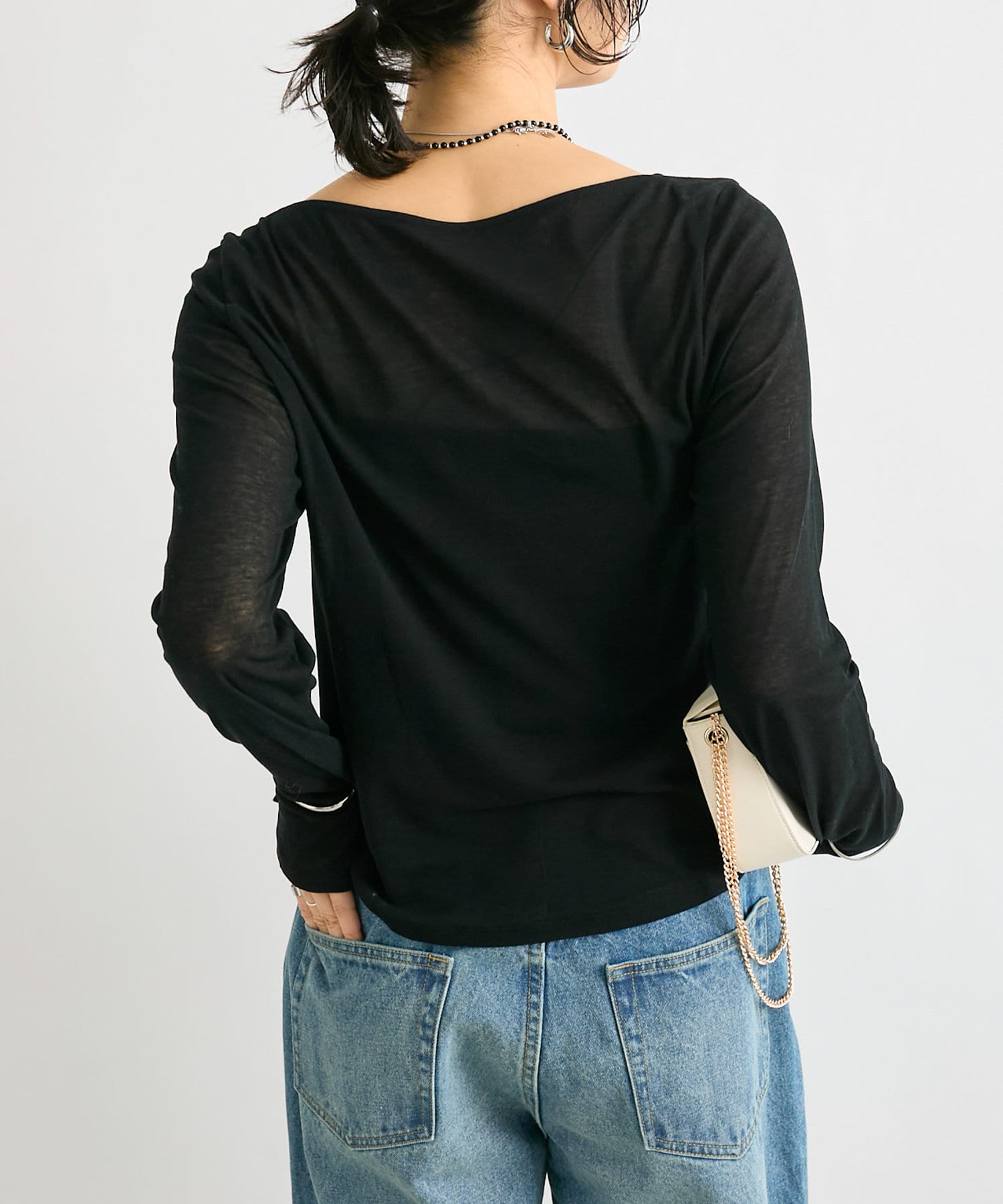 すっきりとしたボートネックデザインのシアー感あるロンTee。