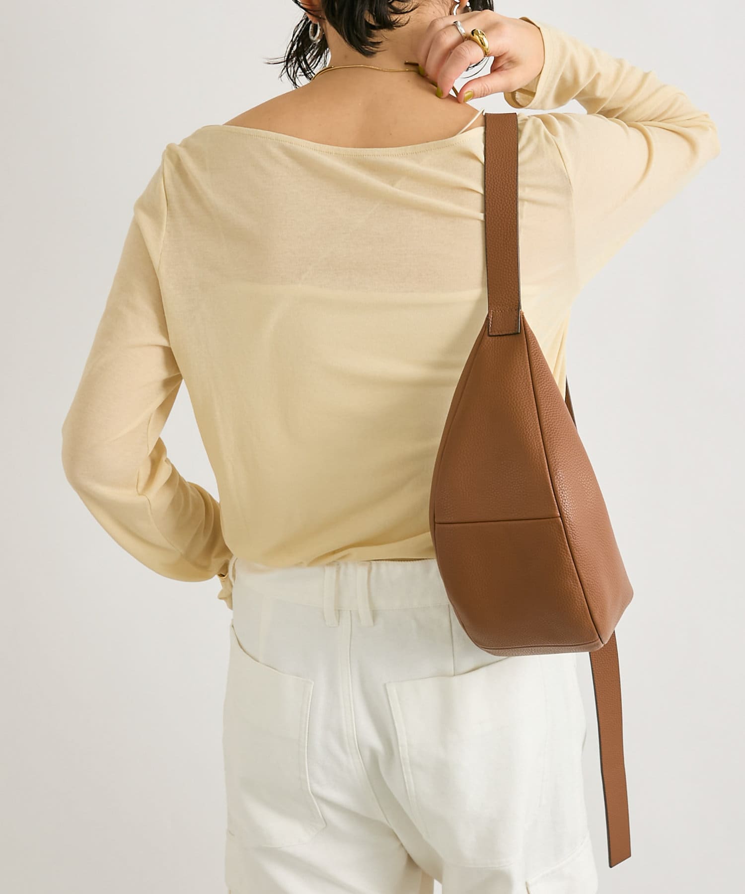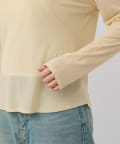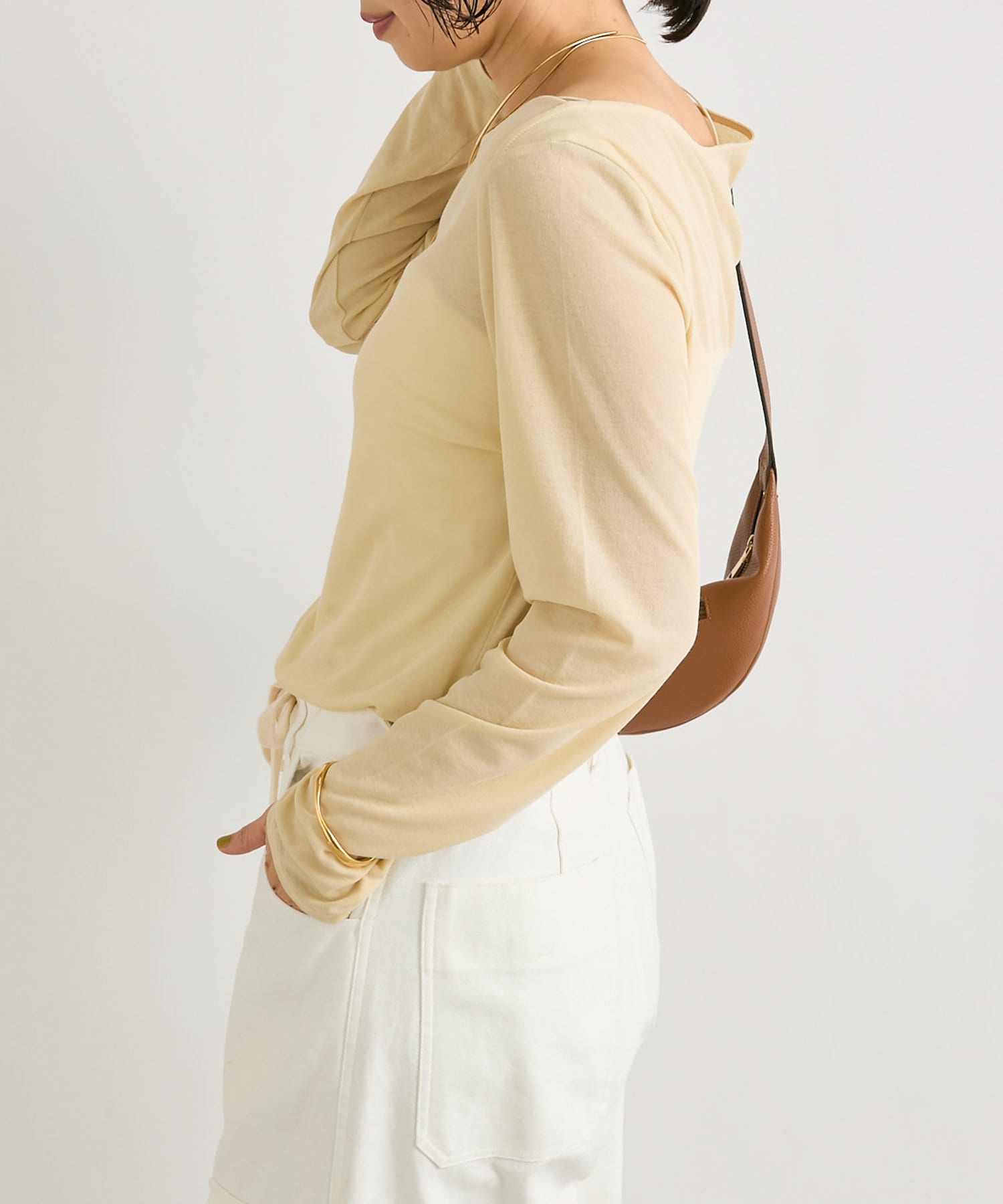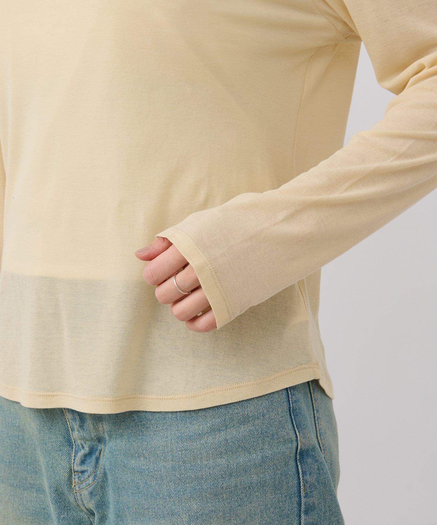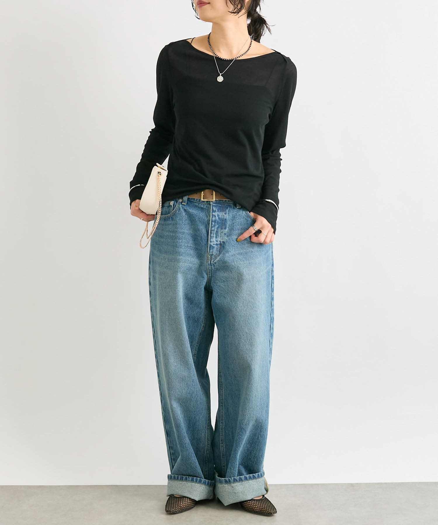 すっきりとしたボートネックデザインのシアー感あるロンTee。